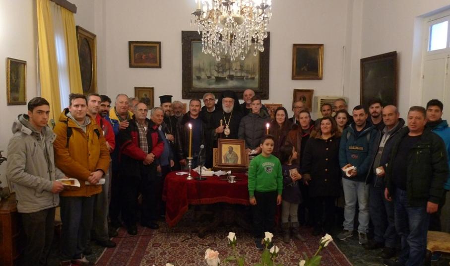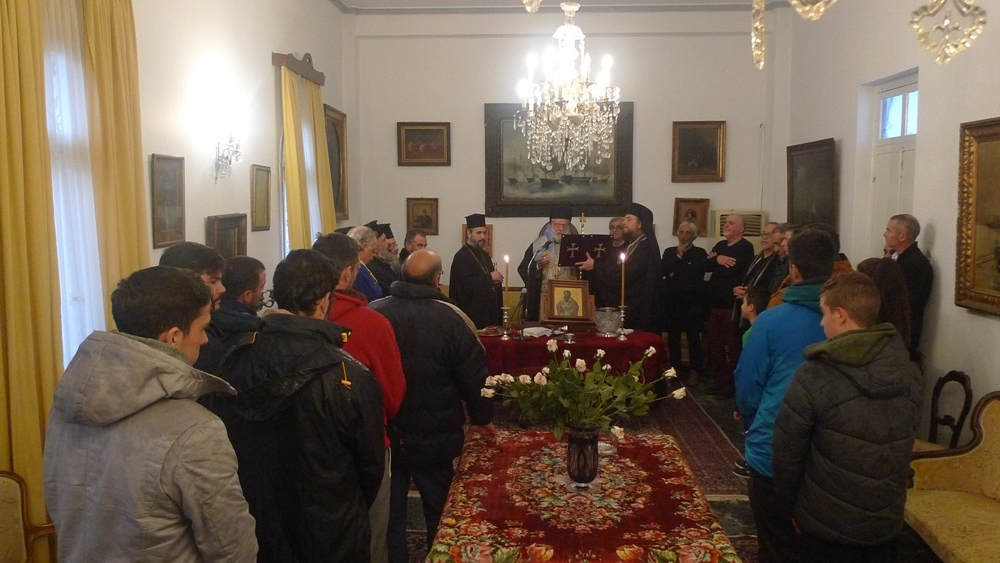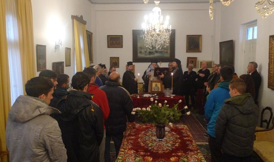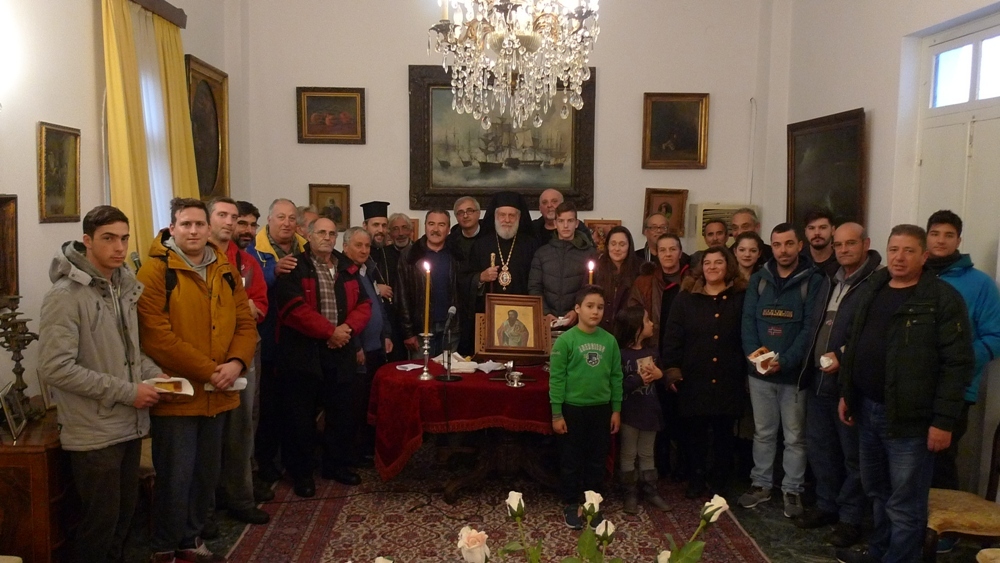 Αμέσως μετά την ευλογία της πίτας των υπαλλήλων, ο Σεβασμιώτατος υποδέχθηκε στην αίθουσα τελετών των Ιερού Ιδρύματος, τον Αρχιμουσικό και τα μέλη της Φιλαρμονικής, παρουσία και του Αρχιερατικού Επιτρόπου, των Ιερέων και των μελών της Διοικούσης Επιτροπής.
