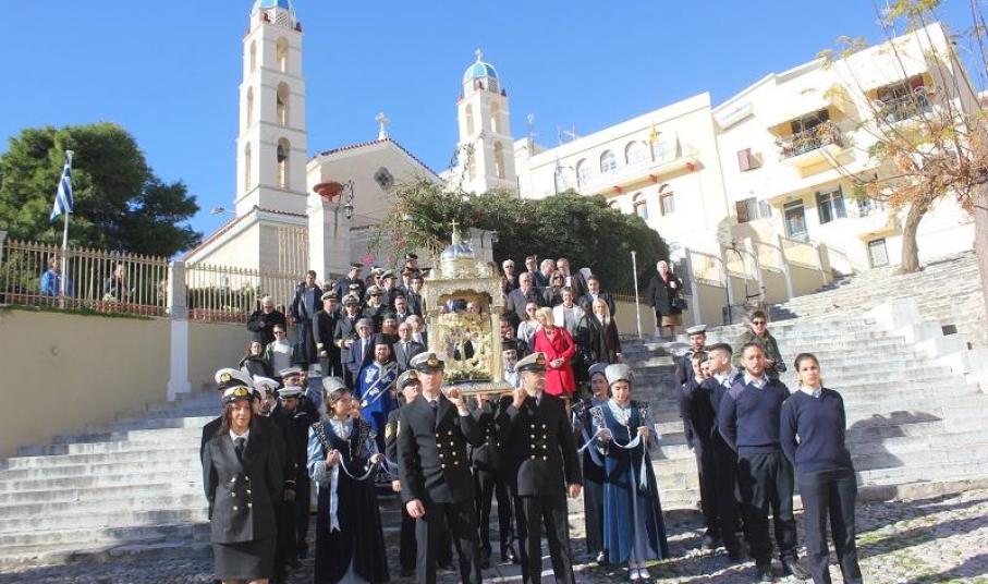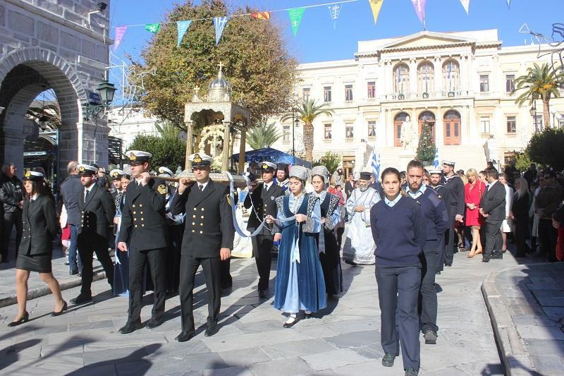 Το «παρών» έδωσαν ο Περιφερειάρχης Νοτίου Αιγαίου, Γιώργος Χατζημάρκος, ο Δήμαρχος Σύρου – Ερμούπολης, ο Χωρικός Αντιπεριφερειάρχης Κυκλάδων, μέλη της τοπικής αυτοδιοίκησης, εκπρόσωποι των σωμάτων ασφαλείας και του στρατού, και του Λιμενικού Σώματος, Δικαστικοί και Εκπαιδευτικοί Λειτουργοί, ο Διοικητής της Ακαδημίας Εμπορικού Ναυτικού και σπουδαστές, άγημα της Πολεμικής Ναυτικής Βάσης Σύρου, νέοι του Λυκείου Ελληνίδων, Πρόσκοποι και πλήθος πιστών.
