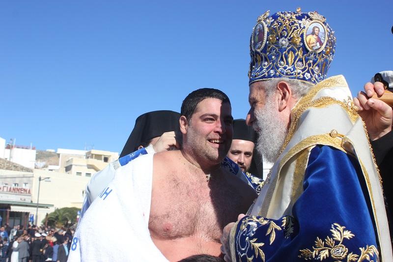 Τον Τίμιο Σταυρό, υπό τα χειροκροτήματα των παρισταμένων, τους εορταστικούς ελιγμούς των μόλις καταπλευσάντων επιβατικών πλοίων “FAST FERRY ANDROS” και “SUPER FERRY II”, τους πανηγυρικούς συριγμούς των πλοίων και των σκαφών του Λ.Σ., του ΝΟΣ και των Επαγγελματιών και Ερασιτεχνών Αλιέων και τις χαρμόσυνες κωδωνοκρουσίες των Ναών της πόλης, ανέσυρε από την θάλασσα ο Φαρμακοποιός Ιωάννης Μακρυθανάσης , προς τον οποίο ο Σεβασμιώτατος προσέφερε χρυσό επιστήθιο Σταυρό. Ο ίδιος μάλιστα ευχαρίστησε όλους τους κολυμβητές, οι οποίοι, ακολουθώντας το έθιμο, βούτηξαν στα παγωμένα νερά για να ανασύρουν τον Σταυρό και να λάβουν την ευλογία του, συγχαίροντας ιδιαίτερα την τολμηρή γυναίκα για το θάρρος της.