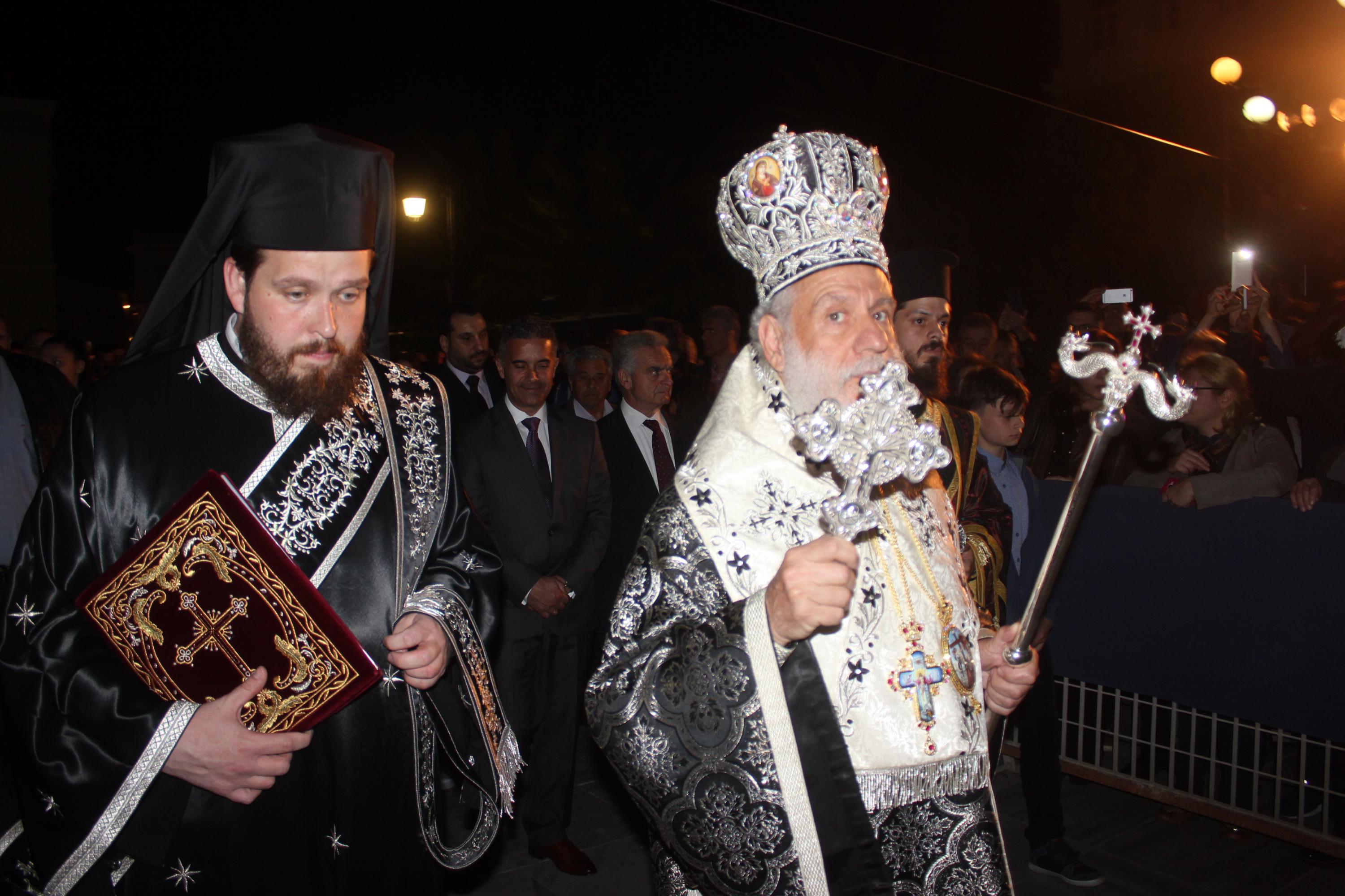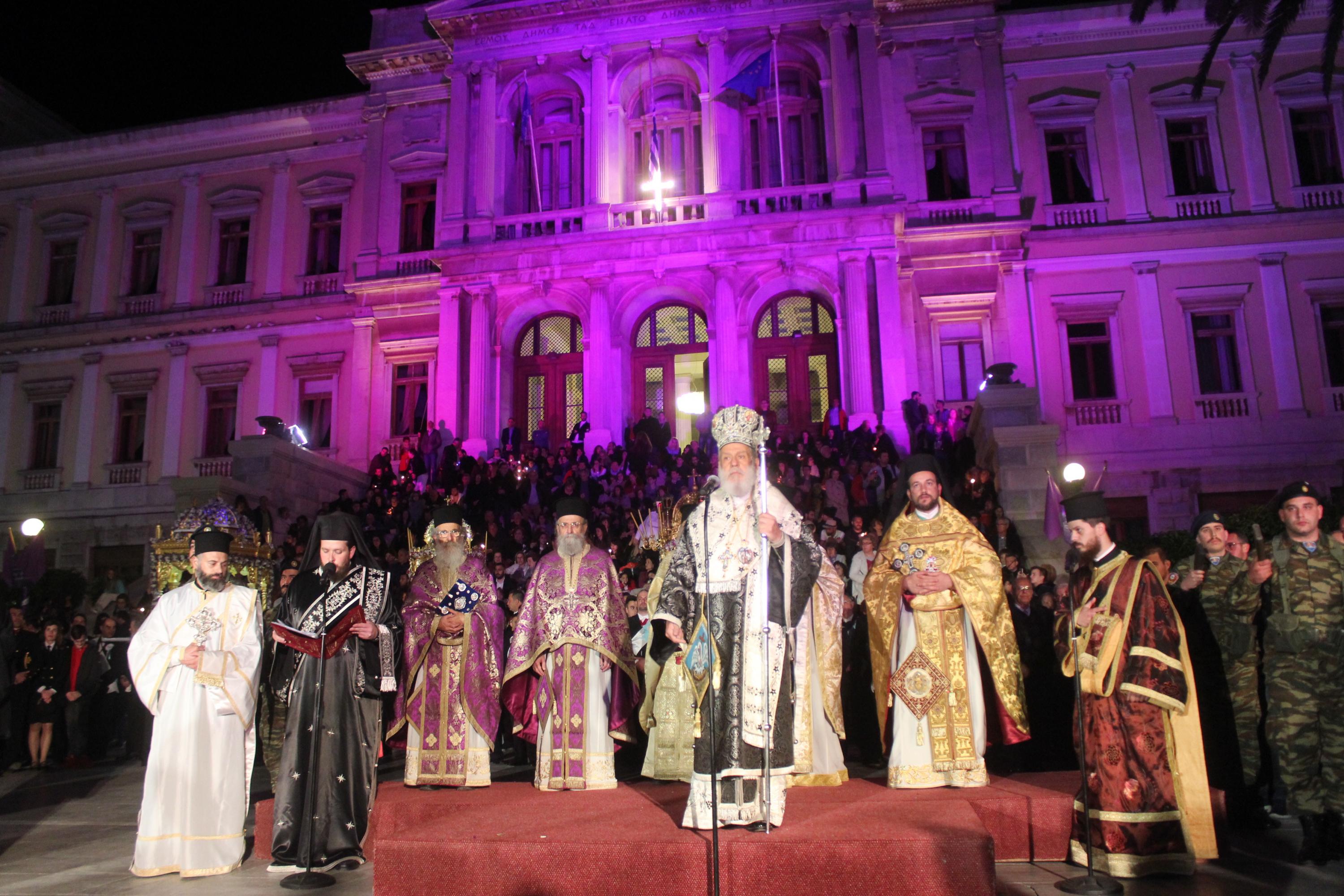 Το βράδυ της Μεγάλης Παρασκευής, ο Μητροπολίτης Σύρου προέστη της Ακολουθίας του Επιταφίου Θρήνου στον Ιερό Μητροπολιτικό Ναό της Μεταμορφώσεως του Σωτήρος και ακολούθως ετέθη επικεφαλής της λιτανευτικής πομπής του ιερού Επιταφίου προς την ιστορική Πλατεία Μιαούλη Ερμουπόλεως.