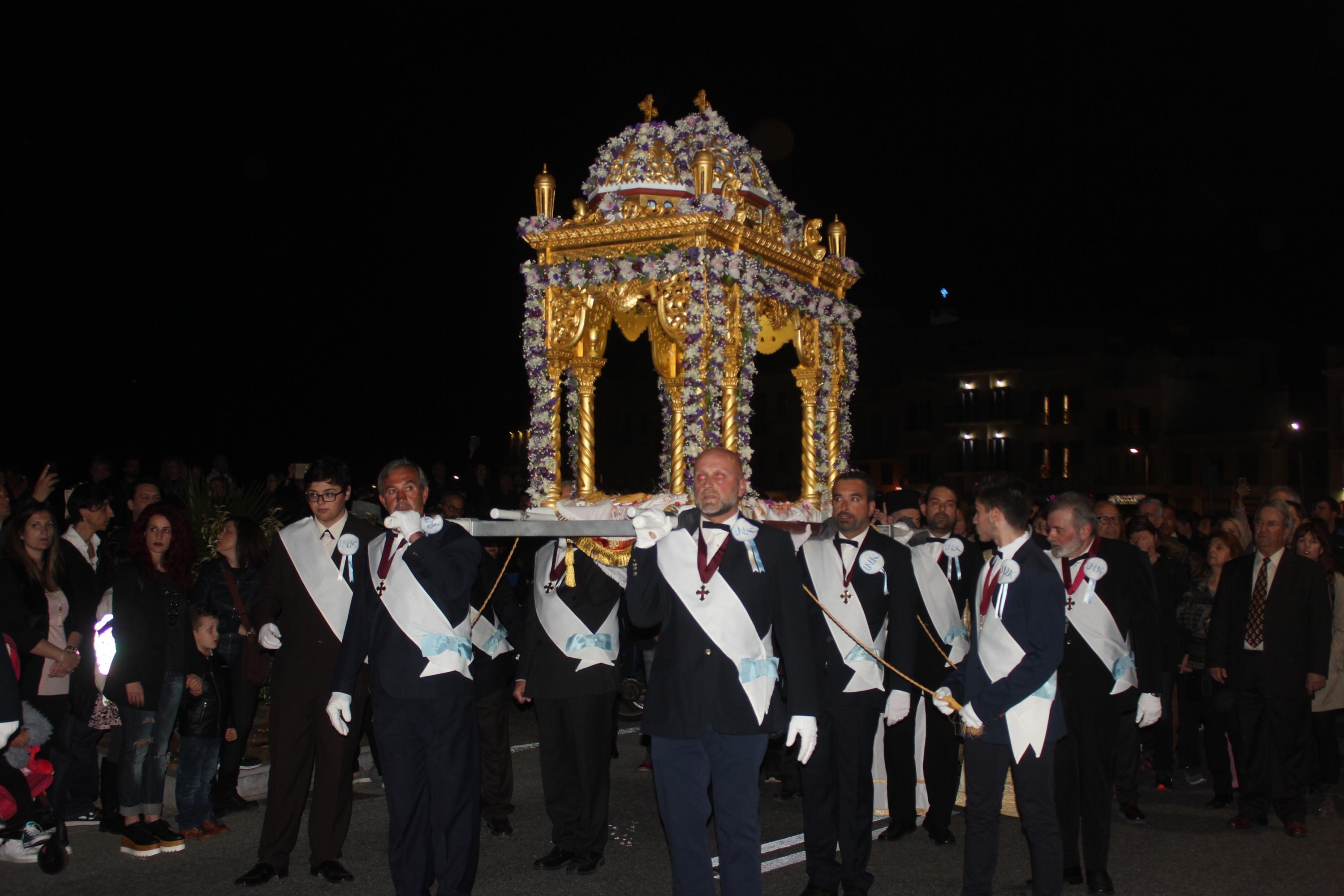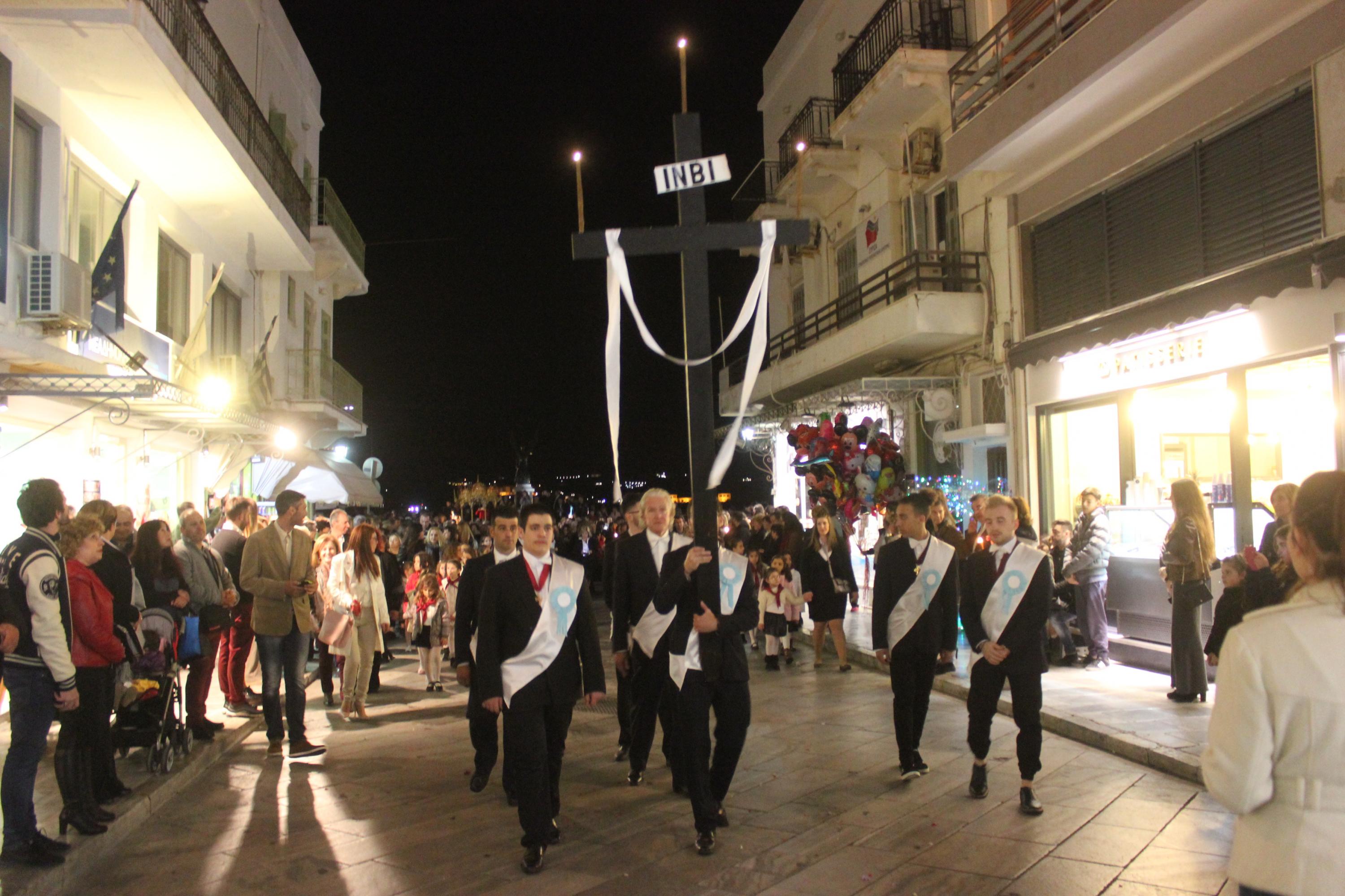 Έμπροσθεν του περίλαμπρου και εντυπωσιακά φωταγωγημένου Δημοτικού Μεγάρου, του «Παρθενώνα των Δημαρχείων της Ελλάδος», όπως το χαρακτήρισε, πραγματοποιήθηκε η κατά το έθος συνάντηση των επιταφίων των Επιταφίων των Ιερών Ναών Μεταμορφώσεως του Σωτήρως, Κοιμήσεως της Θεοτόκου και Αγίου Νικολάου, παρουσία της Γενικής Γραμματέως Αθλητισμού, του Βουλευτή Κυκλάδων Αντώνη Συρίγου, εκπροσώπων της τοπικής αυτοδιοίκησης, του στρατού και των σωμάτων ασφαλείας, δικαστικών λειτουργών και πλήθους πιστών.