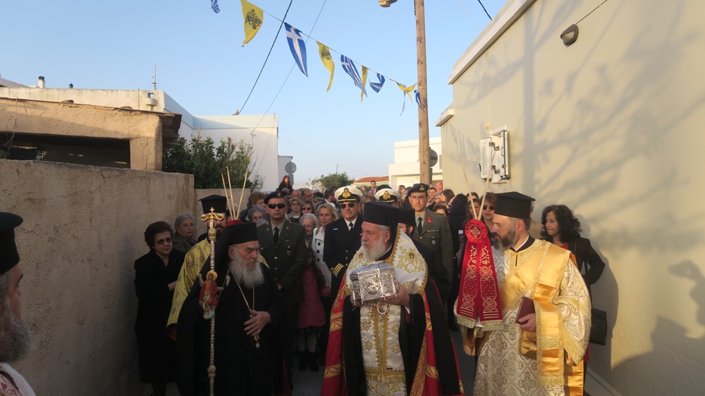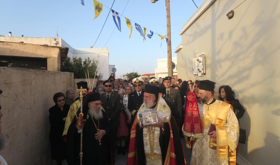 Στη συνέχεια, η τιμία Κάρα, την οποία διεκόμισε από την Ιερά Μονή Παναχράντου Άνδρου ο Ηγούμενος Αρχιμ. Ευδόκιμος Φραγκουλάκης, μετά του Διακόνου Ευδοκίμου, μετεφέρθη με λιτανευτική πομπή στον Ιερό Ναό της Αναστάσεως, επί κεφαλής έχουσα τον Σεβασμιώτατο κ. Δωρόθεο Β' και τον ιερό Κλήρο, με τη συμμετοχή του Αντιδημάρχου κ. Αλέξ. Αθανασίου, της Προέδρου της Τοπικής Κοινότητας Ερμούπολης κας Ανθής Χαλκιά, της Προέδρου του Δημοτικού Συμβουλίου Τήνου κας Αλοιμόνου, Δημοτικών Συμβούλων, του Διοικητού της 90 ΜΕ, του Υποδιοικητού και Αξιωματικών της Ναυτικής Βάσης Σύρου, Πολιτευτών Κυκλάδων, του Προέδρου του Εργατικού Κέντρου Κυκλάδων κ. Βουτσίνου, του Προέδρου του Σωματείου Συνταξιούχων ΙΚΑ κ. Ιω. Χαρίτου, παλαιών Προσκόπων και Οδηγών, των παιδιών του Κατηχητικού Σχολείου της Ενορίας με τις Κατηχήτριες, των μελών του Πολιτιστικού Συλλόγου Αναστάσεως πλήθους πιστών.