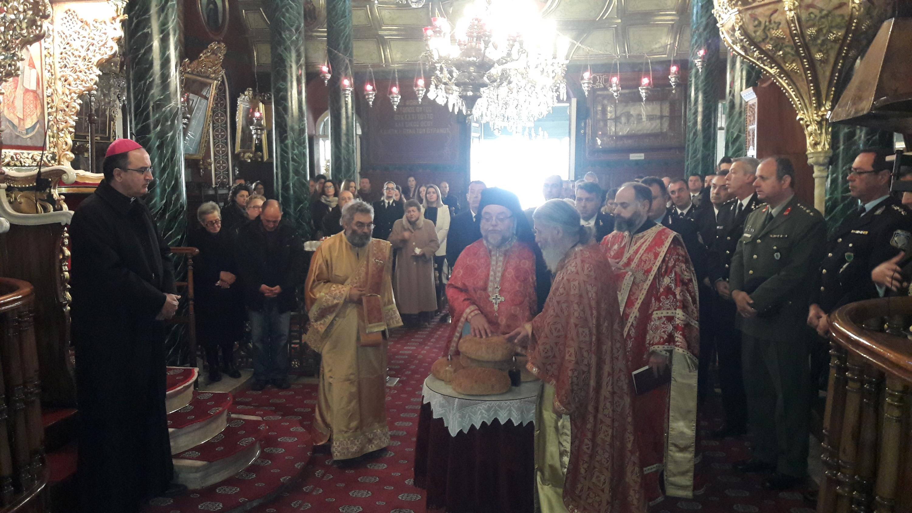 Η Δοξολογία πραγματοποιήθηκε στον Ι.Ν. Κοιμήσεως της Θεοτόκου, προεξάρχοντος του Αρχιμανδρίτη Αλέξανδρου Τσιουχαρη και παρουσία του Σεβασμιοτάτου Επισκόπου Καθολικών π. Πέτρου Στεφάνου.