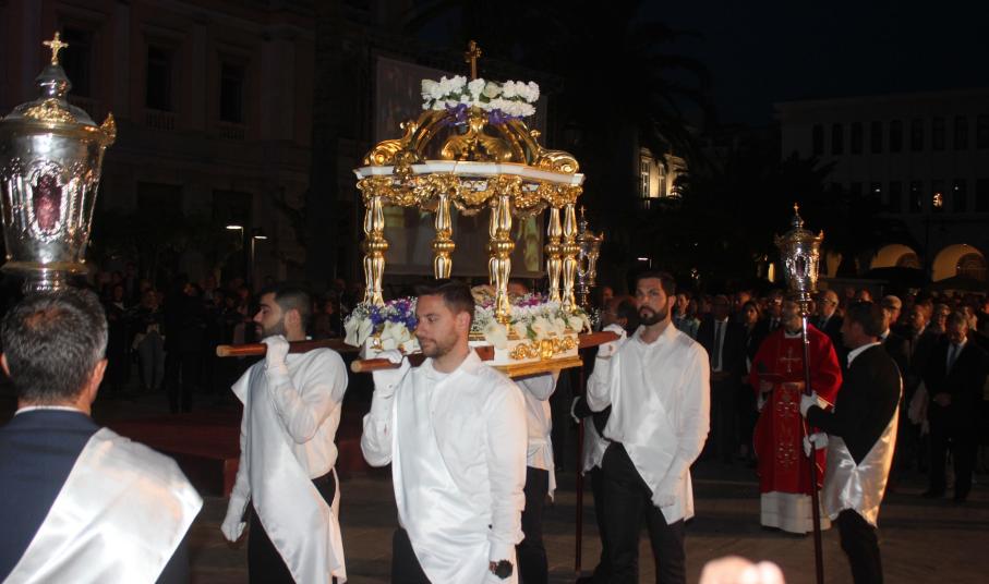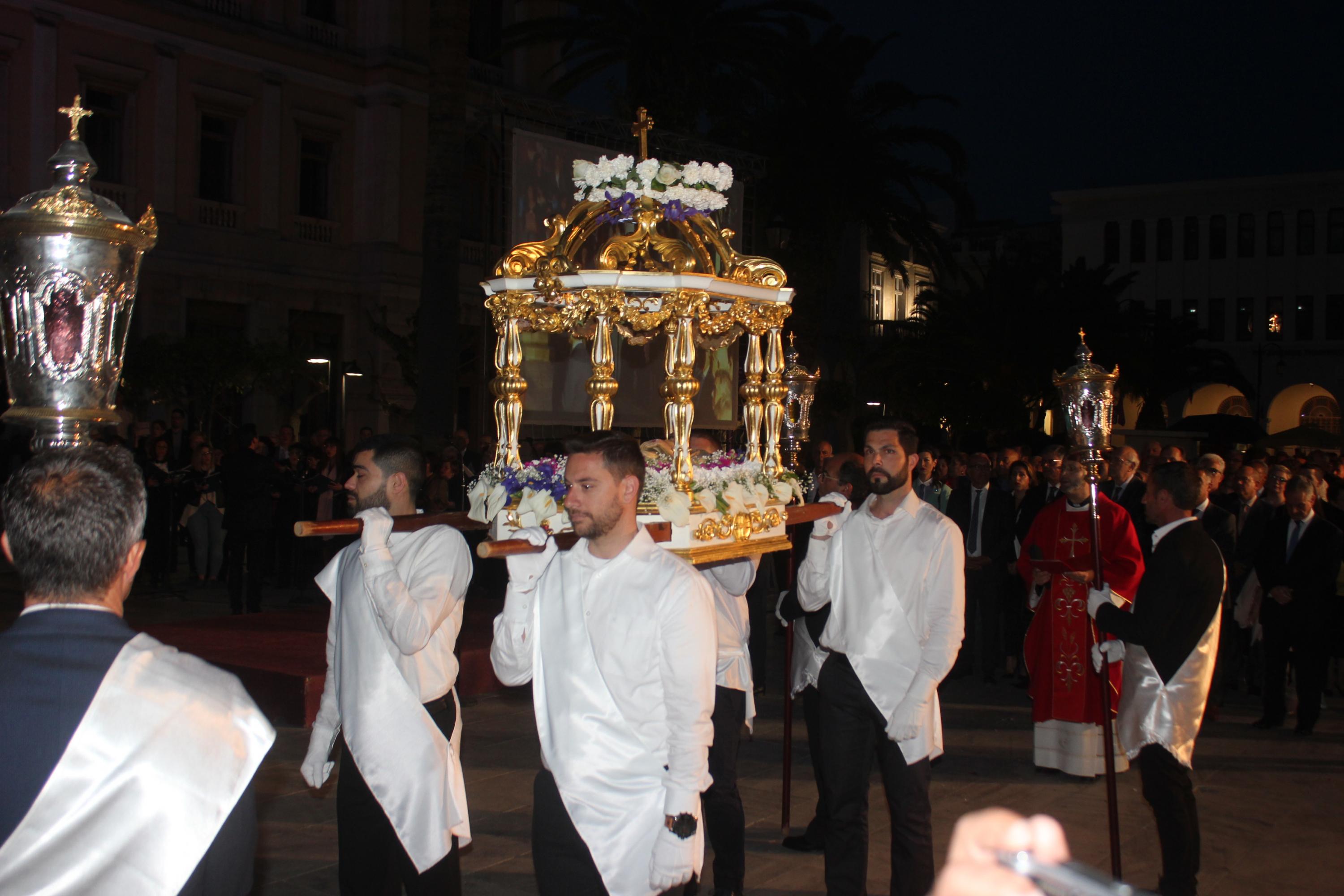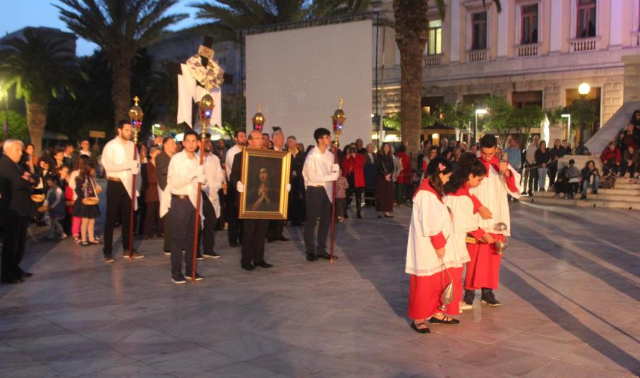 Με θρησκευτική ευλάβεια και κατάνυξη πραγματοποιήθηκε πριν από λίγα λεπτά η περιφορά του Επιταφίου του Ιερού Ναού Ευαγγελιστρίας στην Ερμούπολη, η οποία λάμπρυνε τους πλημμυρισμένους από κατοίκους και επισκέπτες δρόμους του ιστορικού κέντρου.