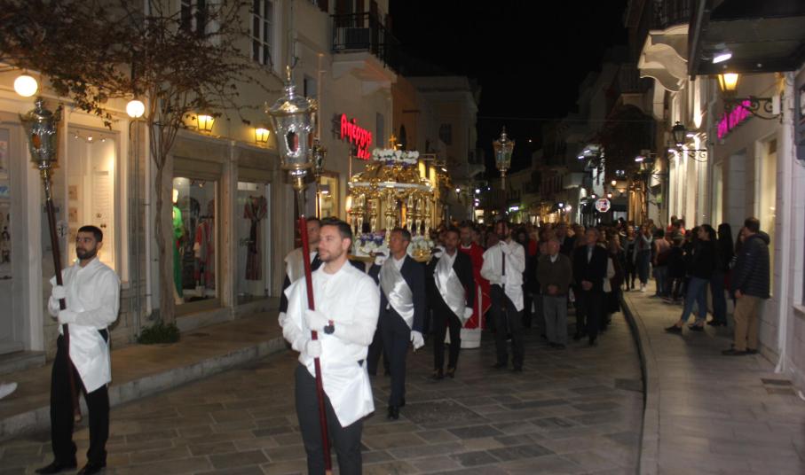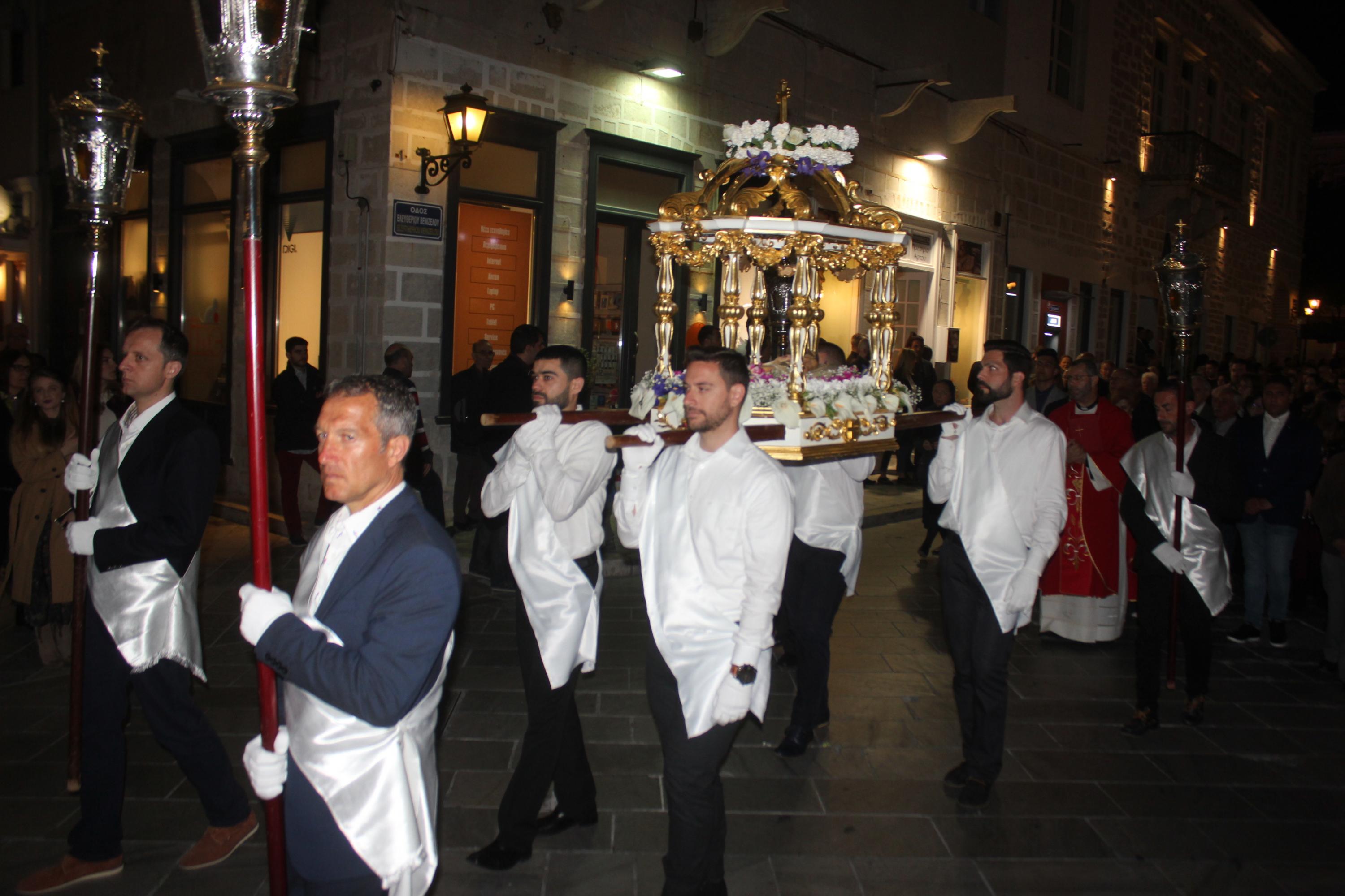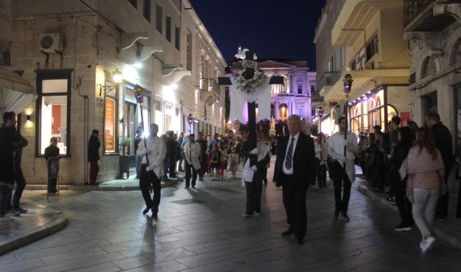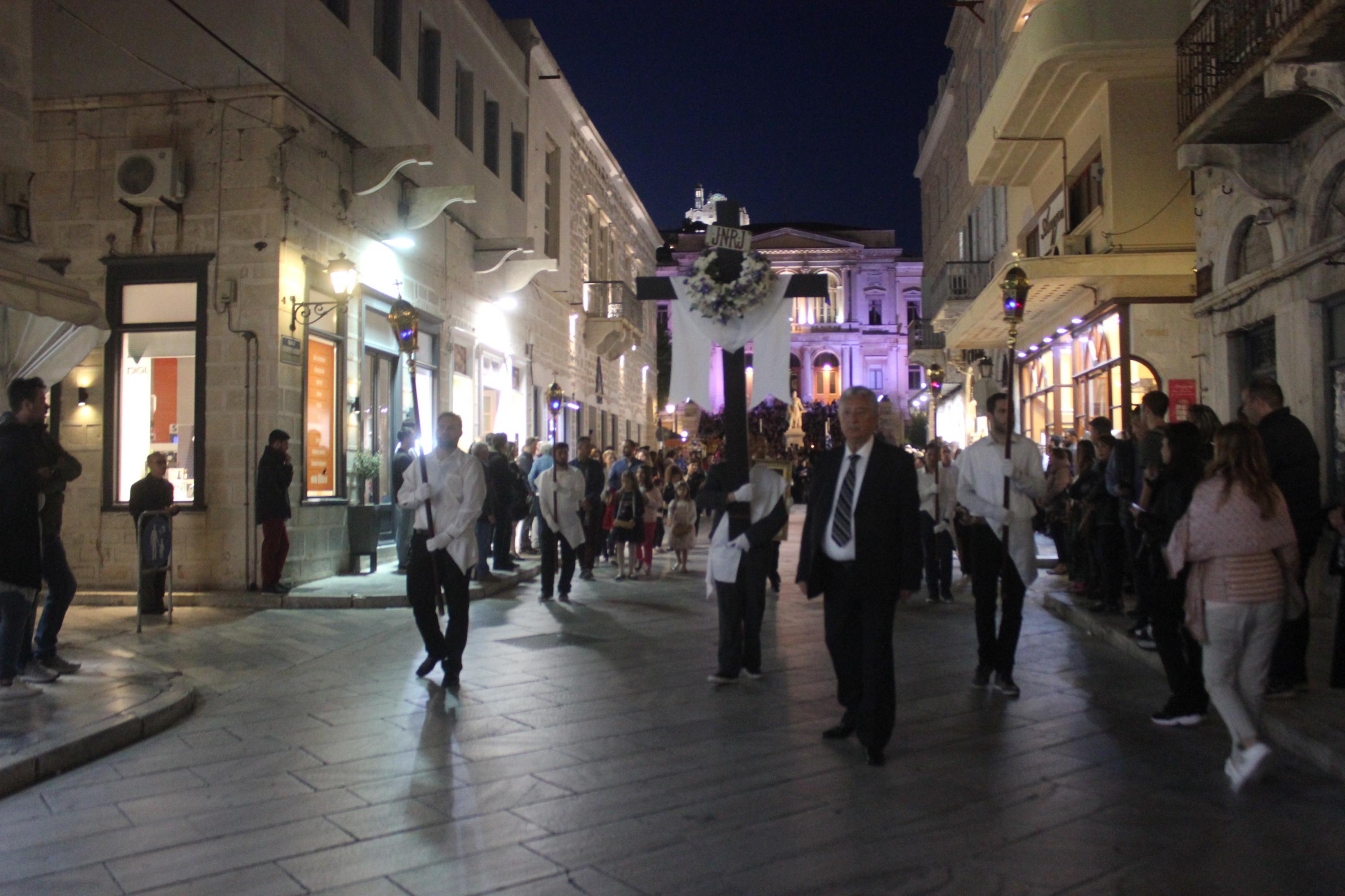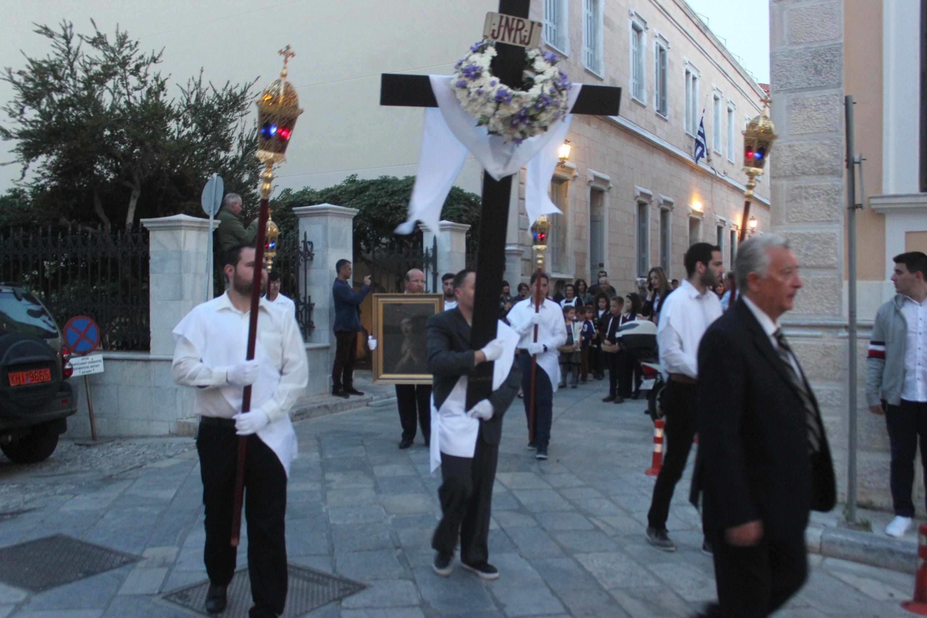 Η τελετή ξεκίνησε με την ακολουθία του Λόγου, την ανάγνωση του Θείου Πάθους ενώ στη συνέχεια ακολούθησε η Σταυροπροσκύνηση για να ολοκληρωθεί η ακολουθία με την περιφορά του Επιταφίου στους ώμους των νέων, στους δρόμους της Ερμούπολης.