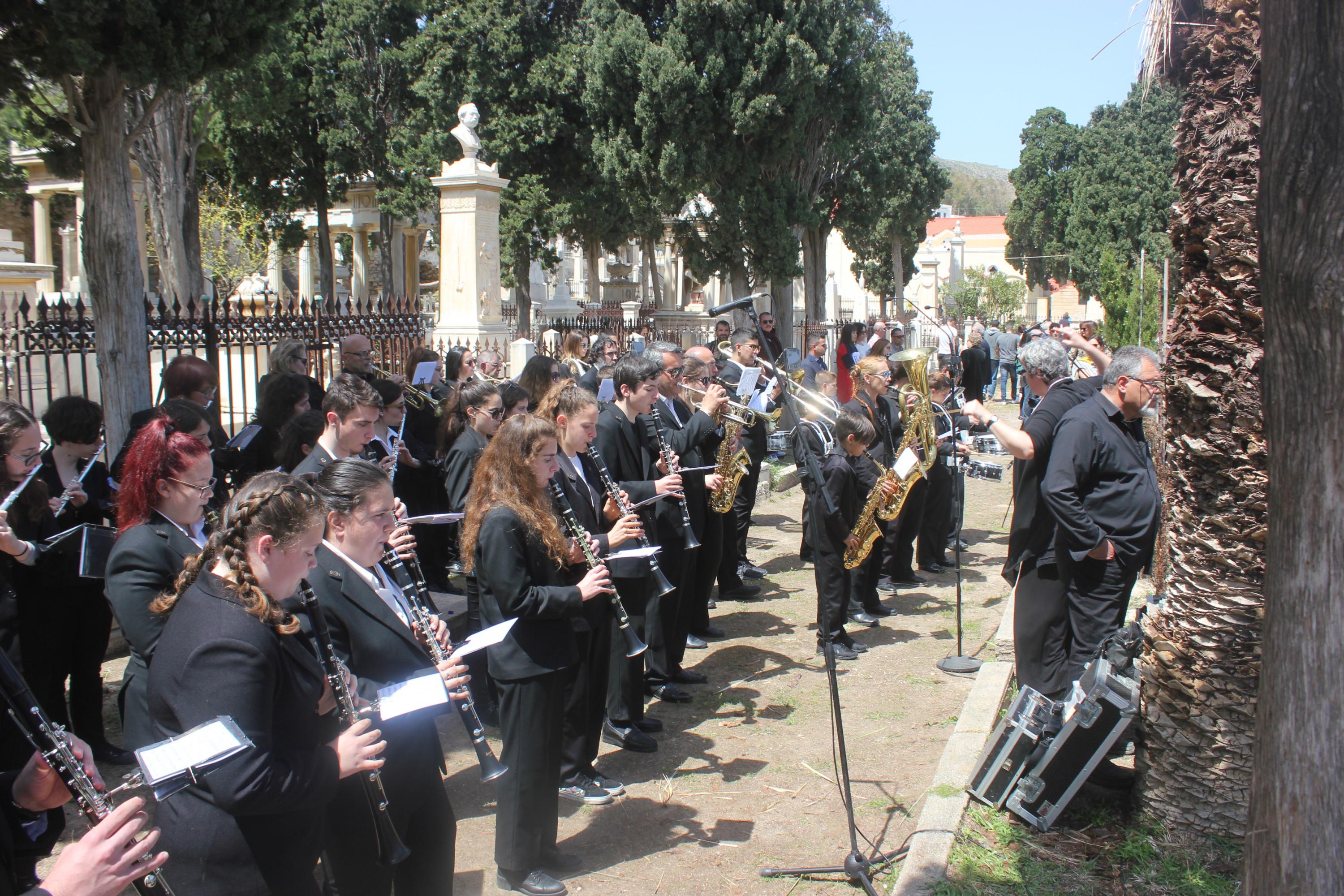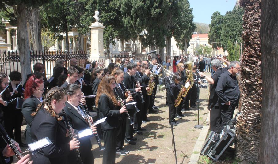 Τη λιτάνευση πλαισίωσε η Φιλαρμονική του Δήμου Σύρου – Ερμούπολης, παιανίζοντας πένθιμα εμβατήρια, υπό τη διεύθυνση της αρχιμουσικού Alice Labarche.