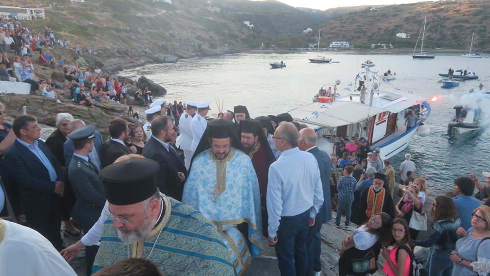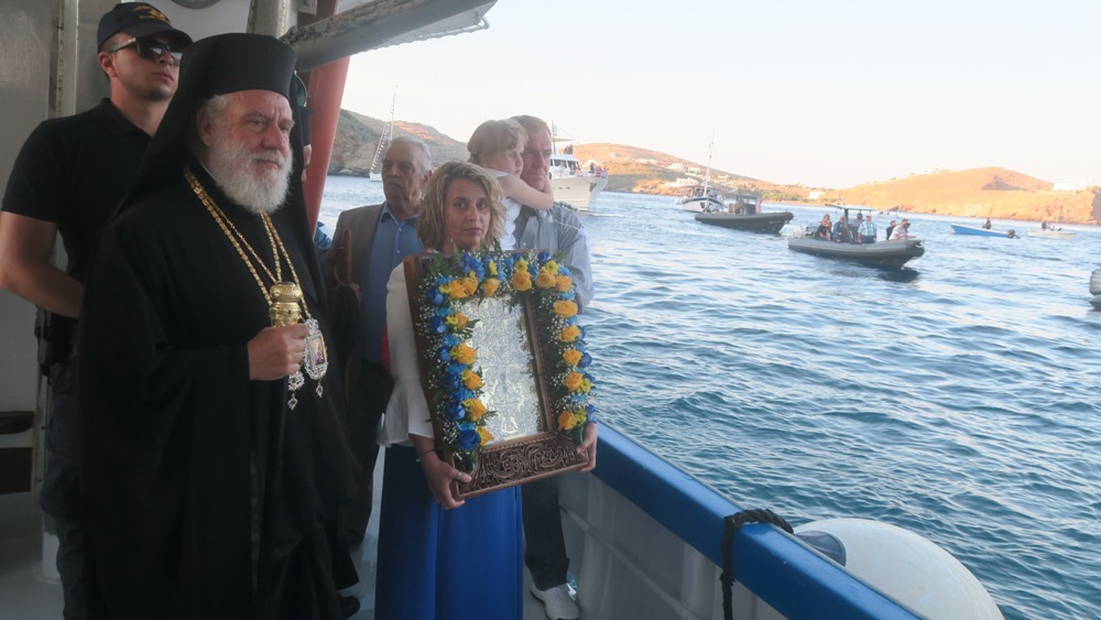 Μετά την άφιξή του στο λιμάνι των Καμαρών Σίφνου, απ’ όπου παρέλαβε κατά το έθος την ιερά Εικόνα της Παναγίας Χρυσοπηγής, το πλοίο Speed Runner περιέπλευσε τη Σίφνο και προσορμίσθηκε έναντι του ιερού Βράχου της Χρυσοπηγής, επί του οποίου ανέμεναν την αγία Εικόνα οι Σεβασμιώτατοι Μητροπολίτες Χαλκίδος κ. Χρυσόστομος, Μεσογαίας και Λαυρεωτικής κ. Νικόλαος, Ιλίου κ. Αθηναγόρας, Ιερισσού κ. Θεόκλητος, Τρίκκης κ. Χρυσόστομος και Σύρου κ. Δωρόθεος Β’, επικεφαλής εκατοντάδων προσκυνητών από τη Σίφνο και τα πέριξ νησιά.