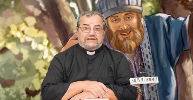 «Τον καιρό εκείνο, ο Ιησούς μπήκε στην Ιεριχώ και περνούσε μέσα από την πόλη. Εκεί υπήρχε κάποιος, που το όνομά του ήταν Ζακχαίος. Ήταν αρχιτελώνης και πλούσιος. Αυτός ζητούσε να δει ποιος είναι ο Ιησούς και δεν μπορούσε εξαιτίας του πλήθους γιατί ήταν μικρόσωμος. Έτρεξε λοιπόν μπροστά πριν από το πλήθος κι ανέβηκε σε μια συκομουριά για να τον δει, επειδή επρόκειτο ο Ιησούς περνούσε από κει. Όταν έφτασε ο Ιησούς στο σημείο εκείνο, κοίταξε προς τα πάνω, τον είδε και του είπε: «Ζακχαίε, κατέβα γρήγορα, γιατί σήμερα πρέπει να μείνω στο σπίτι σου». Εκείνος κατέβηκε γρήγορα και τον υποδέχτηκε με χαρά. Όλοι όσοι τα είδαν αυτά διαμαρτύρονταν κι έλεγαν ότι πήγε να μείνει στο σπίτι ενός αμαρτωλού. Τότε σηκώθηκε ο Ζακχαίος και είπε στον Κύριο: «Κύριε, υπόσχομαι να δώσω τα μισά από τα υπάρχοντά μου στους φτωχούς και ν’ ανταποδώσω στο τετραπλάσιο όσα έχω πάρει με απάτη». Ο Ιησούς, απευθυνόμενος σ’ αυτόν, είπε: «Σήμερα αυτή η οικογένεια σώθηκε· γιατί κι αυτός ο τελώνης είναι απόγονος του Αβραάμ. Ο Υιός του Ανθρώπου ήρθε για ν’ αναζητήσει και να σώσει αυτούς που έχουν χάσει το δρόμο τους»