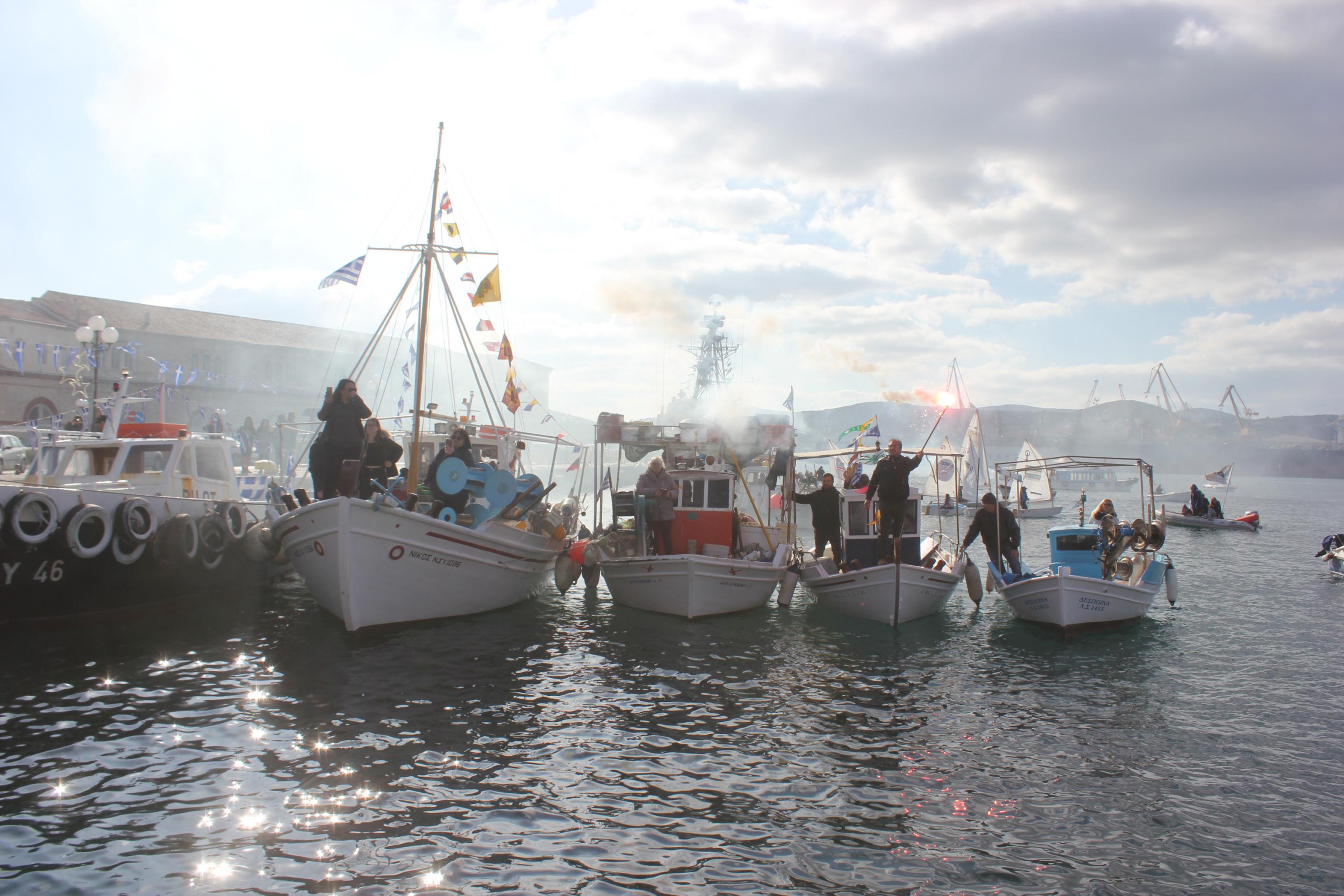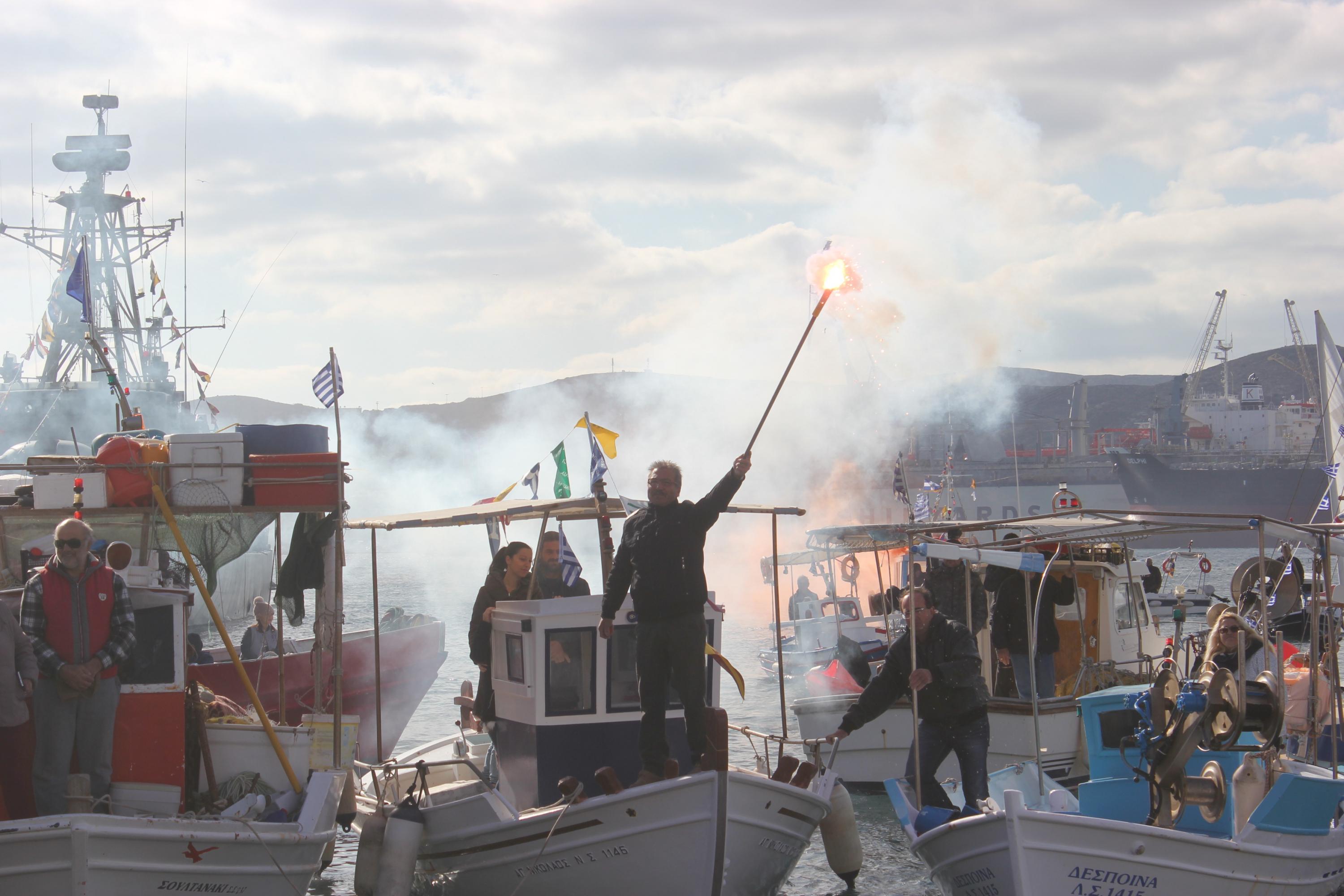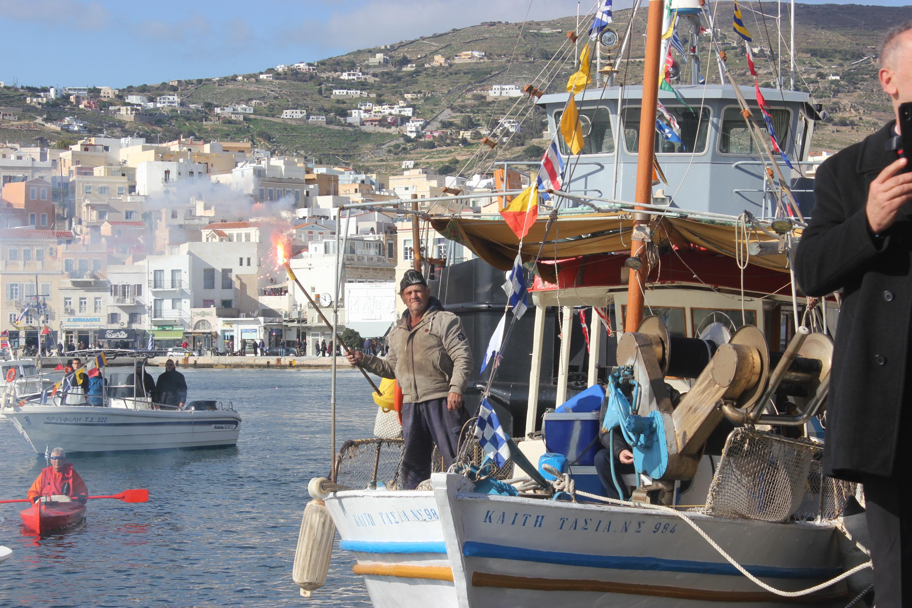 Συγκινητική, όπως κάθε χρονιά, η συμμετοχή στον εορτασμό από θαλάσσης, των πλοίων και πληρωμάτων του Πολεμικού Ναυτικού, του Λιμενικού Σώματος των αλιέων και του Ναυτικού Ομίλου Σύρου, οι οποίοι με τη χρήση φωτοβολίδων δημιούργησαν κλίμα κατάνυξης.