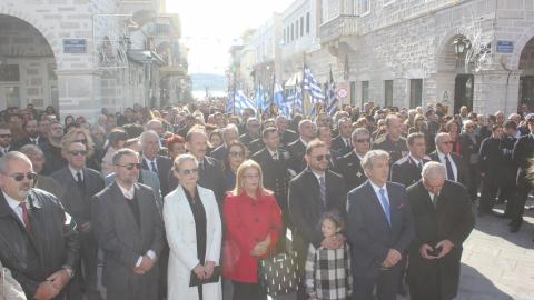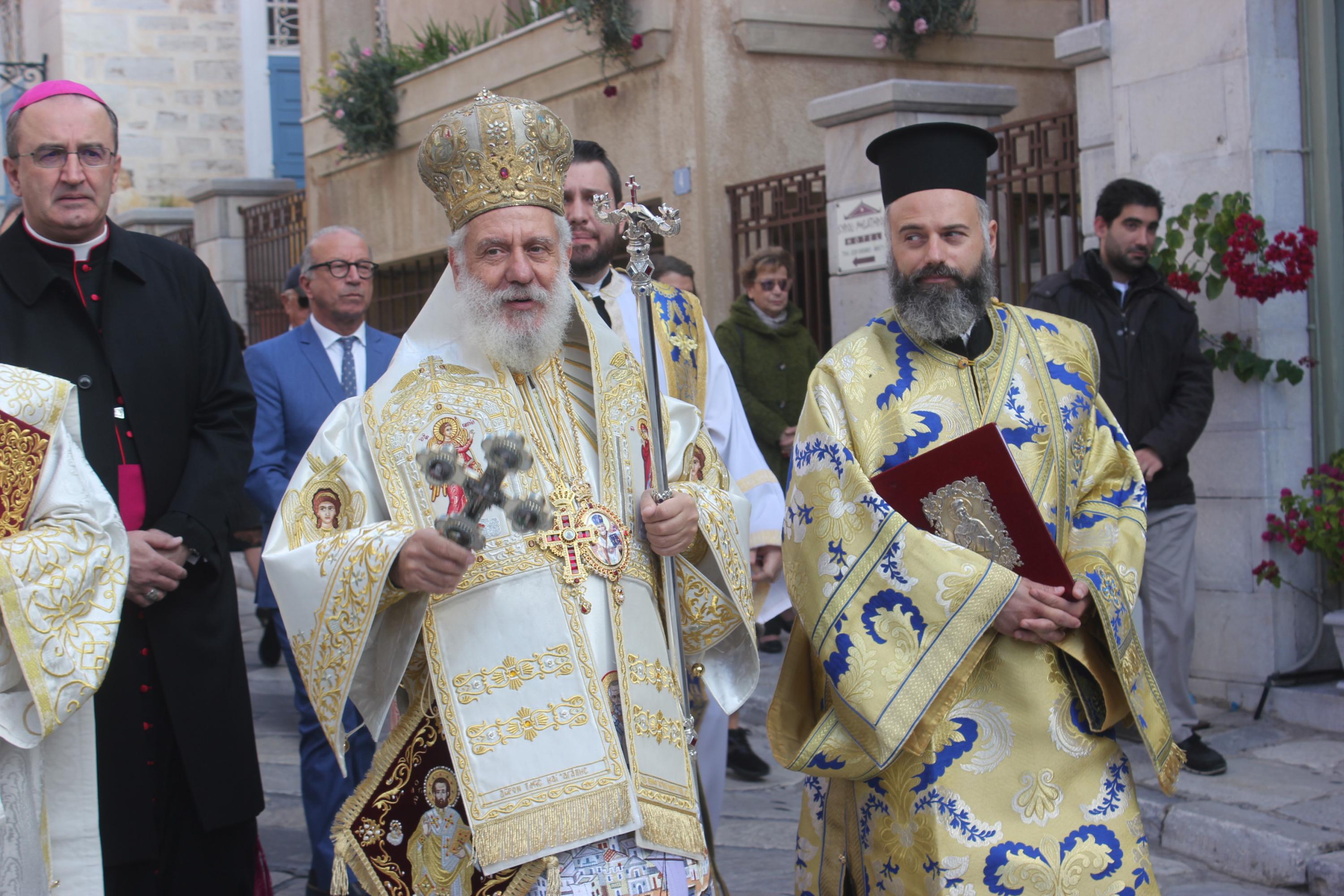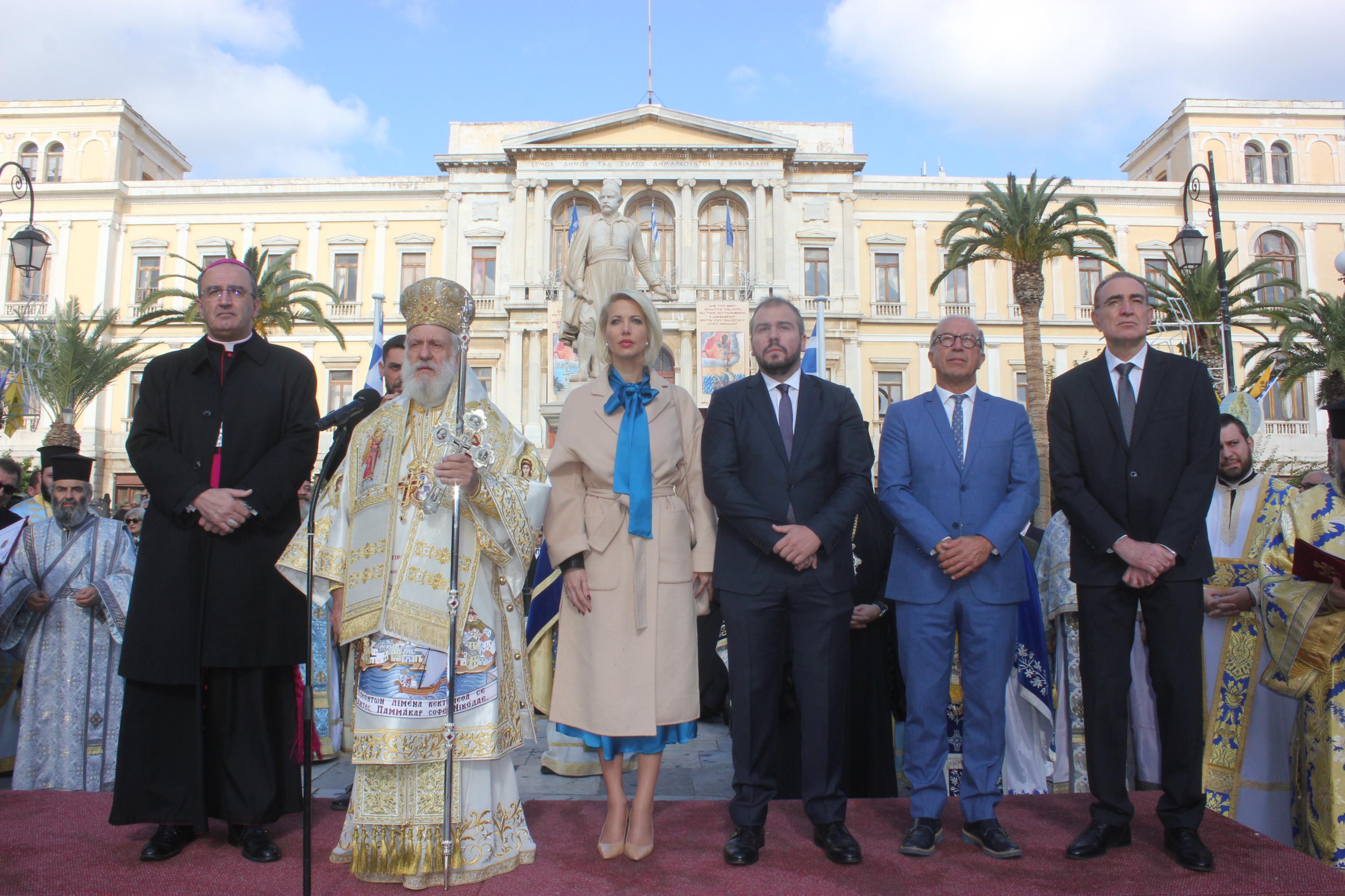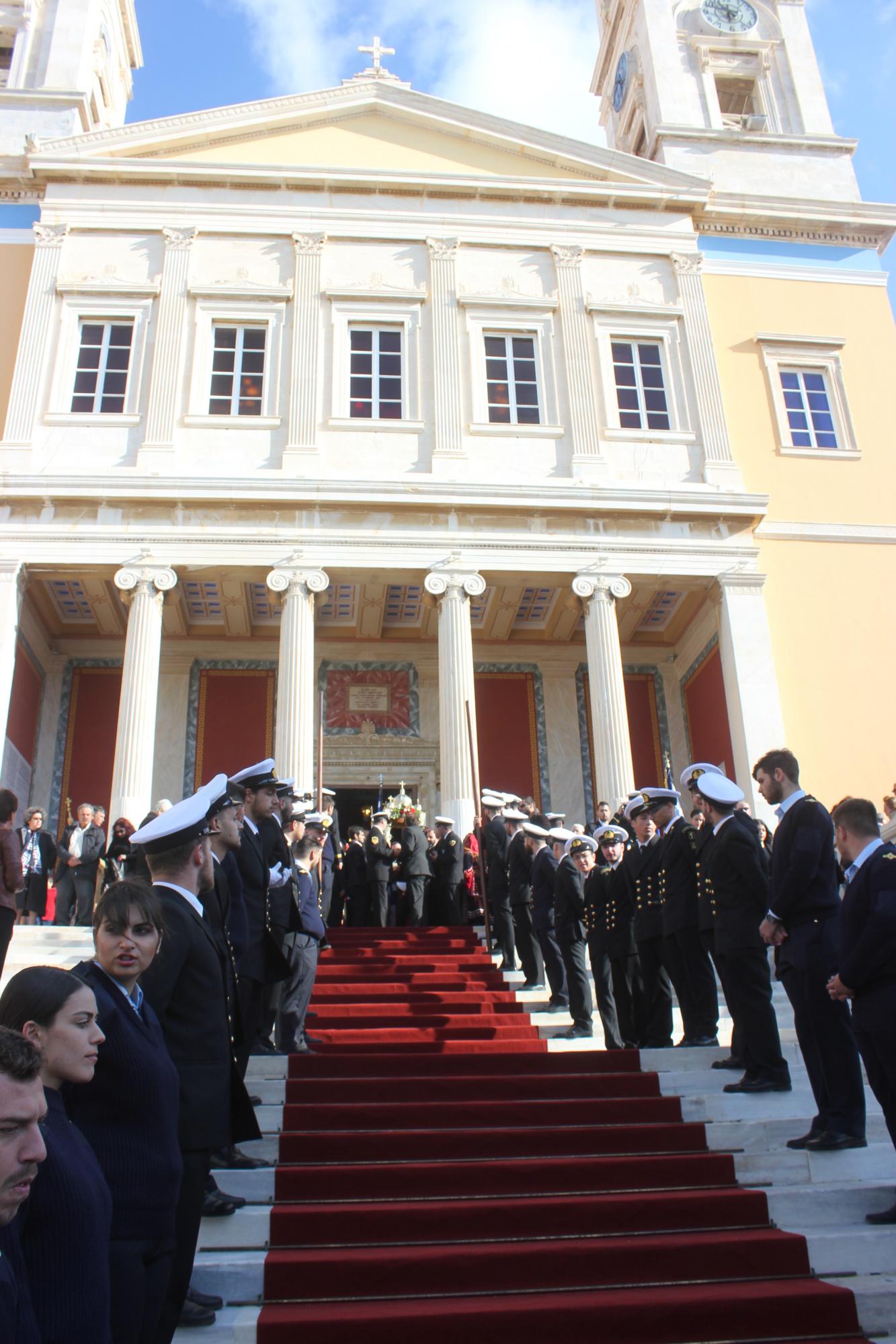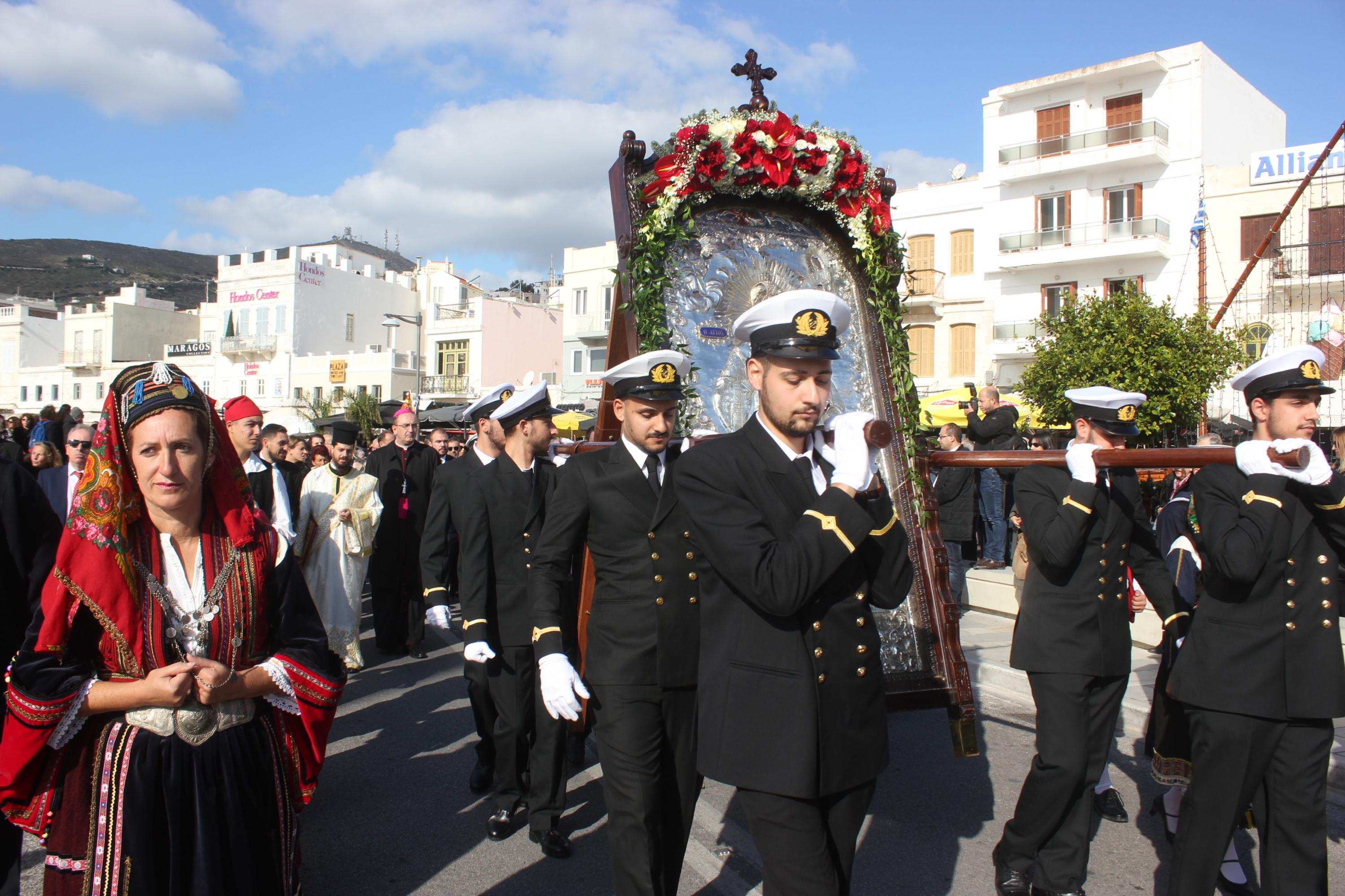 Στη συνέχεια, υπό τα εμβατήρια της Φιλαρμονικής του Δήμου Σύρου – Ερμούπολης, πραγματοποιήθηκε με τη συμμετοχή “θάλασσας” πιστών η πάνδημη λιτανεία της ιεράς Εικόνος του αποτμήματος εκ των τιμίων λειψάνων του Αγίου Νικολάου, στην οποία συμμετείχαν μέλη του Λυκείου Ελληνίδων Σύρου, Σπουδαστές της Ακαδημίας Εμπορικού Ναυτικού Σύρου, αντιπροσωπείες μαθητών με τις σημαίες τους και πρόσκοποι.