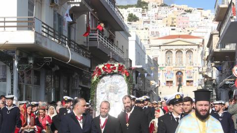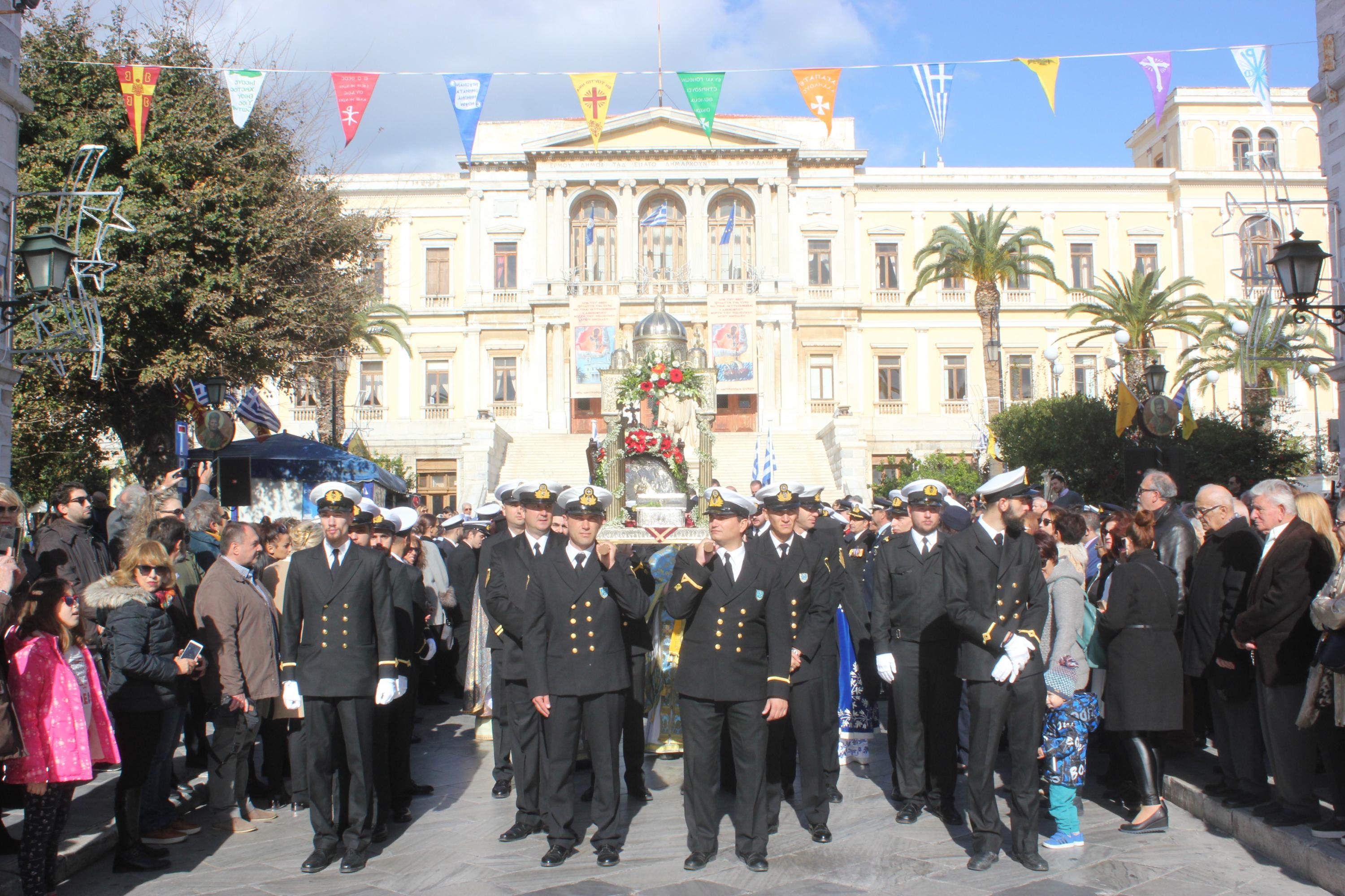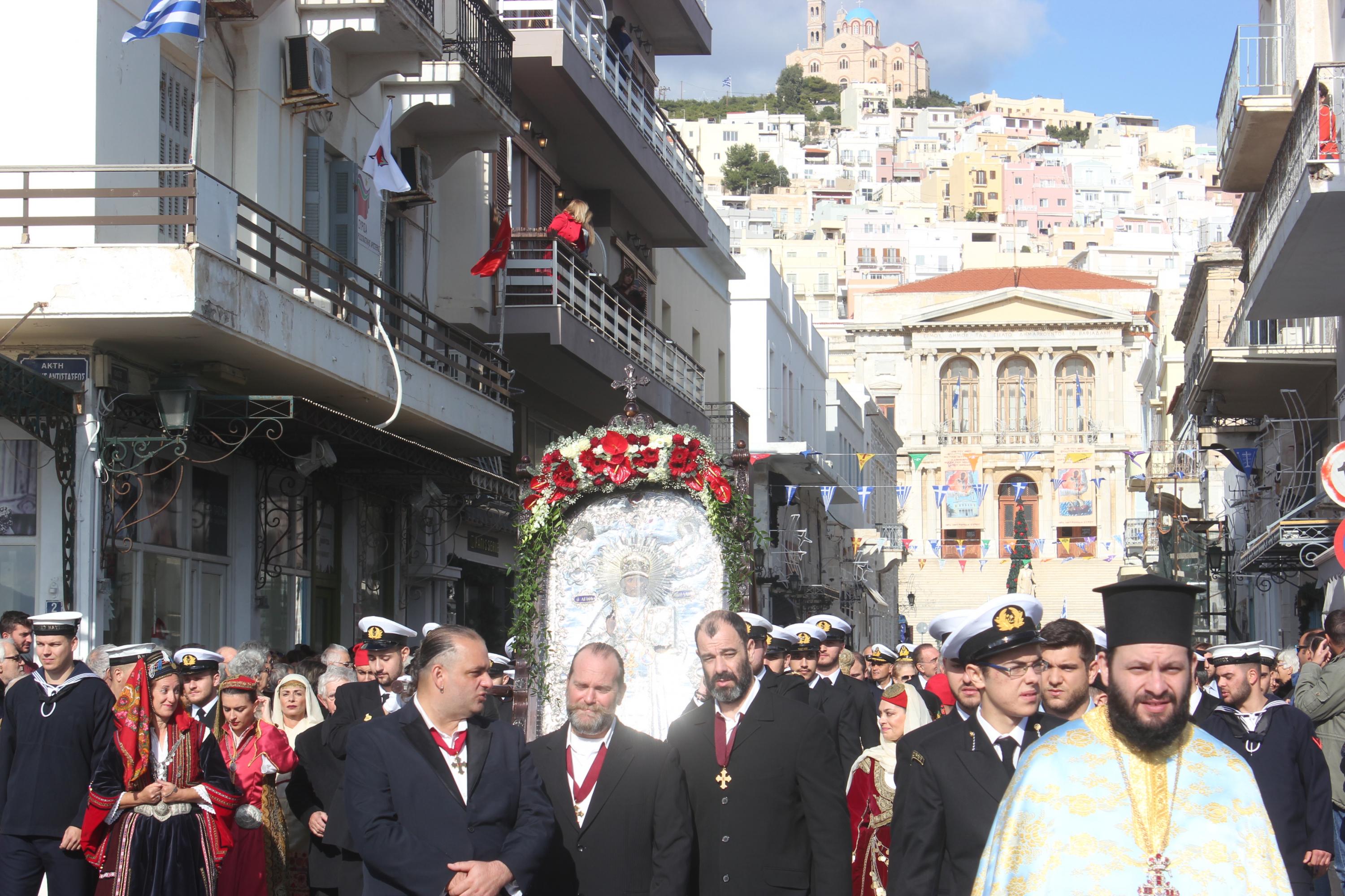 Η λιτανεία της ιεράς Εικόνος του πολιούχου του νησιού ξεκίνησε από τον Ι.Ν. Αγίου Νικολάου και διερχόμενη από το Θεάτρο Απόλλων έφτασε στην Πλατεία Μιαούλη, όπου ο Σεβασμιώτατος Μητροπολίτης ανέπεμψε δέηση υπέρ των ναυτιλλομένων. Χαιρετισμός απευθύνθηκε και από τον -εορτάζοντα- Δήμαρχο Σύρου - Ερμούπολης, Νίκο Λειβαδάρα. Κατόπιν, ως είθισται, η λιτανεία συνέχισε την πορεία της μέσω της Ακτής Πέτρου Ράλλη έως την Πλατεία Κανάρη, όπου αποδόθηκε τιμή και μνήμη στους πνιγέντες ναυτικούς. Ρίψη στεφάνων πραγματοποίησαν ο Σεβασμιώτατος, κ. Δωρόθεος Β' και ο πρόεδρος της Ένωσης Συνταξιούκων Ναυτικών Σύρου, Γιώργος Μηλιός.