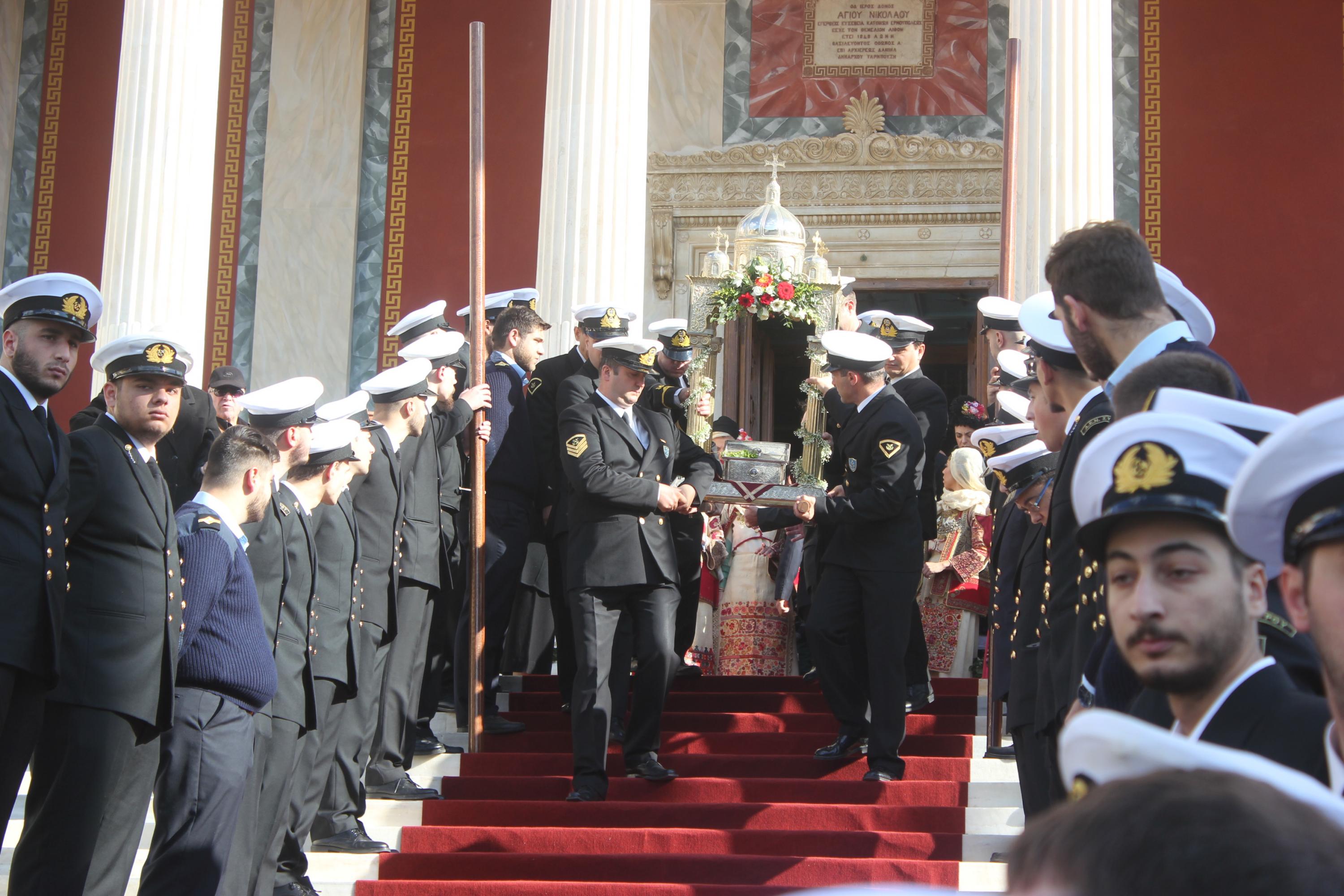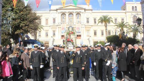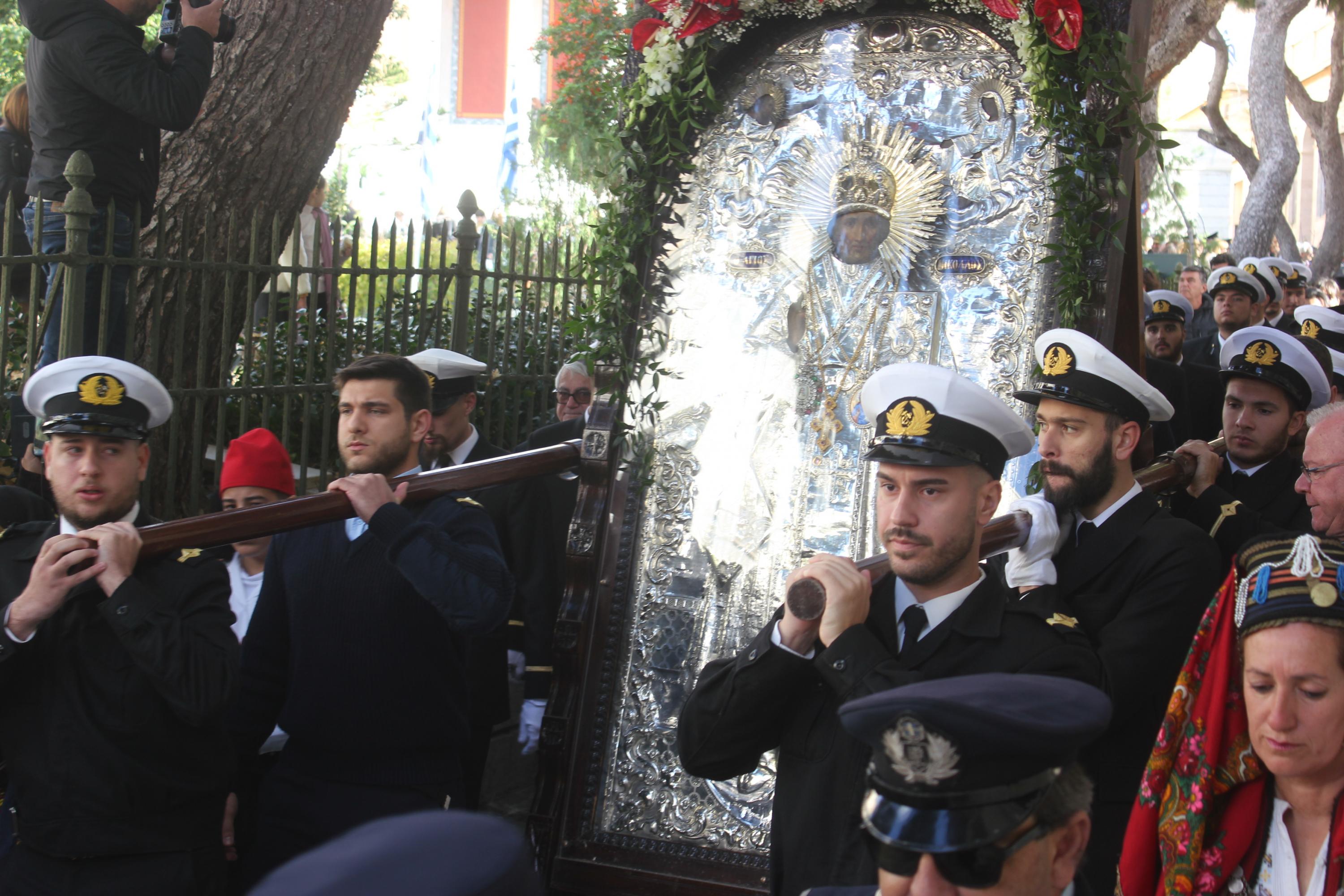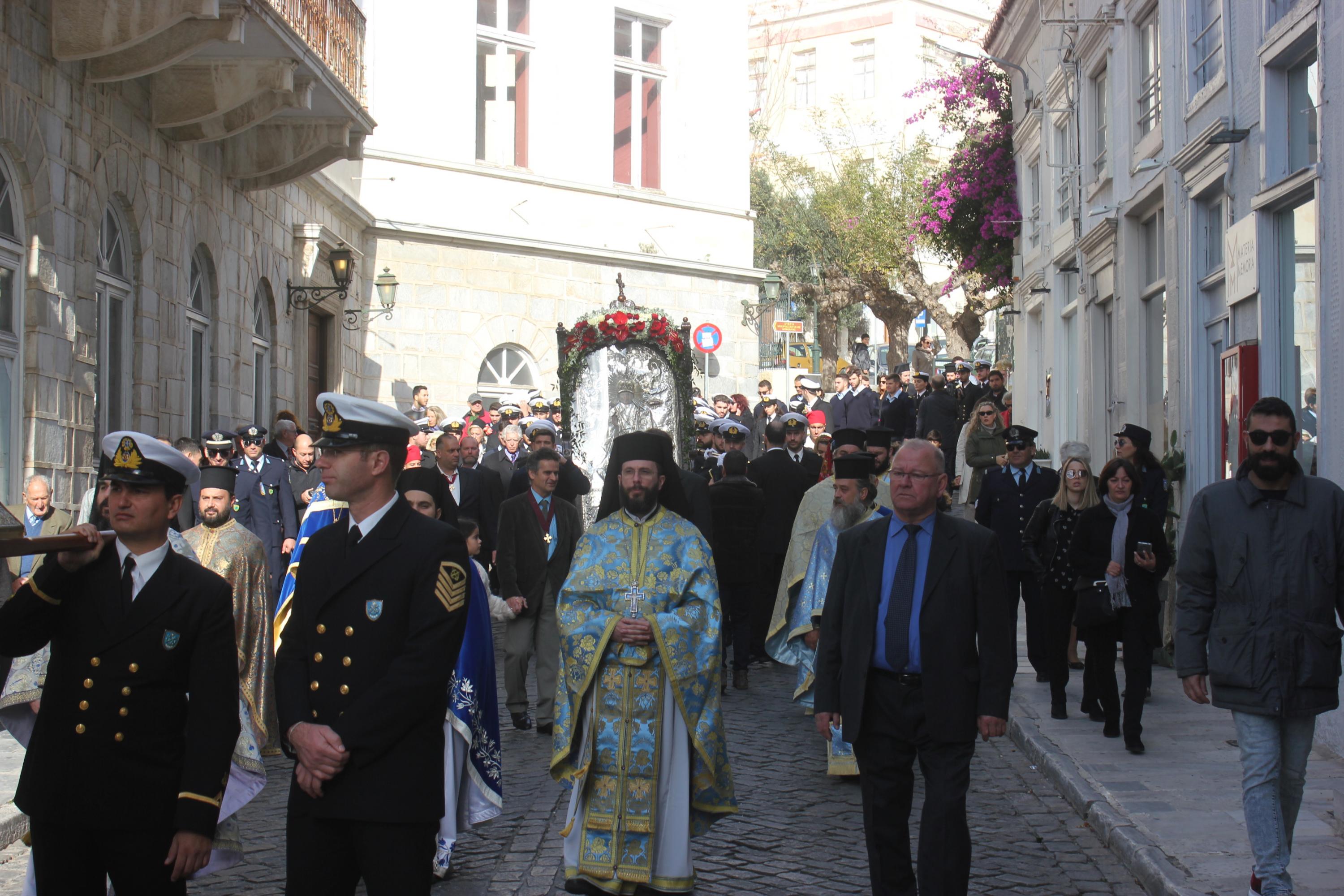 Η λιτανεία της ιεράς Εικόνος του πολιούχου του νησιού ξεκίνησε από τον Ι.Ν. Αγίου Νικολάου και διερχόμενη από το Θεάτρο Απόλλων έφτασε στην Πλατεία Μιαούλη, όπου ο Σεβασμιώτατος Μητροπολίτης ανέπεμψε δέηση υπέρ των ναυτιλλομένων. Χαιρετισμός απευθύνθηκε και από τον -εορτάζοντα- Δήμαρχο Σύρου - Ερμούπολης, Νίκο Λειβαδάρα. Κατόπιν, ως είθισται, η λιτανεία συνέχισε την πορεία της μέσω της Ακτής Πέτρου Ράλλη έως την Πλατεία Κανάρη, όπου αποδόθηκε τιμή και μνήμη στους πνιγέντες ναυτικούς. Ρίψη στεφάνων πραγματοποίησαν ο Σεβασμιώτατος, κ. Δωρόθεος Β' και ο πρόεδρος της Ένωσης Συνταξιούκων Ναυτικών Σύρου, Γιώργος Μηλιός.
