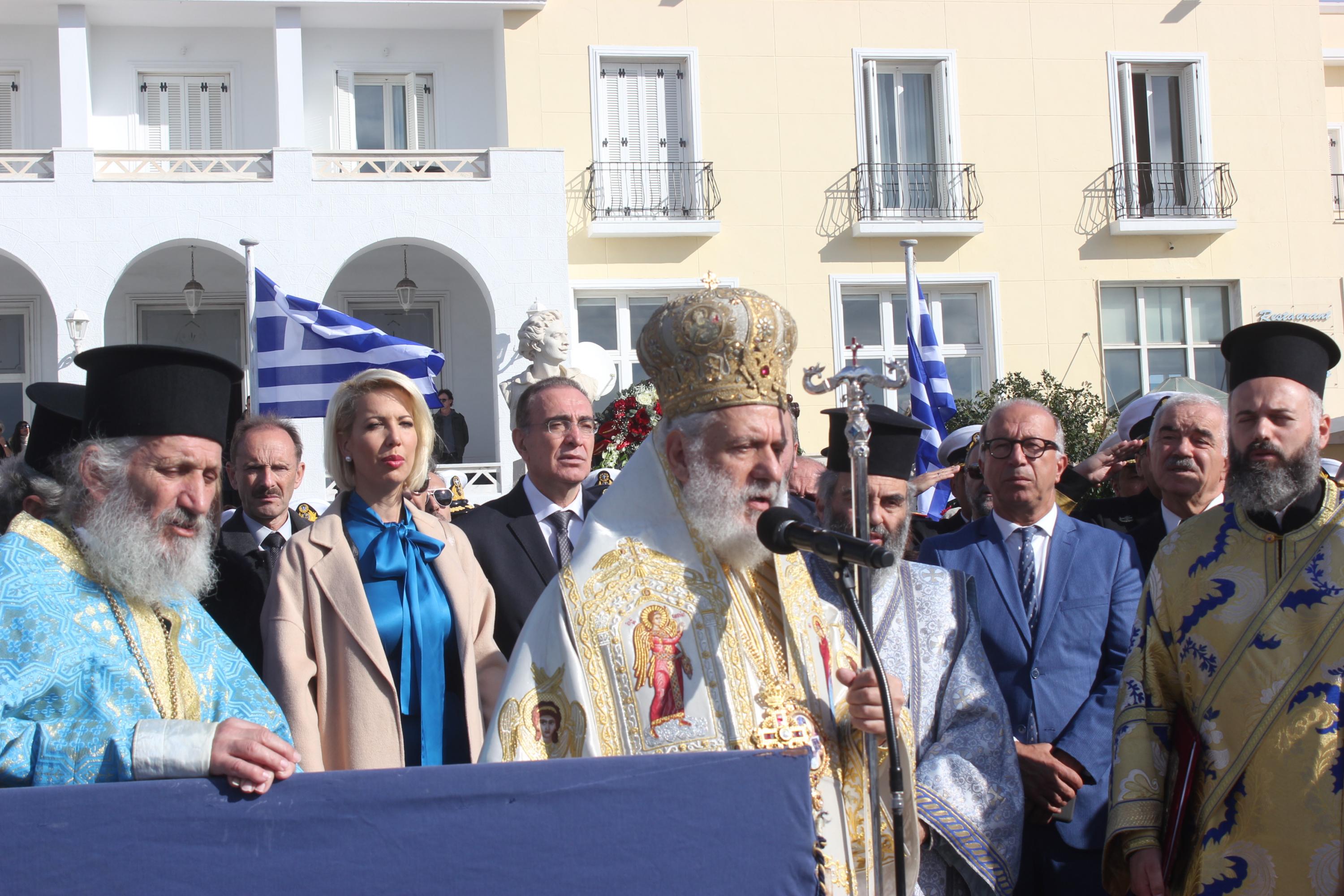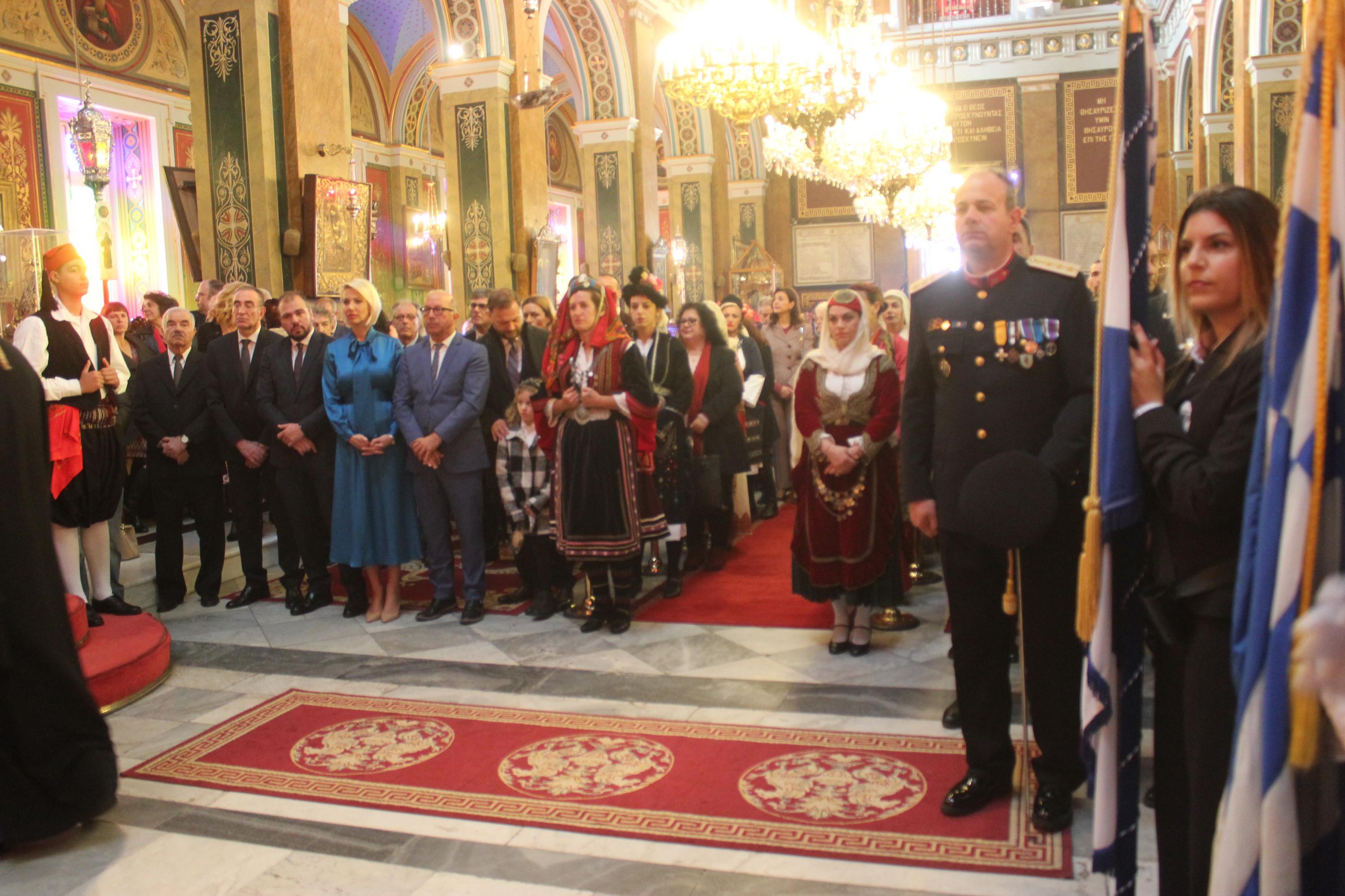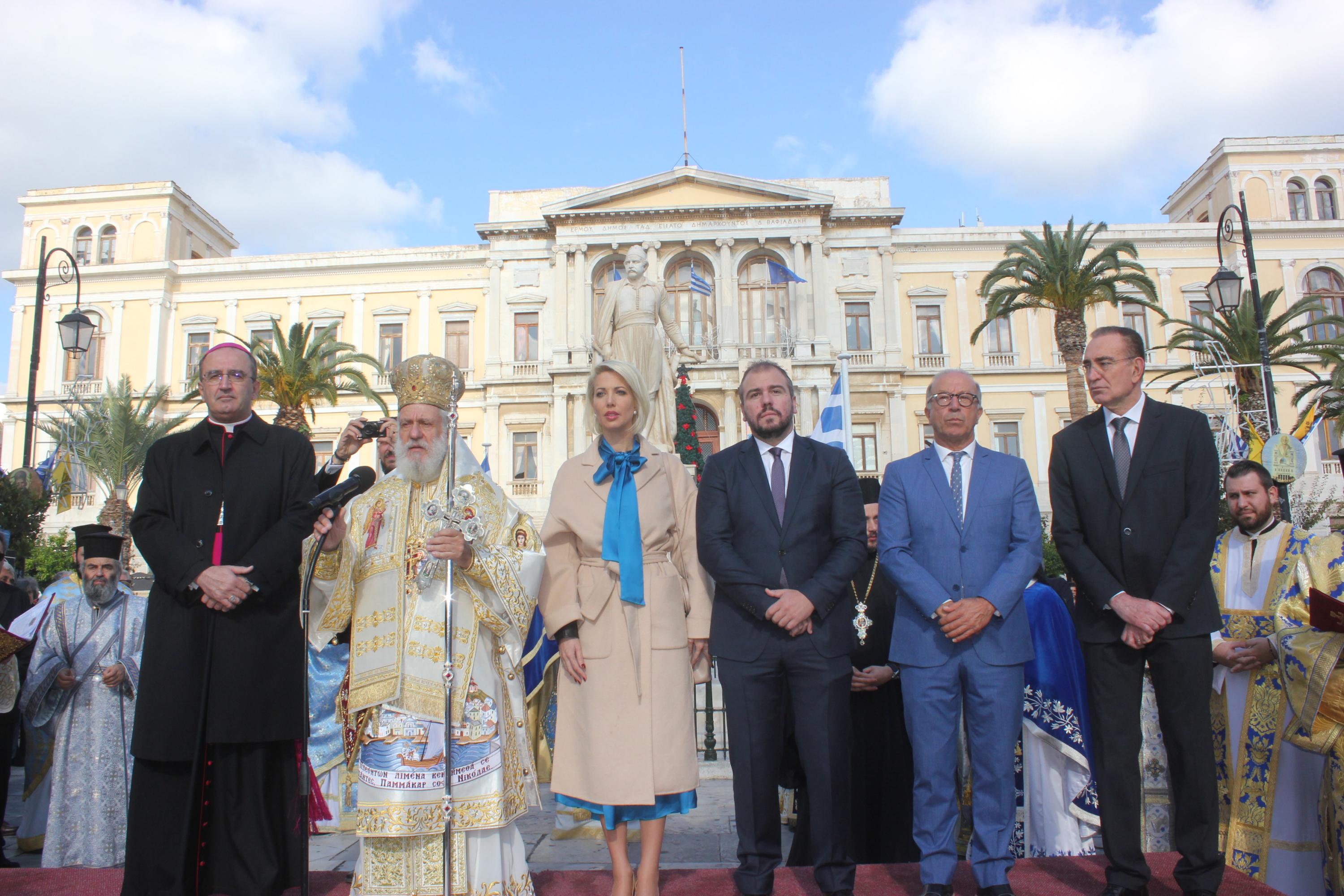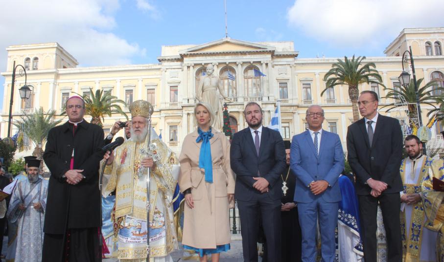 Συγκινητική ήταν η αθρόα προσέλευση εκπροσώπων της τοπικής αυτοδιοίκησης α’ και β’ βαθμού, των στρατιωτικών αρχών και των σωμάτων ασφαλείας, τοπικών συλλόγων και σωματείων, εκπαιδευτικών, μαθητών και πιστών στον περικαλή Καθεδρικό Ναό του Αγίου Νικολάου, όπου τελέστηκε η Θεία Λειτουργία, ιερουργούντος του Σεβασμιωτάτου Μητροπολίτη Σύρου κ. Δωροθέου Β' με τη συμμετοχή Εφημερίων του νησιού.