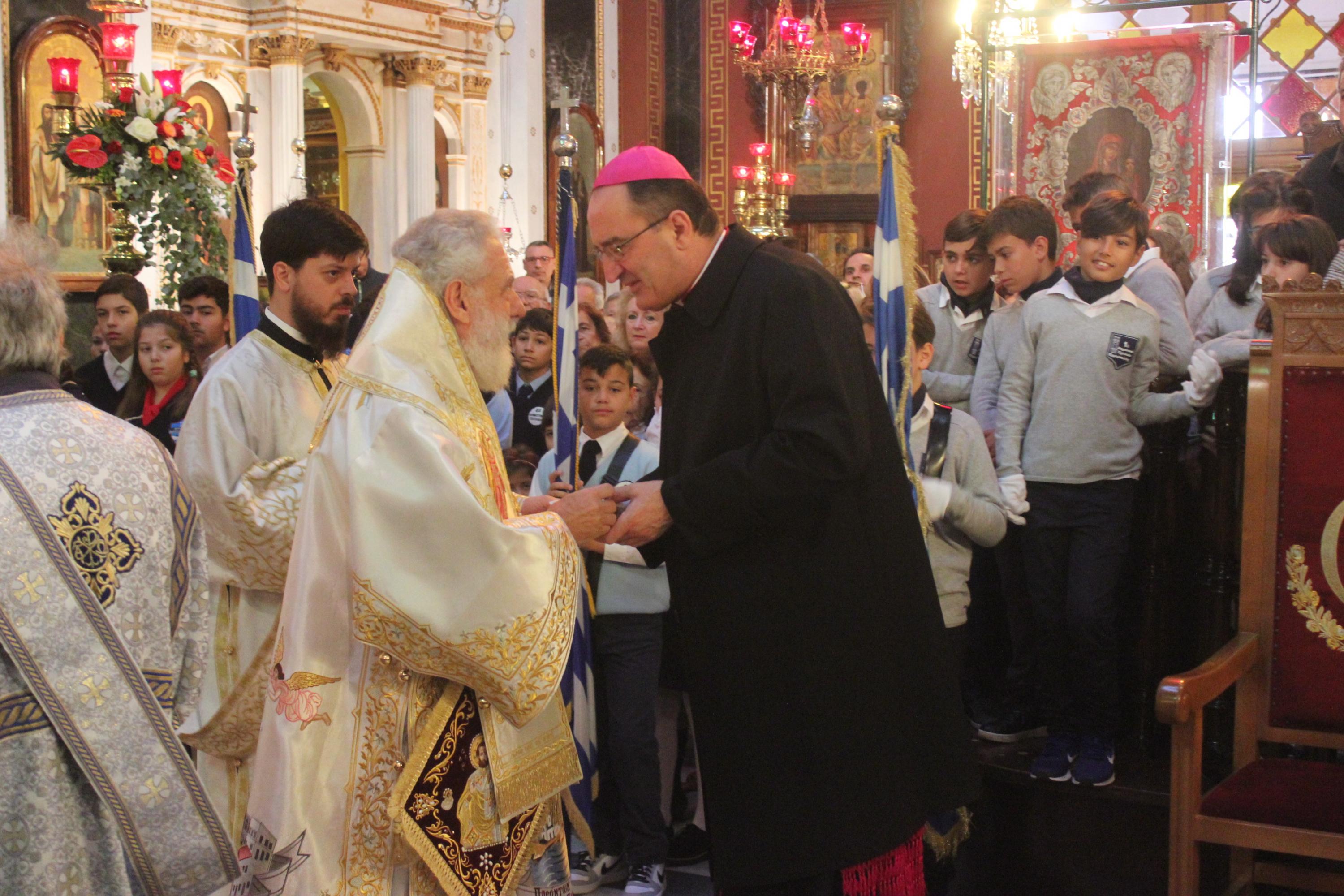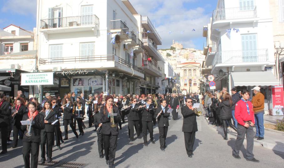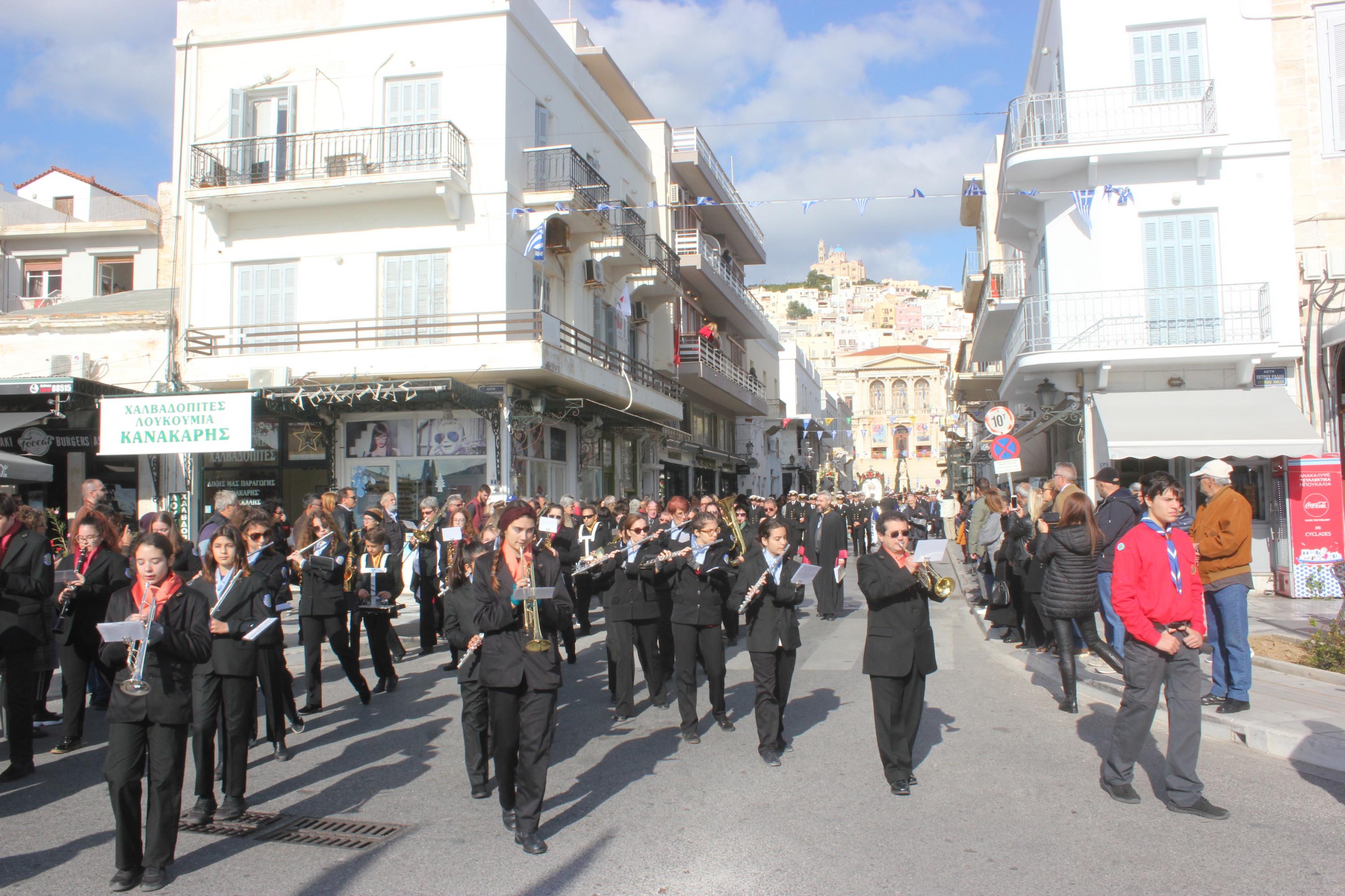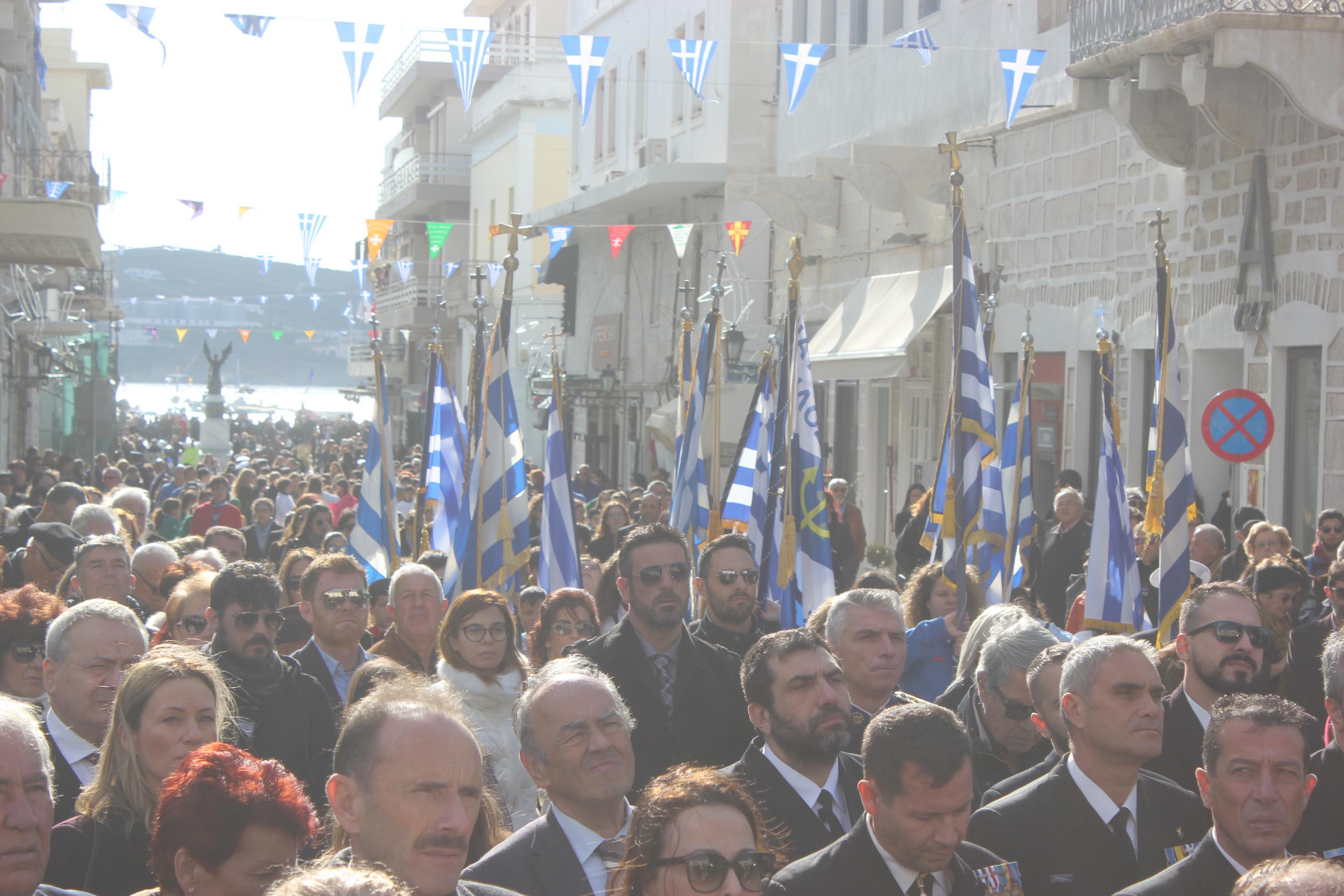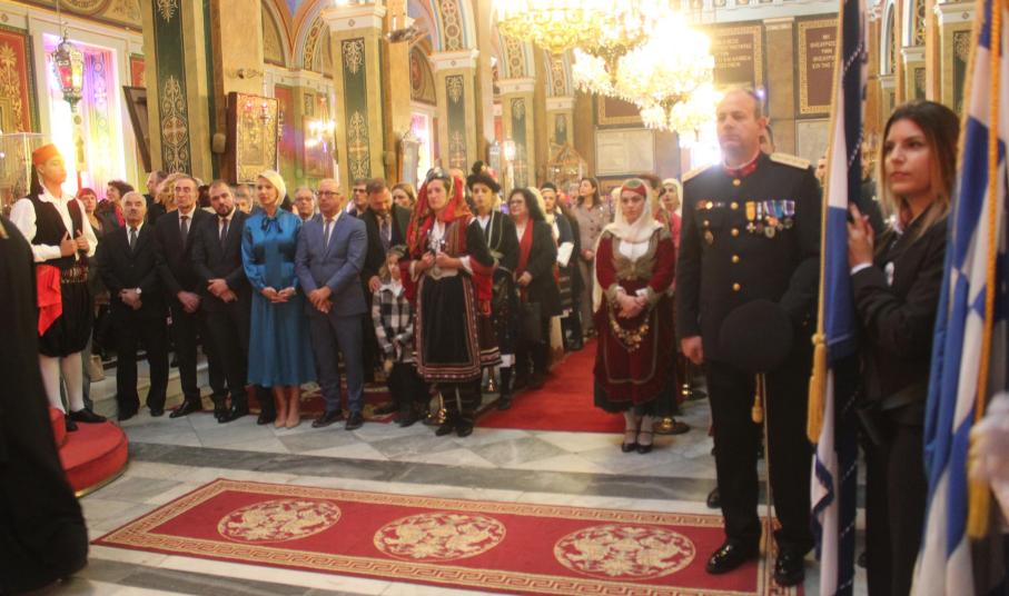 Συγκινητική ήταν η αθρόα προσέλευση εκπροσώπων της τοπικής αυτοδιοίκησης α’ και β’ βαθμού, των στρατιωτικών αρχών και των σωμάτων ασφαλείας, τοπικών συλλόγων και σωματείων, εκπαιδευτικών, μαθητών και πιστών στον περικαλή Καθεδρικό Ναό του Αγίου Νικολάου, όπου τελέστηκε η Θεία Λειτουργία, ιερουργούντος του Σεβασμιωτάτου Μητροπολίτη Σύρου κ. Δωροθέου Β' με τη συμμετοχή Εφημερίων του νησιού.