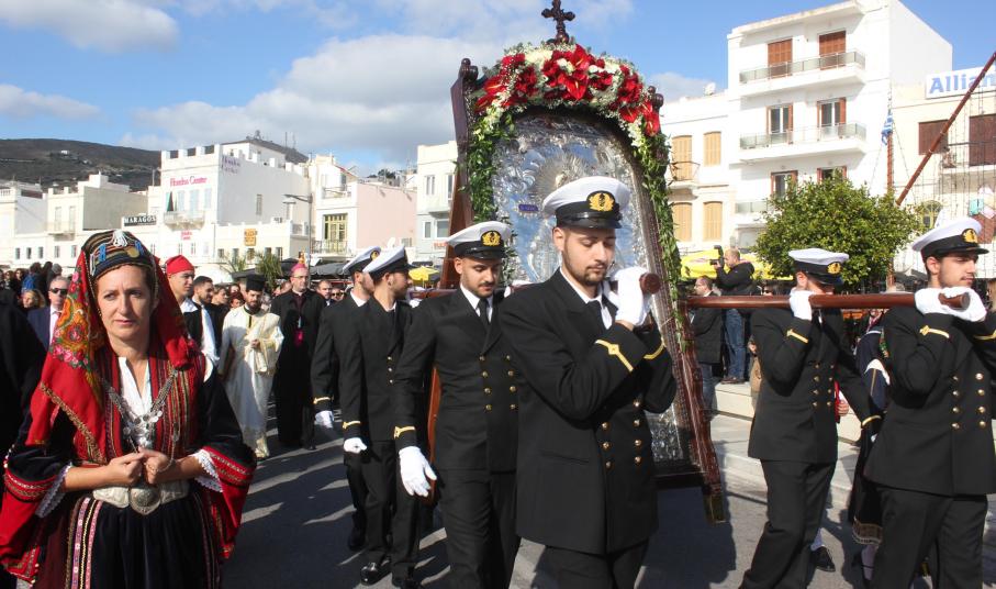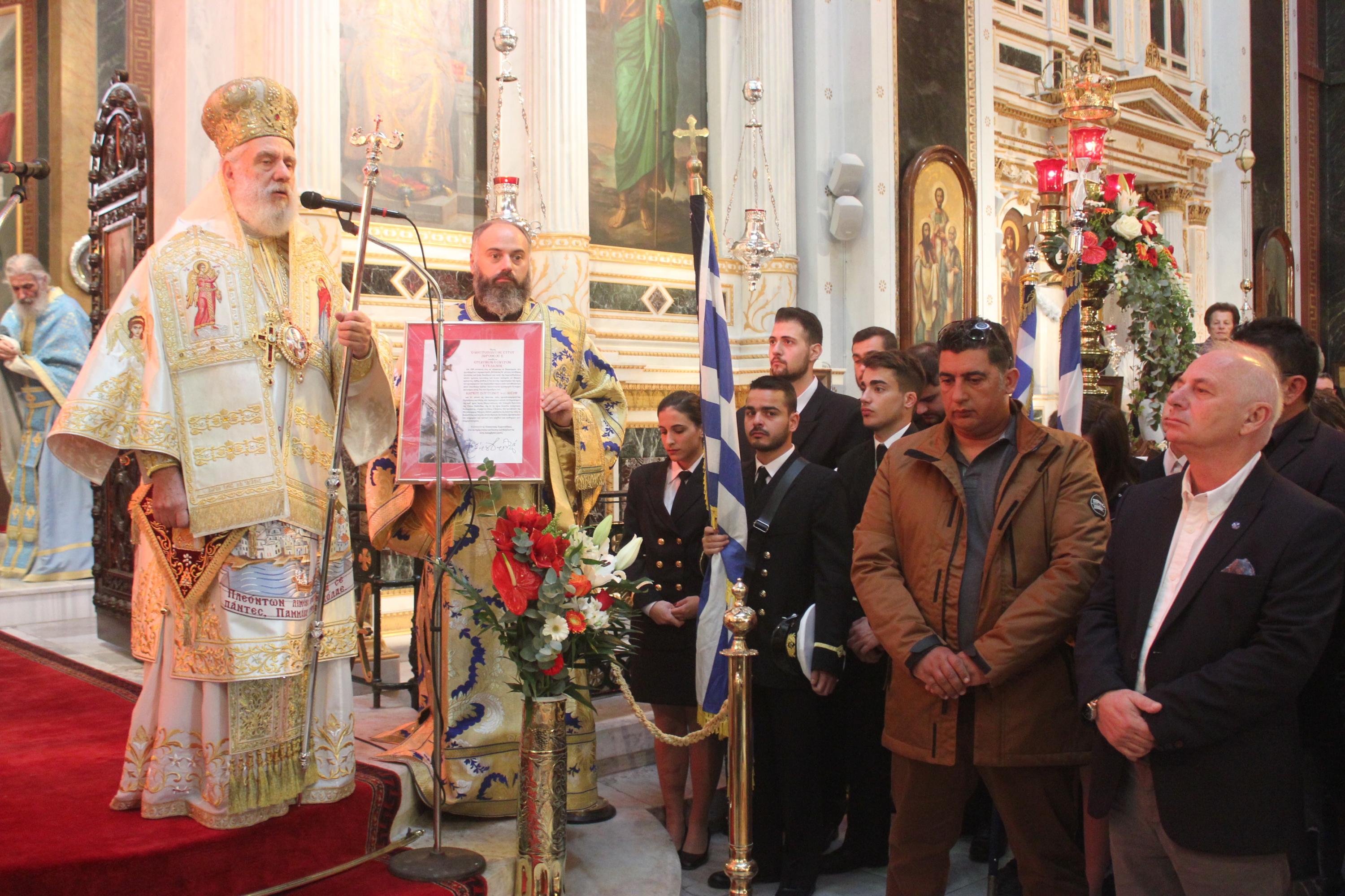 «Με ευλάβεια και τιμή συνοδεύουμε την εικόνα του Αγίου Νικολάου, ο οποίος δεν άφησε ποτέ την πόλη μας και το νησί μας. Κάθε φορά που τον παρακάλεσε η μάνα, η σύζυγος και το παιδί του ναυτικού να εξέλθει στη θάλασσα και να περπατήσει στα μαινόμενα και φουρτουνιασμένα κύματα, εκείνος θα τρέξει στις γέφυρες και τις μηχανές των πλοίων και θα κοιτάξει πιο πέρα από ό,τι τα ανθρώπινα μάτια, στον ορίζοντα των ελπίδων, των οραμάτων και των ονείρων, που ο κάθε άνθρωπος έχει για τη ζωή του», σημείωσε ο Μητροπολίτης Σύρου.