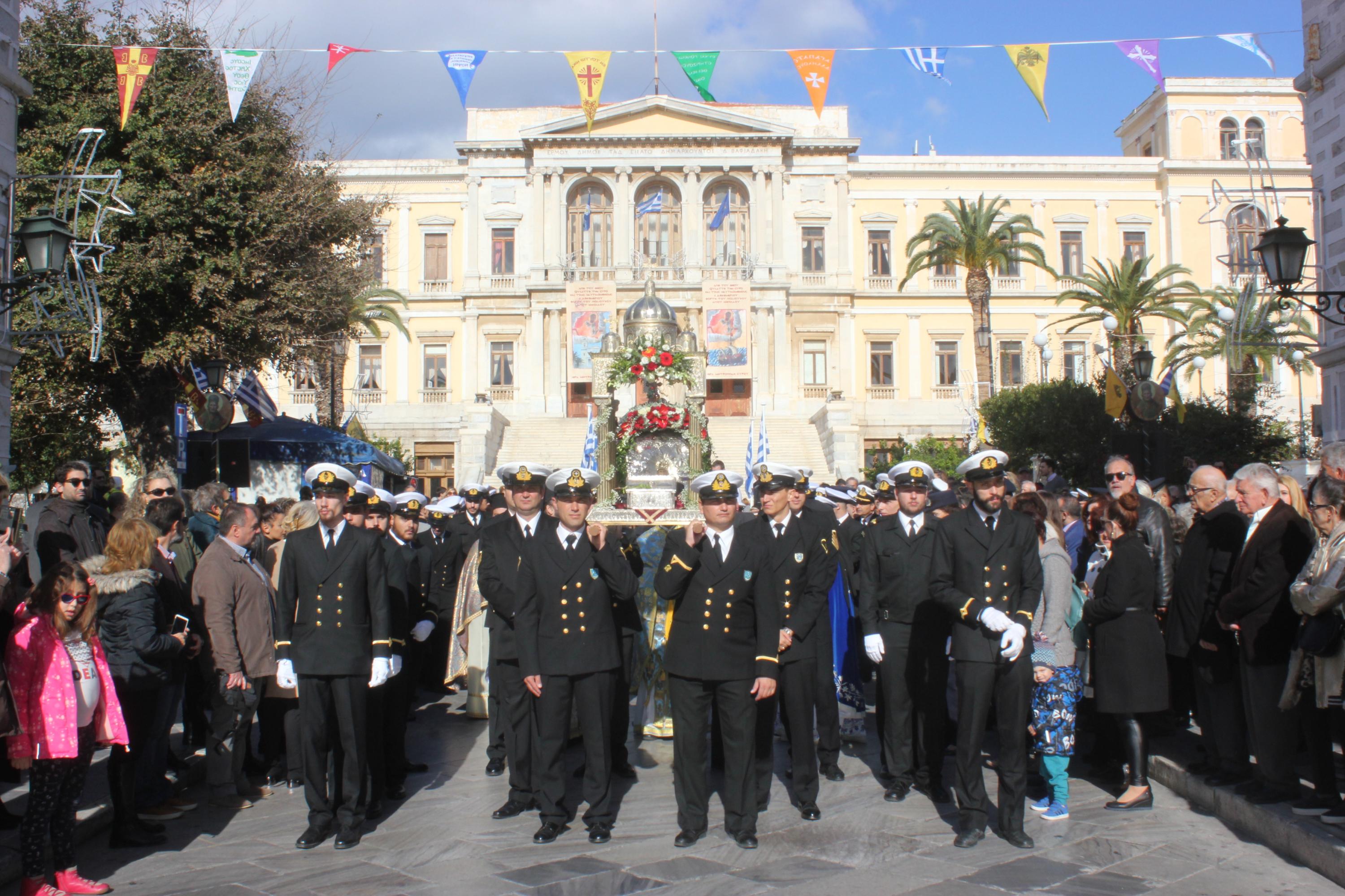 Στην Πλατεία Μιαούλη αναπέμφθηκε δέηση υπέρ των Ναυτικών, των εργαζομένων στις ναυπηγοεπισκευαστικές εγκαταστάσεις, των πλοιοκτητών και των πληρωμάτων των πλοίων, μετά το πέρας της οποίας ο Σεβασμιώτατος κ. Δωρόθεος Β' απηύθυνε τις ευχές του σε όλους τους Ναυτικούς και τους κατοίκους της Σύρου.