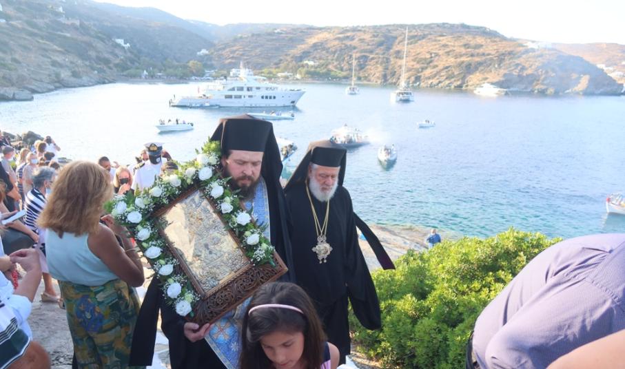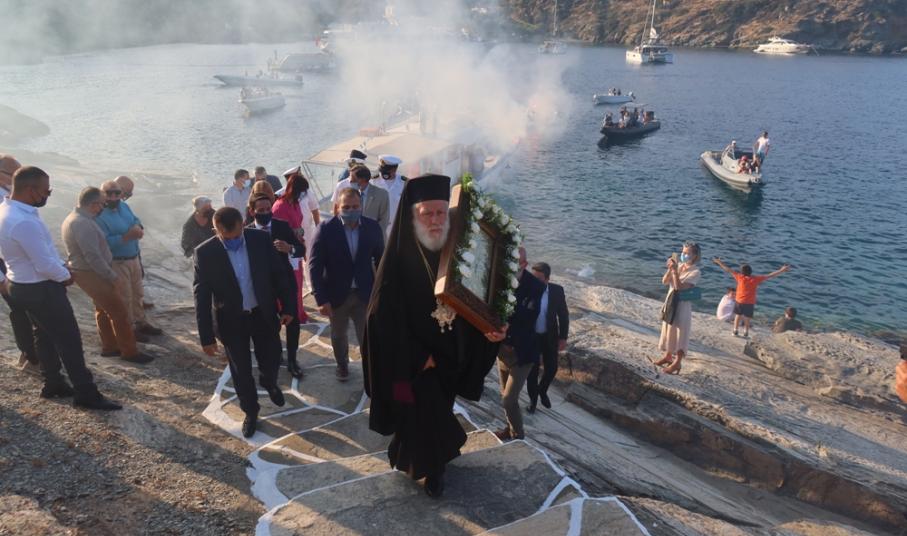Προηγουμένως, η αγία Εικόνα μεταφέρθηκε με αυτοκινητοπομπή από το σπίτι του Πανηγυρά κ. Αντωνίου Βενιού στον προβλήτα του Πλατύ Γυαλού, όπου επιβιβάσθηκε σε καΐκι, προκειμένου να μεταφερθεί, κατά το έθιμο, στον ιερό βράχο της Χρυσοπηγής.