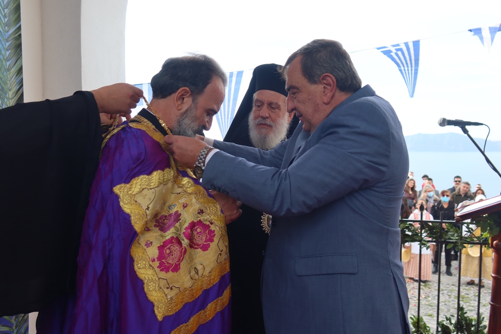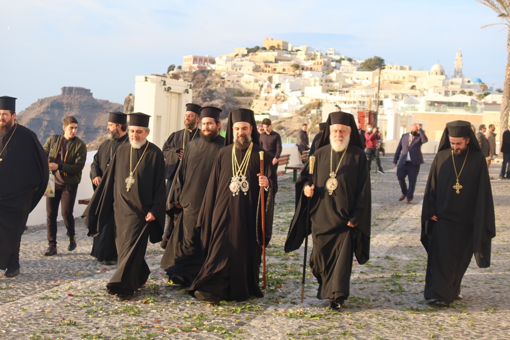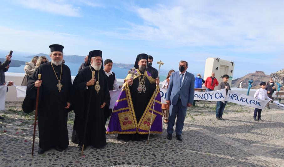 Στα προπύλαια του Ναού υπεδέχθη και προσεφώνησε τον Σεβασμιώτατο κ. Αμφιλόχιο ο Δήμαρχος Σαντορίνης και του προσέφερε Αρχιερατικό Εγκόλπιο.