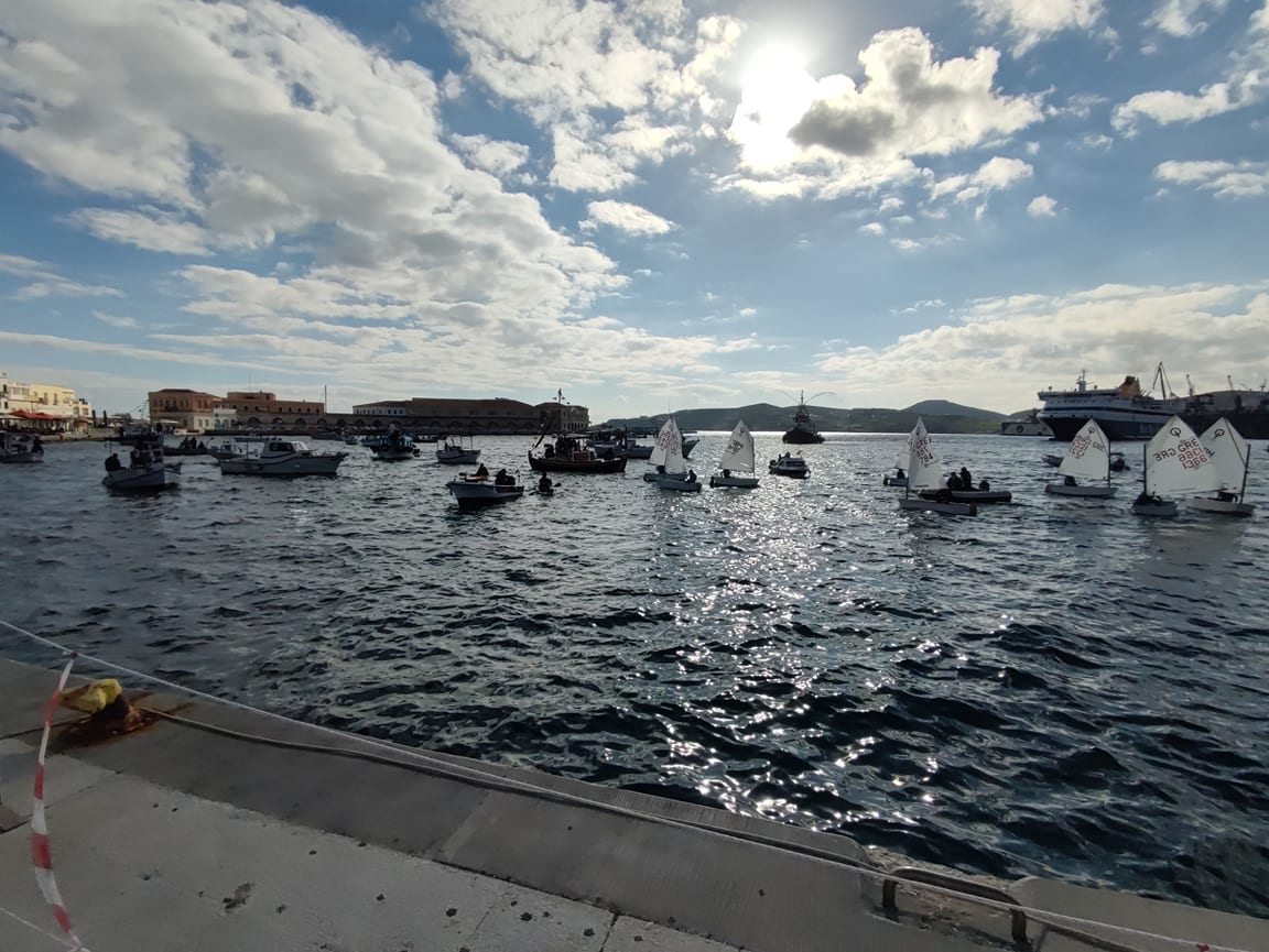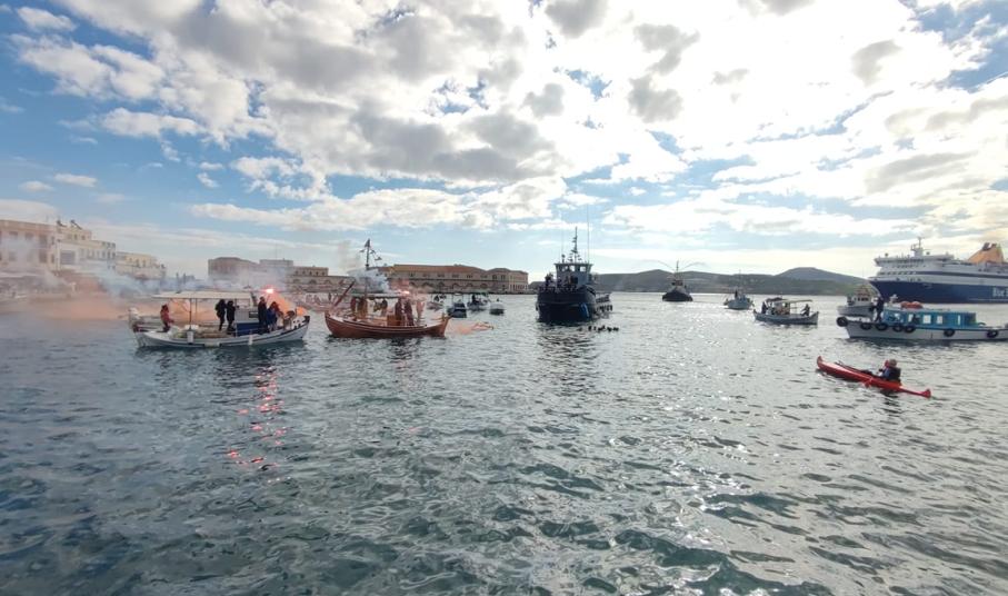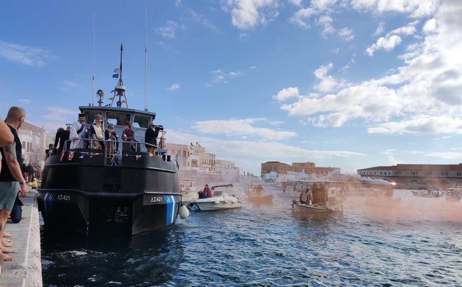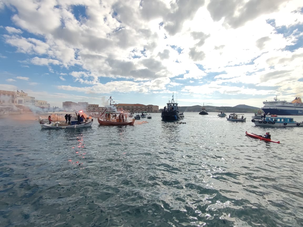 Η εικόνα στο λιμάνι της Ερμούπολης ήταν εντυπωσιακή με μικρά πλοιάρια, βάρκες, ρυμουλκά αλλά και τα πλοία της Blue Star Ferries και του ναυπηγείου να προβαίνουν σε επαναλαβανόμενους συριγμούς.
