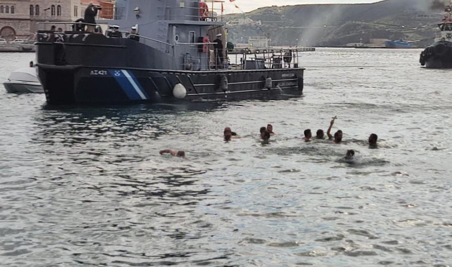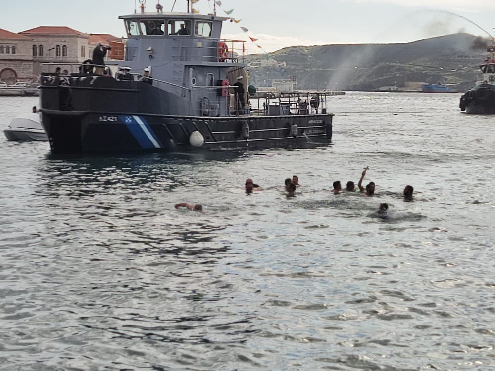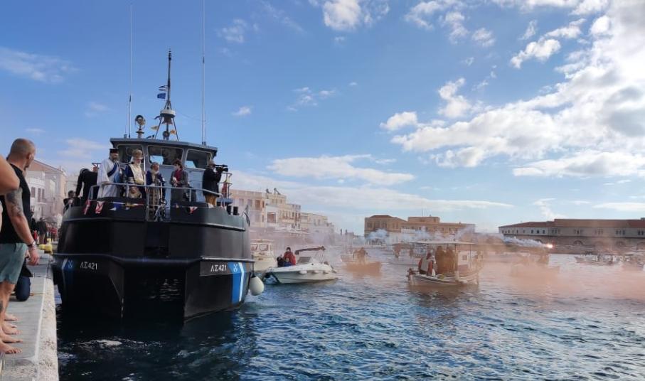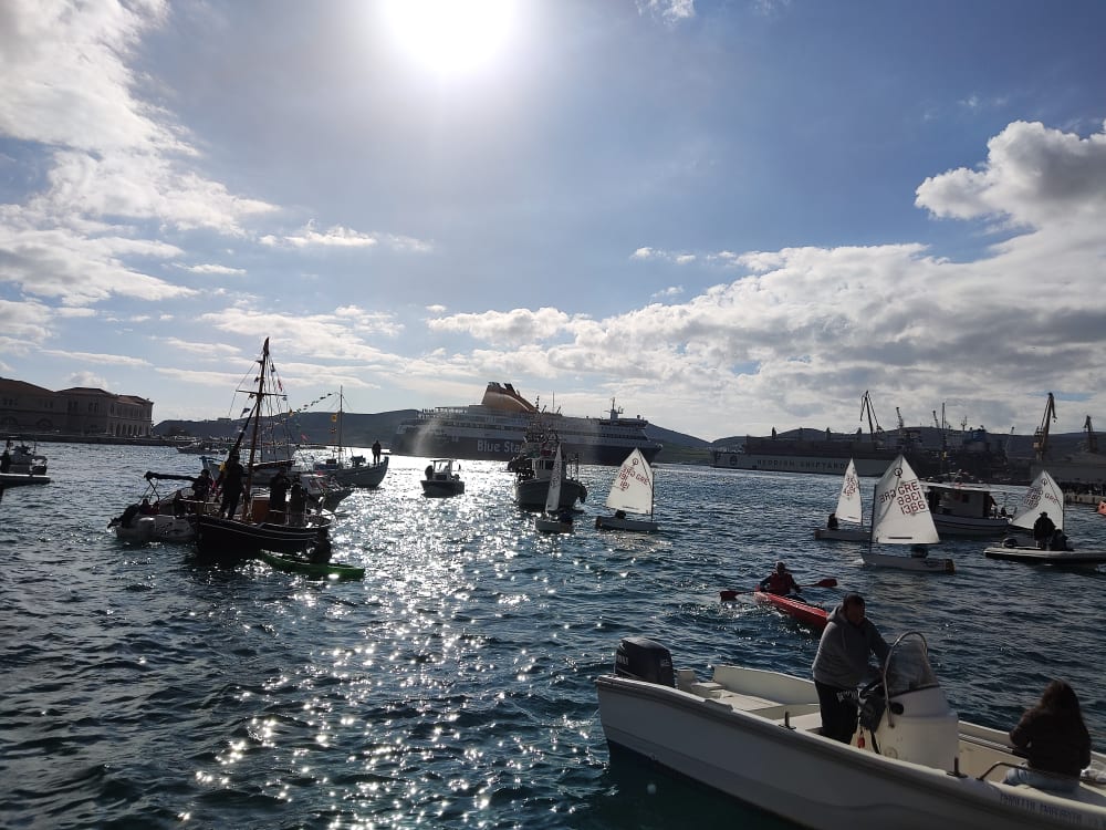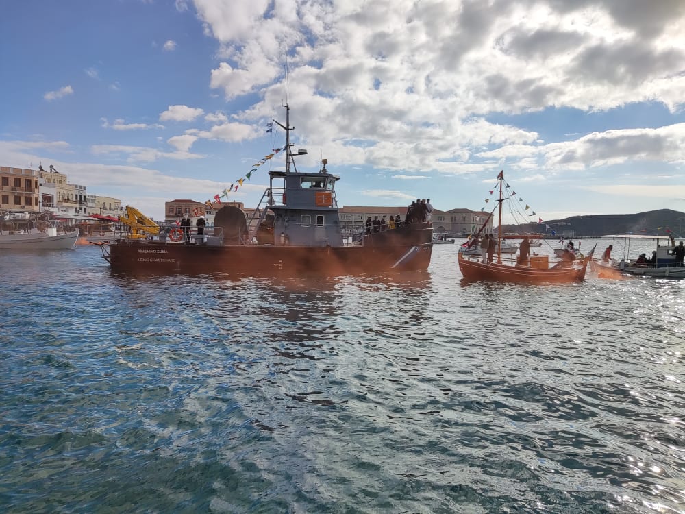 Η εικόνα στο λιμάνι της Ερμούπολης ήταν εντυπωσιακή με μικρά πλοιάρια, βάρκες, ρυμουλκά αλλά και τα πλοία της Blue Star Ferries και του ναυπηγείου να προβαίνουν σε επαναλαβανόμενους συριγμούς.