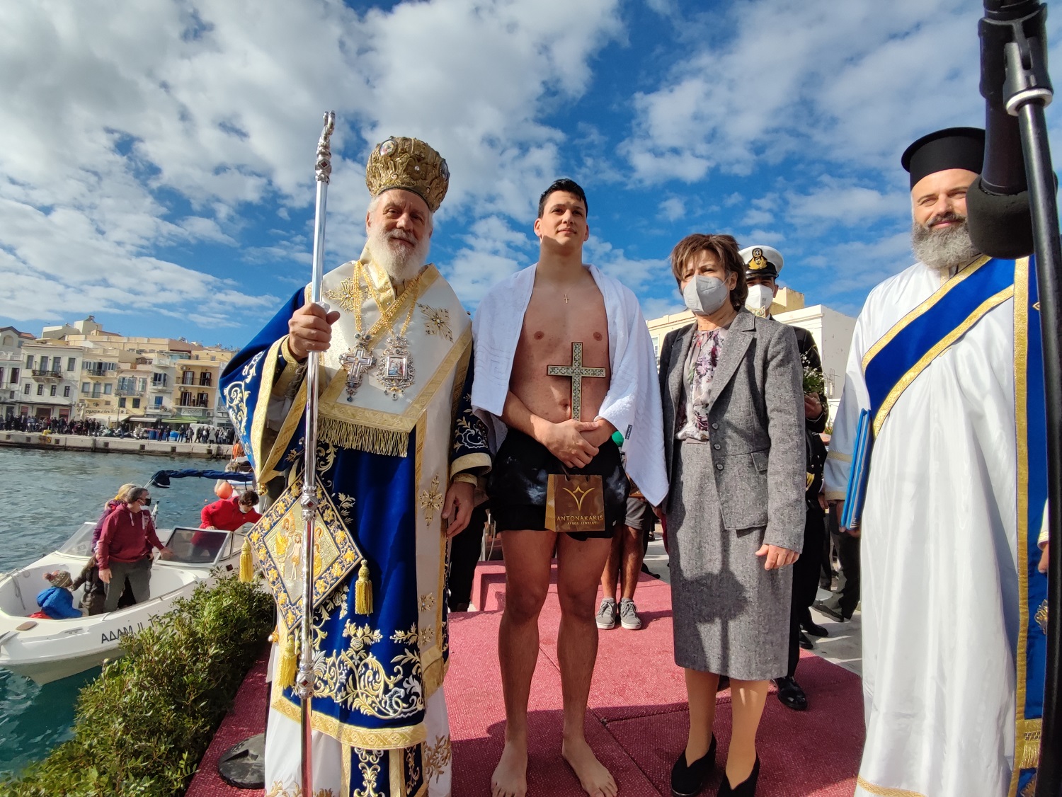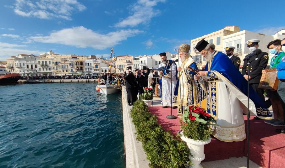 Αμέσως μετά το χαιρετισμό του, και ενόσω οι ιερείς έψαλλαν το απολυτίκιο των Θεοφανίων, ο Σεβασμιώτατος, συνοδευόμενος από την Γ.Γ. Αγροτικής Πολιτικής, κ. Χριστιάννα Καλογήρου, επιβιβάστηκε σε σκάφος του Λιμενικού Σώματος, από το οποίο πραγματοποίησε την καθιερωμένη ρίψη του Τιμίου Σταυρού τρεις φορές. Τις δύο πρώτες φορές, στη θάλασσα έπεσε ο μεταλλικός Σταυρός, προκειμένου να αγιαστεί ο βυθός, ωστόσο την τρίτη φορά και δεδομένου του βάθους του λιμένα στο σημείο αυτό, ερρίφθη επιπλέων ξύλινος σταυρός, για τους γενναίους κολυμβητές.