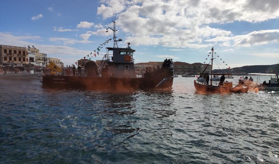 Στο λιμάνι της Ερμούπολης είχε λίγο νωρίτερα ελλιμενιστεί το Blue Star Chios, το οποίο με μανούβρες, ρίψη νερού και συριγμούς συμμετείχε στην από θαλάσσης απόδοση τιμών, μαζί με σκάφη του Ναυτικού Ομίλου Σύρου, αλιευτικά σκάφη, πλοιάρια του Λιμενικού Σώματος και του ναυπηγείου Σύρου, τα οποία με συριγμούς και βεγγαλικά, δημιούργησαν μία κατανυκτική ατμόσφαιρα.