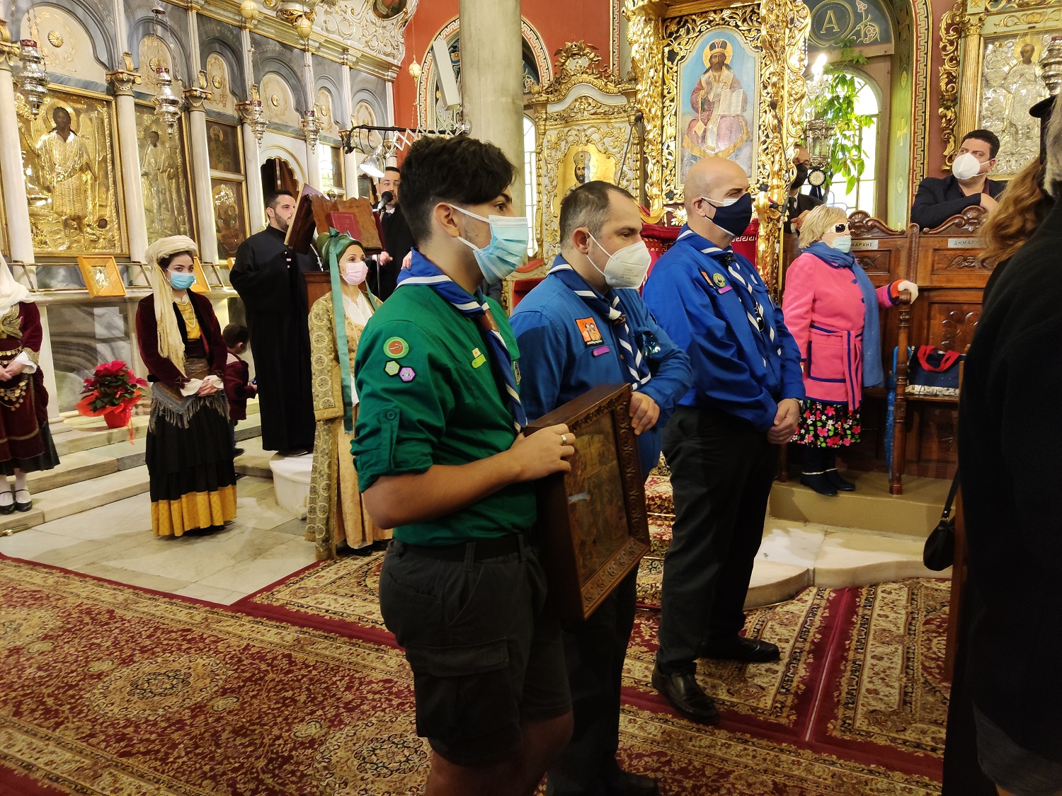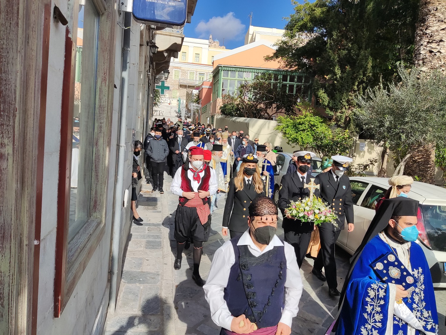 Με παραδοσιακές φορεσιές τίμησαν την τελετή μέλη του Λυκείου Ελληνίδων Σύρου, ενώ συμμετείχαν μέλη του Σώματος Ελλήνων Προσκόπων και σπουδαστές της ΑΕΝ Σύρου, που επίσης συνόδευσαν και τη λιτανευτική πομπή του Τιμίου Σταυρού, στη συνέχεια.