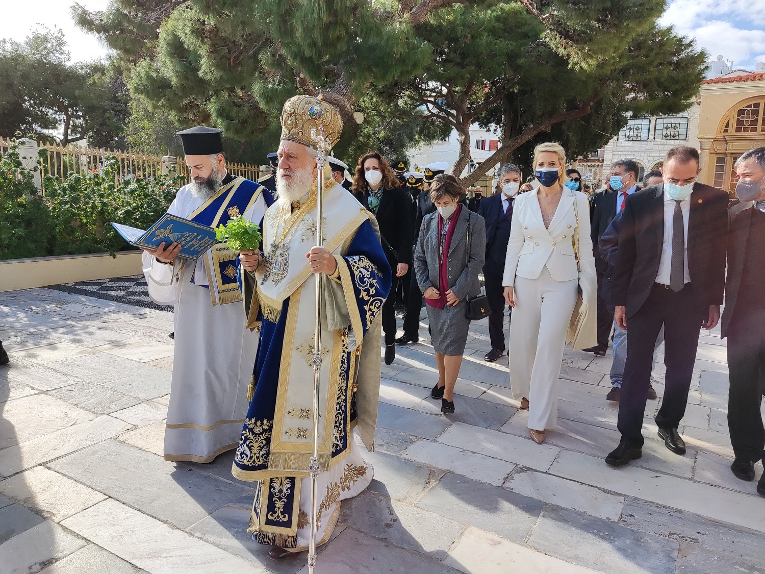 Ακολούθησε η τελετή του Μεγάλου Αγιασμού, ενώ στη συνέχεια από τον Μητροπολιτικό Ναό της Σύρου ξεκίνησε η λιτανευτική πομπή του Τιμίου Σταυρού, τον οποίο μετέφεραν άνδρες του Λιμενικού Σώματος, σε διακοσμημένο με άνθη δίσκο, συνοδευόμενοι από μέλη του Λυκείου Ελληνίδων Σύρου, του Σώματος Ελλήνων Προσκόπων, μελών του τοπικού κλήρου, εκπροσώπων των τοπικών αρχών και πιστών.