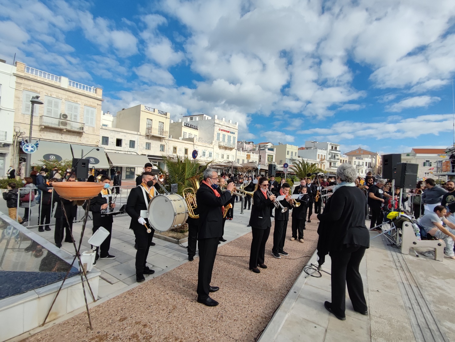 Η λιτανεία κατέληξε στο μνημείο της Εθνικής Αντιστάσεως, στο λιμάνι της Ερμούπολης, υπό τα εμβατήρια της Φιλαρμονικής του Δήμου Σύρου – Ερμούπολης, η οποία με την ανάκρουση των εμβατηρίων, προσέδωσε ακόμη μεγαλύτερη λαμπρότητα στον εορτασμό.