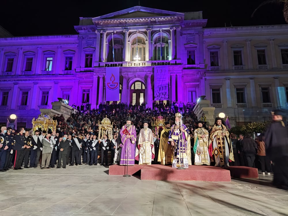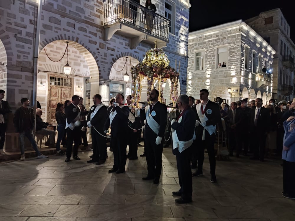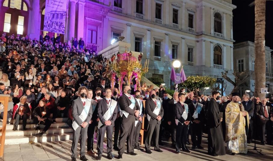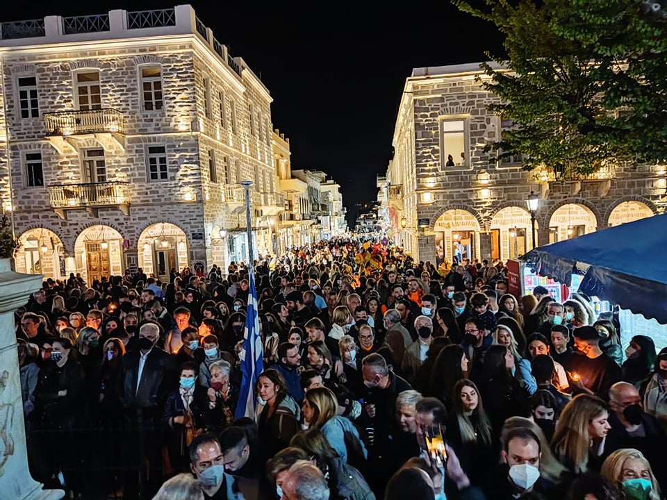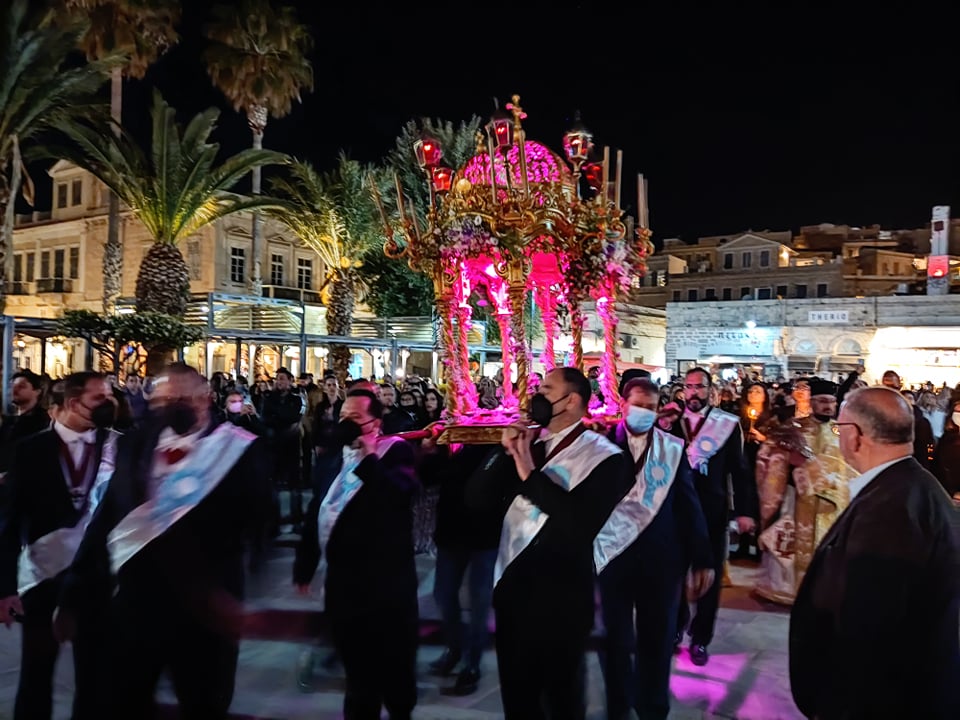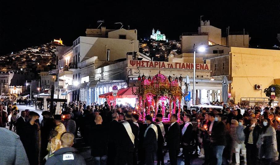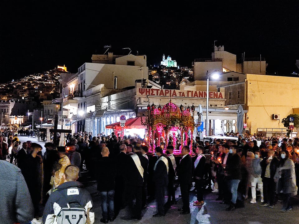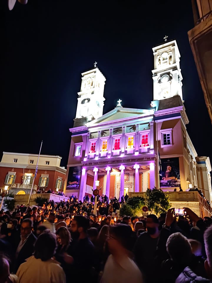 Οι πιστοί κατέκλυσαν τους ναούς, ενώ πλημμυρισμένη από κόσμο ήταν και η πλατεία Μιαούλη, με το φωτισμένο Δημαρχιακό μέγαρο, το φως των λαμπάδων στα χέρια του κόσμου και τα πένθιμα εμβατήρια από τη Φιλαρμονική του Δήμου Σύρου - Ερμούπολης, να δημιουργούν μία μυσταγωγική ατμόσφαιρα, που θύμιζε την προ-covid εποχή.