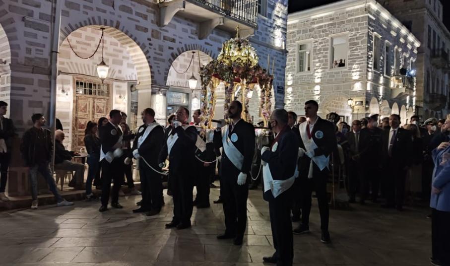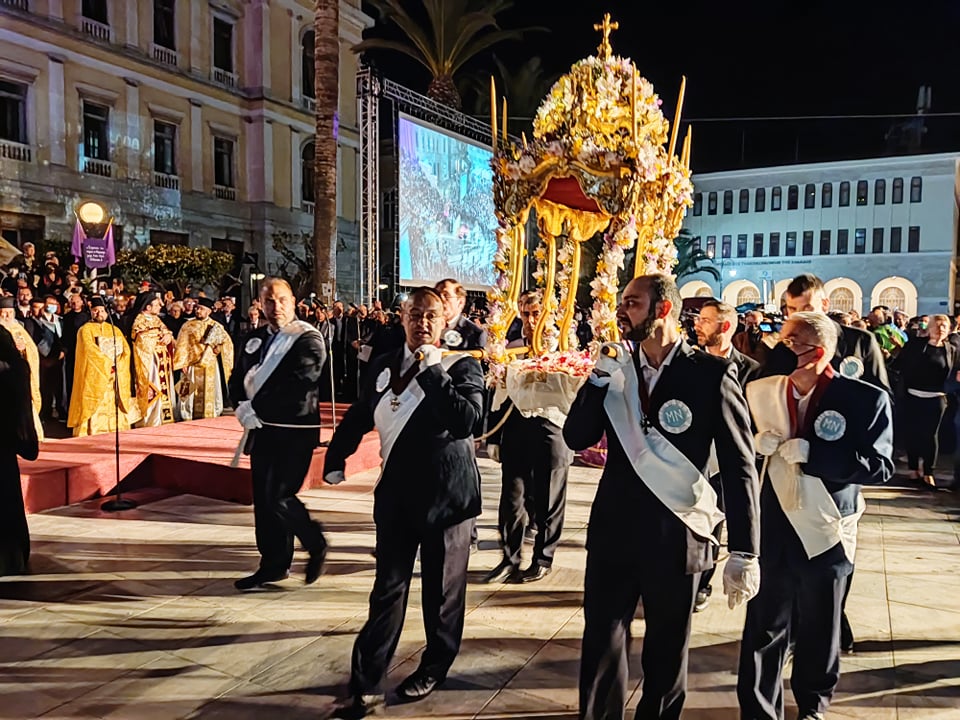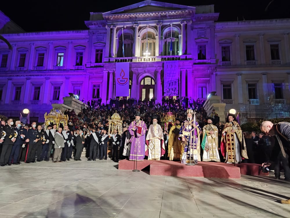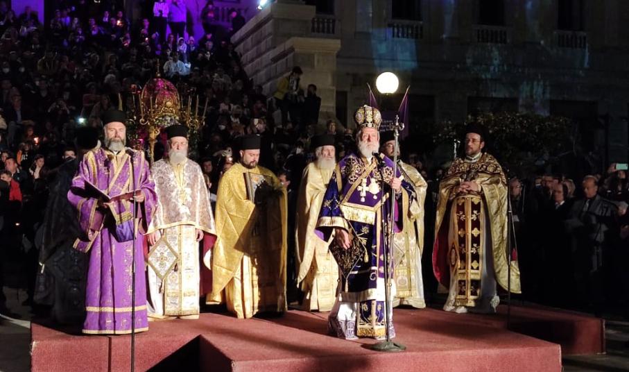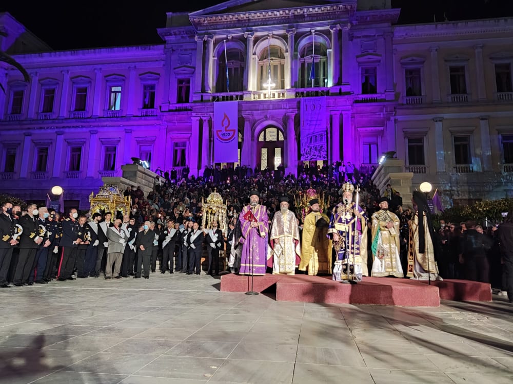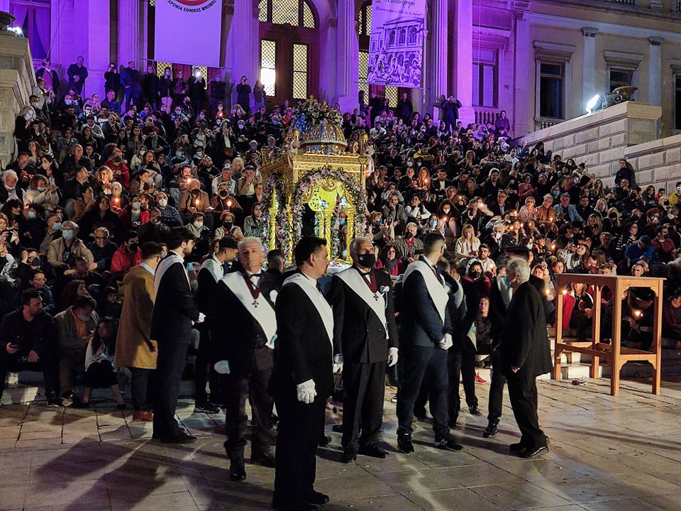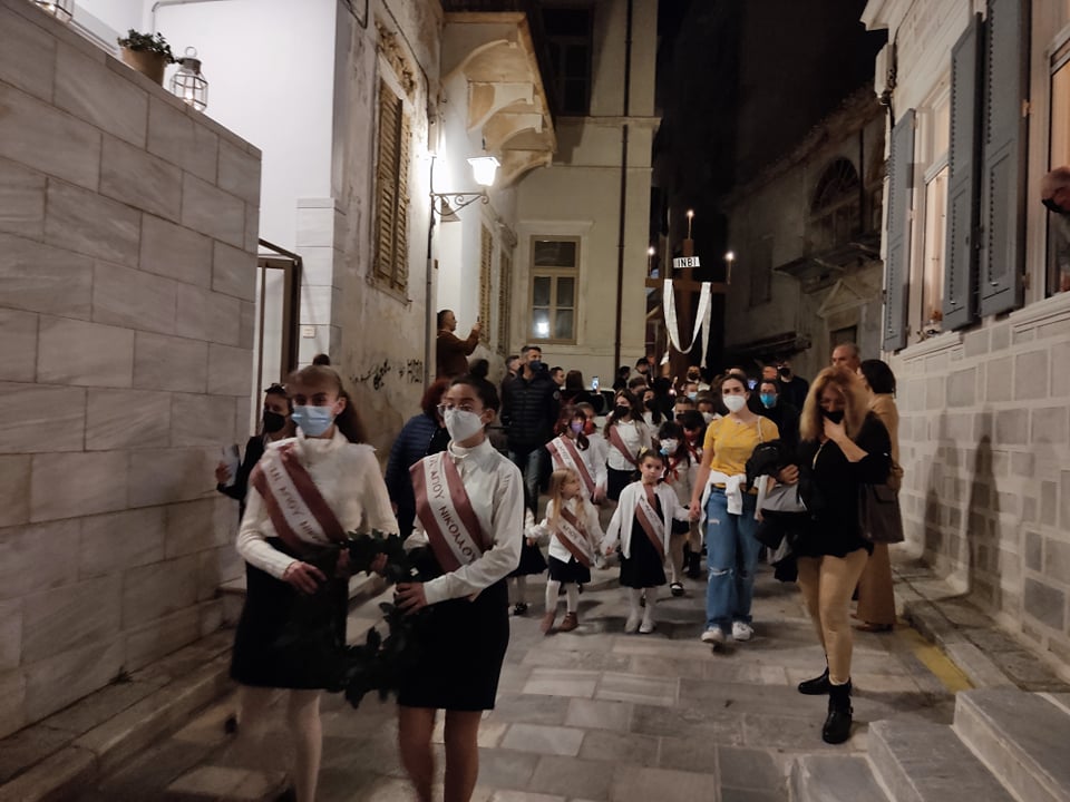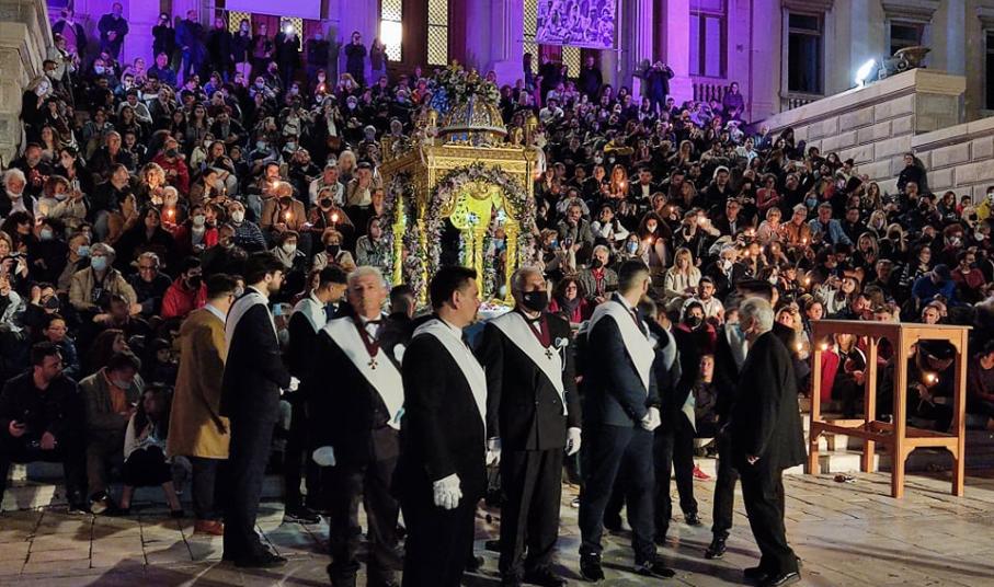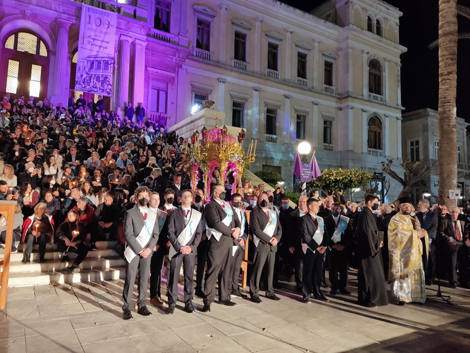 Οι πιστοί κατέκλυσαν τους ναούς, ενώ πλημμυρισμένη από κόσμο ήταν και η πλατεία Μιαούλη, με το φωτισμένο Δημαρχιακό μέγαρο, το φως των λαμπάδων στα χέρια του κόσμου και τα πένθιμα εμβατήρια από τη Φιλαρμονική του Δήμου Σύρου - Ερμούπολης, να δημιουργούν μία μυσταγωγική ατμόσφαιρα, που θύμιζε την προ-covid εποχή.