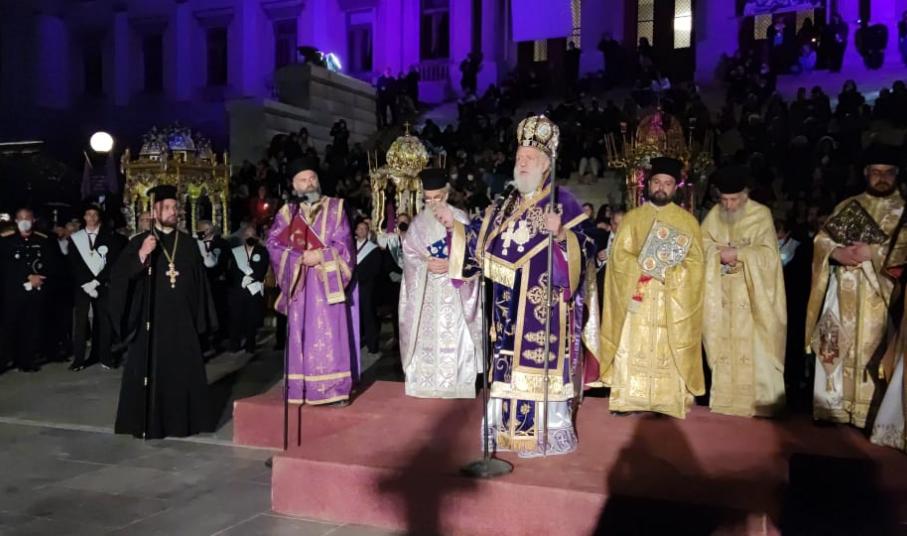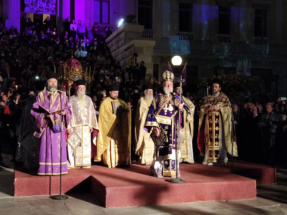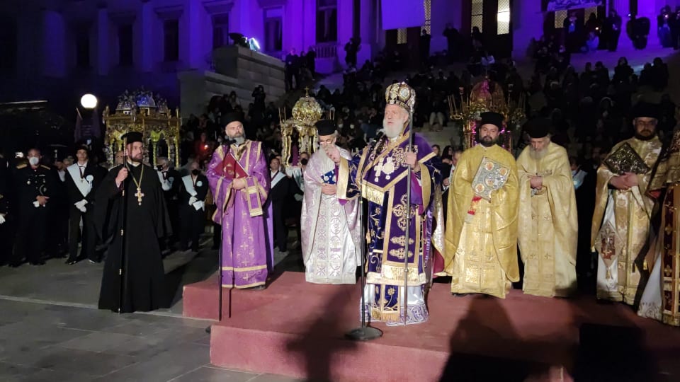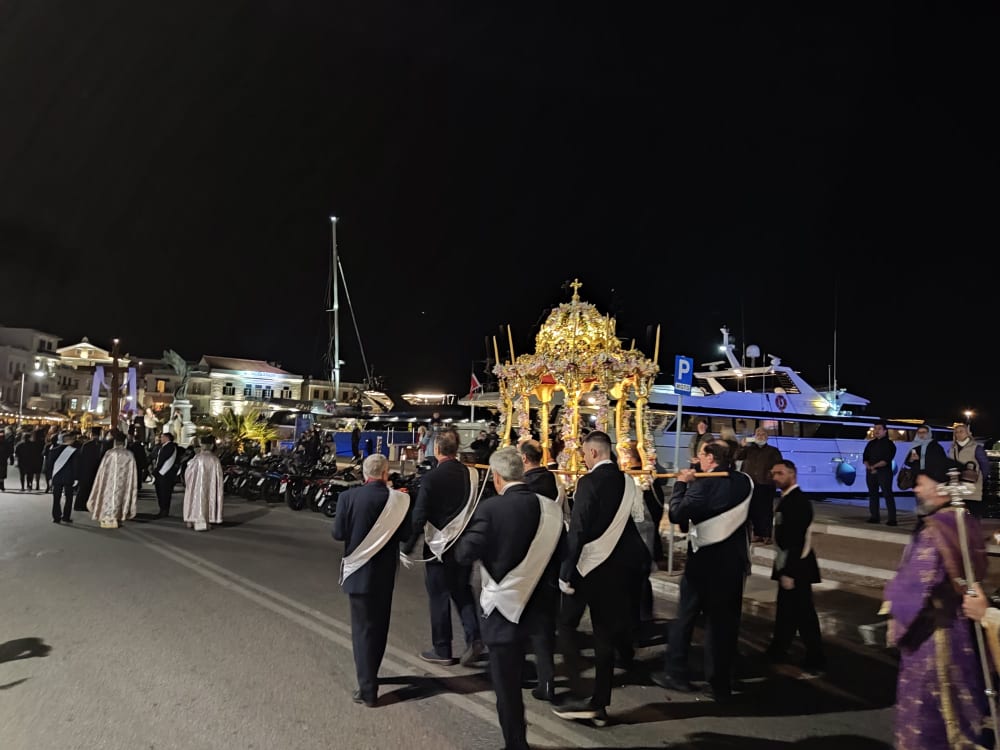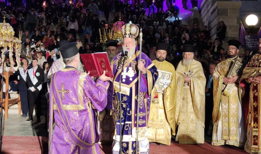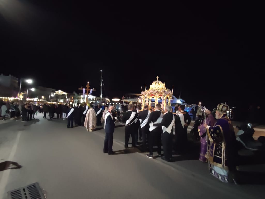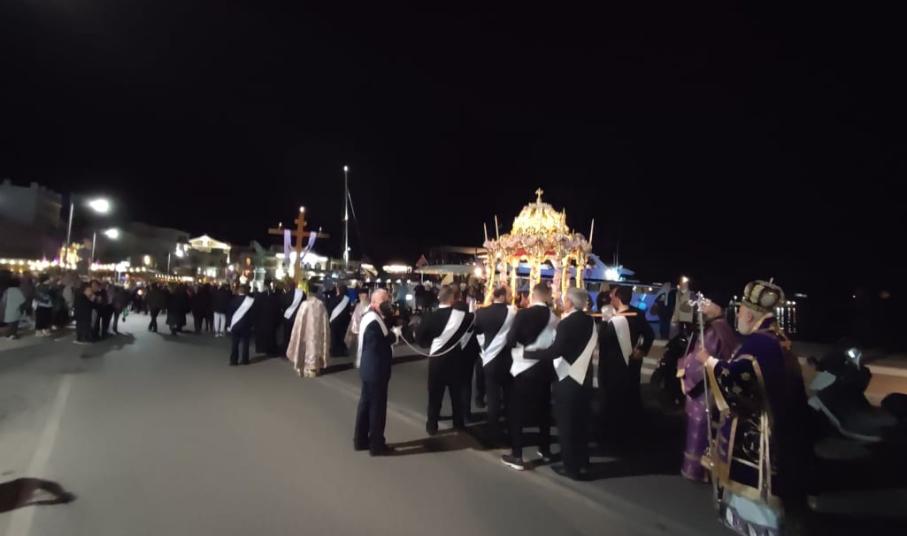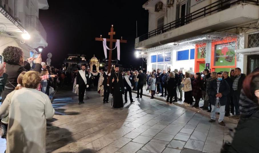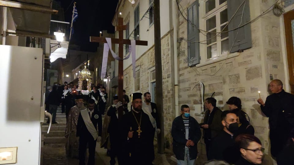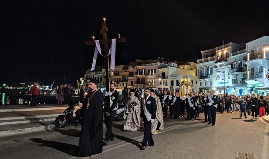 Έπειτα από την ολοκλήρωση των ακολουθιών της Μ. Παρασκευής στους Ιερούς Ναούς της Μεταμορφώσεως του Σωτήρος, του Αγίου Νικολάου και της Κοιμήσεως της Θεοτόκου, οι επιτάφιοι λιτανεύτηκαν με συγκίνηση και κατάνυξη και συναντήθηκαν στην κατάμεστη πλατεία Μιαούλη, όπου ο Σεβασμιώτατος Μητροπολίτης Σύρου, κ.κ. Δωρόθεος Β' ανέπεμψε δέηση, ενώ στο μήνυμά του, ο Ποιμενάρχης των νησιών, συνέδεσε τα μηνύματα που αποκομίζει κανείς από το Θείο Δράμα, με τις σύγχρονες συγκυρίες που θυμίζουν Γολγοθά, τονίζοντας όμως, πως όπως πρώτος δίδαξε ο Χριστός, υπομένοντας στις πνευματικές και σωματικές κακουχίες διατηρώντας υψηλά την πίστη και την αγάπη στο Θεό,δεν υπάρχει θάνατος, αλλά μόνο ζωή.
