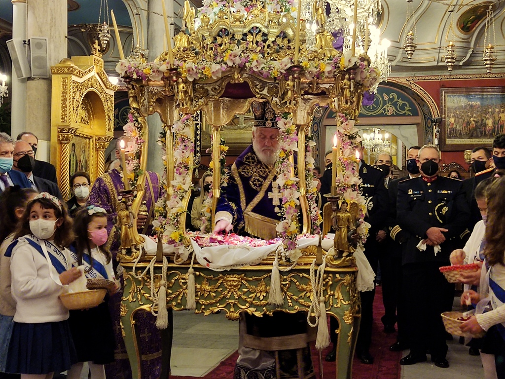Μετά την προσέλευση και των τριών επιταφίων στην πλατεία Μιαούλη, κατόπιν του ανακρούσματος εμβατηρίων από την Φιλαρμονική του Δήμου και απόδοση ύμνων από την χορωδία του Ι.Ν. Αγίου Νικολάου, ο Σεβασμιώτατος Μητροπολίτης Σύρου, κ. Δωρόθεος Β’, ανέπεμψε δέηση.