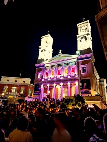Εκατοντάδες ήταν και οι πιστοί που συγκεντρώθηκαν στο κέντρο της πόλης, προκειμένου να παρακολουθήσουν την Ακολουθία του Επιταφίου στους Ι.Ν. Μεταμορφώσεως του Σωτήρος, Κοιμήσεως της Θεοτόκου και Αγίου Νικολάου και να ακολουθήσουν τη λιτανεία έως την πλατεία Μιαούλη, όπου πραγματοποιήθηκε με κάθε επισημότητα και λαμπρότητα η συνάντηση των τριών επιταφίων, υπό το φωταγωγημένο Δημαρχιακό Μέγαρο της Ερμούπολης.