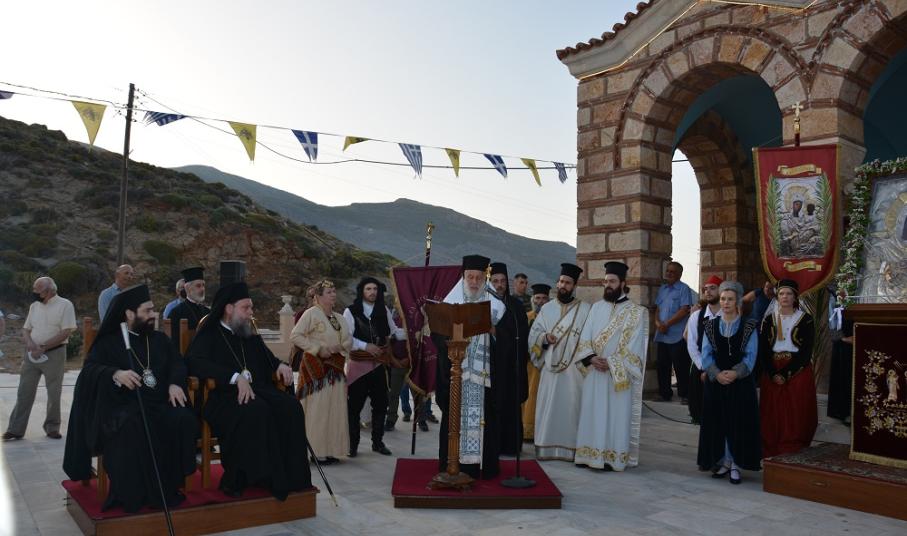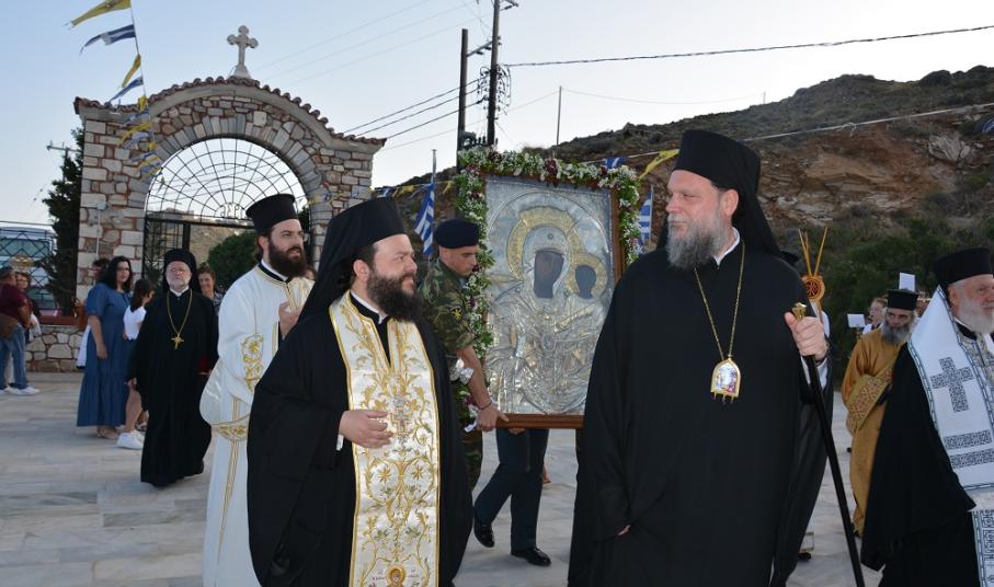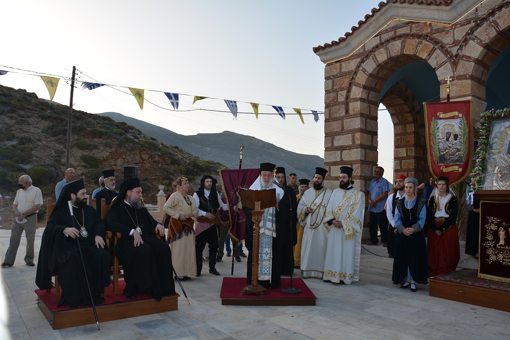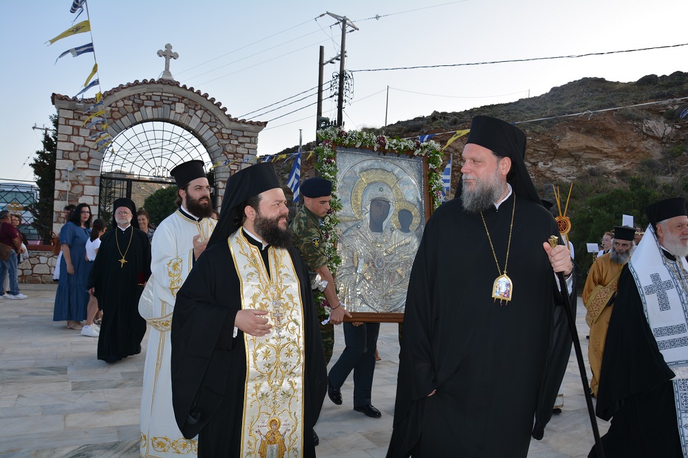 Κλείνοντας, ο κ. Δωρόθεος ευχαρίστησε όσους ανταποκρίθηκαν στην πρόσκληση και τίμησαν με την παρουσία τους την ξεχωριστή αυτή μέρα για το νησί, η οποία έχει αναγνωρισθεί ως τοπική εορτή μέσω βασιλικού διατάγματος από το 1937. Στη συνέχεια, κι αφού η ιερή εικόνα, ο κλήρος και οι πιστοί μεταφέρθηκαν στο εσωτερικό της εκκλησίας, τελέσθηκε Τρισαρχιερατικός Εσπερινός.
