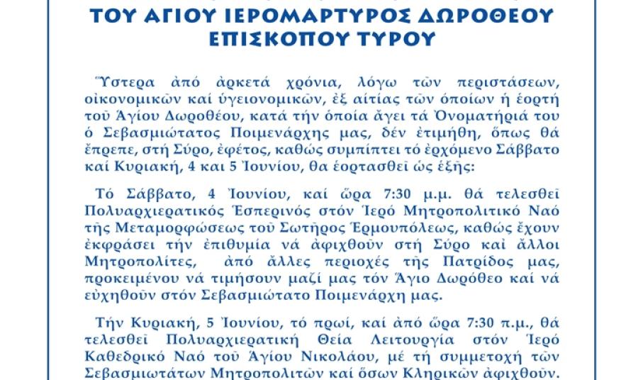 Εορτασμός της Ιεράς Μνήμης του Αγίου Ιερομάρτυρος Δωροθέου Τρίτη 31 Μαΐου 2022 - 13:21 Από την Ιερά Μητρόπολη Σύρου εκδόθηκε η παρακάτω ανακοίνωση: Διαφήμιση #Εκκλησιαστικά