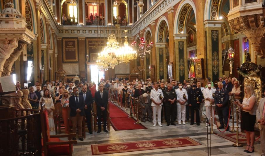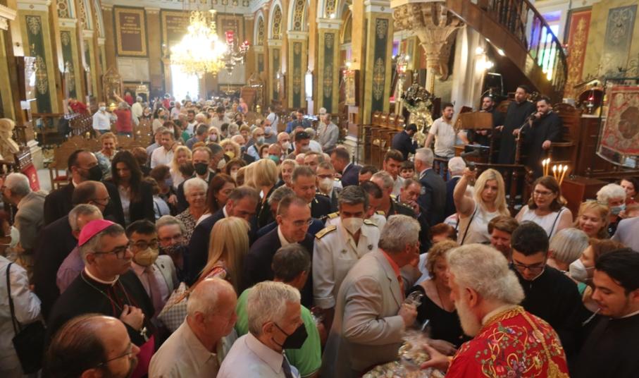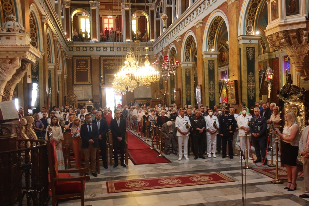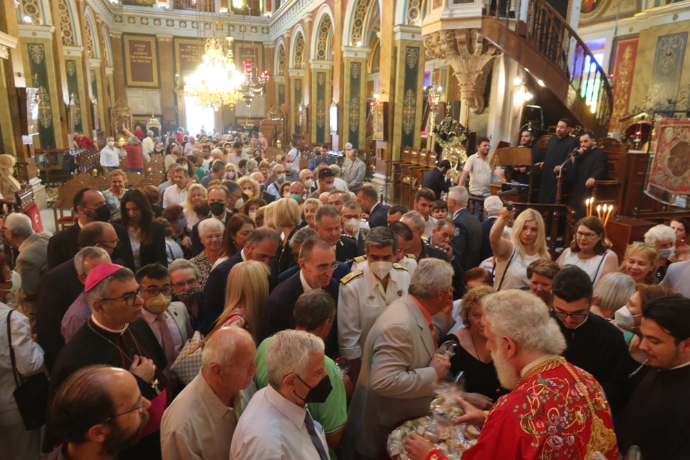 Στον Ιερό Καθεδρικό Ναό του Αγίου Νικολάου Ερμουπόλεως τελέσθηκε σήμερα το πρωί, επί τη ιερά μνήμη του Αγίου Ιερομάρτυρος Δωροθέου, Επισκόπου Τύρου, προσωπικού προστάτου κληρωθέντος του Σεβασμιωτάτου κ. Δωροθέου Β΄ , Πολυαρχιερατική Θεία Λειτουργία, προεξάρχοντος του Σεβασμιωτάτου Μητροπολίτου Πειραιώς και Φαλήρου κ. Σεραφείμ, συνιερουργούντων αυτώ των Σεβασμιωτάτων Ιερισσού κ. Θεοκλήτου, Τρίκκης κ. Χρυσοστόμου, Λαγκαδά κ. Πλάτωνος και Θήρας κ. Αμφιλοχίου, Εφημερίων από τη Σύρο και τα άλλα νησιά της Ιεράς Μητροπόλεως, των Κυκλάδων, την Αθήνα, τη Θεσσαλονίκη και άλλα μέρη της Ελλάδος, του Ηγουμένου της Ιεράς Μονής Παναγίας Τουρλιανής Μυκόνου, Αρχιμ. Αλεξίου Παπαδόπουλου, του Αρχιερατικού Επιτρόπου Άνω Μεράς και Παλαιοκάστρου Πρωτοπρ. Βασιλείου Τζανιδάκη, και με την παρουσία της Ηγουμενευούσης της Ιεράς Μονής Ζωοδόχου Πηγής Άνδρου, Μοναχής Παρθενίας, η οποία διεκόμισε λειψανοθήκη, του Επισκόπου κ. Ιωσήφ, των Βουλευτών Κυκλάδων Νέας Δημοκρατίας κ.κ. Ιω. Βρούτση και Φιλ. Φόρτωμα και της κας Αικατ. Μονογυιού , του Χωρικού Αντιπεριφερειάρχη Κυκλάδων κ. Γ. Λεονταρίτη, του Δημάρχου Σύρου- Ερμούπολης κ. Νικ. Λειβαδάρα, Αντιδημάρχων, των Προέδρων των Τοπικών Κοινοτήτων Ερμούπολης και Άνω Σύρου, του επικεφαλής της μείζονος Αντιπολιτεύσεως στο Δήμο, Περιφερειακών και Δημοτικών Συμβούλων, της Προέδρου Εφετών Αιγαίου, του Διοικητού της 6ης Περιφέρειας Λιμενικού Σώματος κ. Γκύζη, του Λιμενάρχη Σύρου κ. Βαμβακούση, των Προϊσταμένων των Αστυνομικών και Πυροσβεστικών Υπηρεσιών και του Τάγματος Εθνοφυλακής, του Διοικητή της Ναυτικής Ακαδημίας, του Υποδιοικητή της Ναυτικής Βάσης Αγκαθωπών, του Προέδρου του Εργατικού Κέντρου Κυκλάδων,του Προέδρου του Επιμελητηρίου Κυκλάδων του Προέδρου του Σωματείου Συνταξιούχων ΙΚΑ κ. Χαρίτου, της Προέδρου της Αδελφότητος Ανωμεριτών Μυκόνου, και πολλών πιστών από τη Σύρο, την Τήνο, τη Μύκονο και την Άνδρο