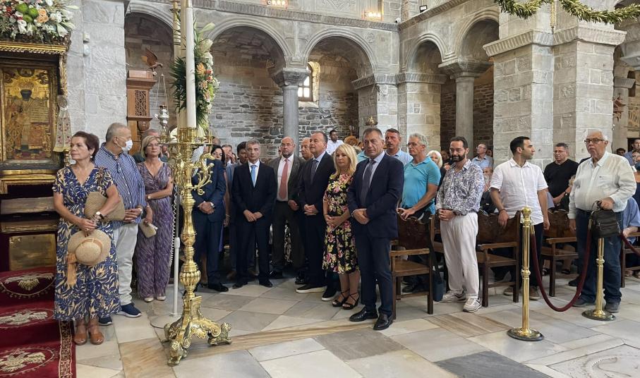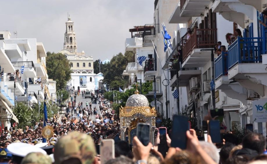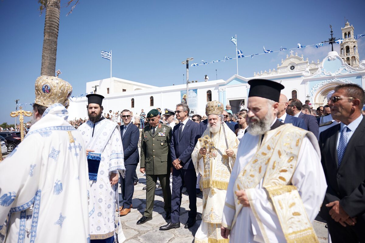 Οι εορτασμοί για την Κοίμηση της Θεοτόκου κορυφώθηκαν στην Τήνο με τη λιτανεία της εικόνας της Παναγίας. Χιλιάδες πιστοί, ανάμεσά τους και ο πρωθυπουργός, Κυριάκος Μητσοτάκης, στάθηκαν με δέος και σεβασμό μπροστά στην εικόνα της Παναγίας με τον κεντρικό δρόμο από το λιμάνι έως τον ιερό ναό της Παναγίας να είναι γεμάτος. Ο Κυριάκος Μητσοτάκης ακολούθησε την λιτανεία της ιερής εικόνας της Παναγίας μαζί με τους μητροπολίτες Σύρου - Τήνου Δορώθεο, Σερβίων και Κοζάνης Παύλο, Σερρών και Νιγρίτης Θεολόγο, Κερκύρας Παξών και Διαποντίων Νήσων Νεκτάριο.