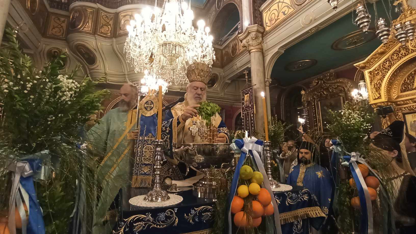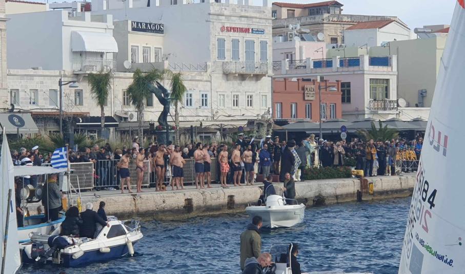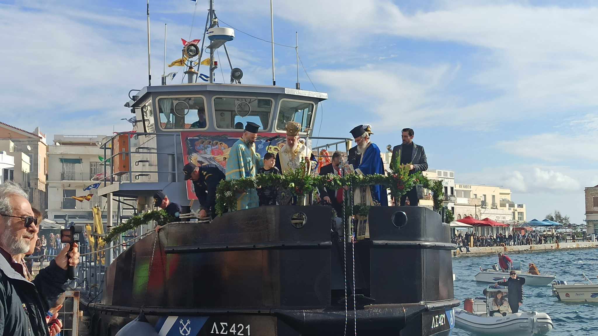 Κάτω από τον ηλιόλουστο ουρανό της πρωτεύουσας των Κυκλάδων και με τη συμμετοχή πλήθους πιστών, τελέστηκε σήμερα Σάββατο ο εορτασμός των Θεοφανείων στη Σύρο, αλλά και ο αγιασμός των υδάτων στο λιμάνι της Ερμούπολης, μπροστά από το μνημείο της Εθνικής Αντίστασης.