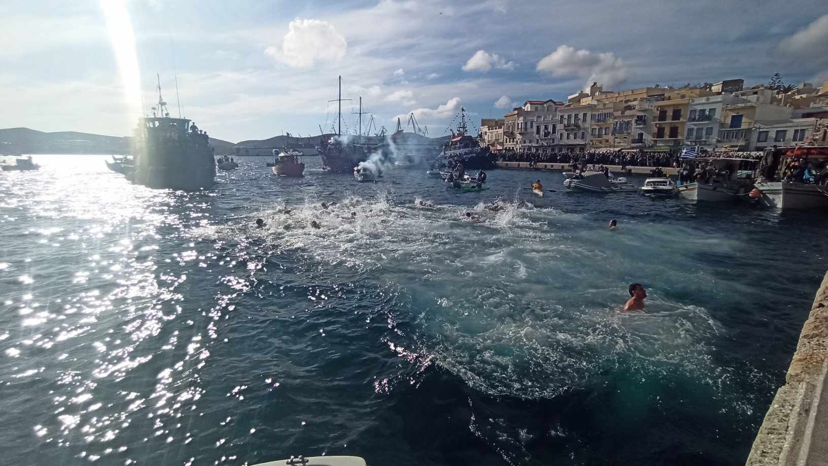 Εκεί, ο μητροπολίτης Δωρόθεος πραγματοποίησε τον Αγιασμό των υδάτων και εν συνεχεία επιβιβάσθηκε σε σκάφος του Λιμενικού Σώματος, από όπου έριξε τον Τίμιο Σταυρό απέναντι από την εξέδρα που είχε στηθεί στο μνημείο της Εθνικής Αντίστασης.