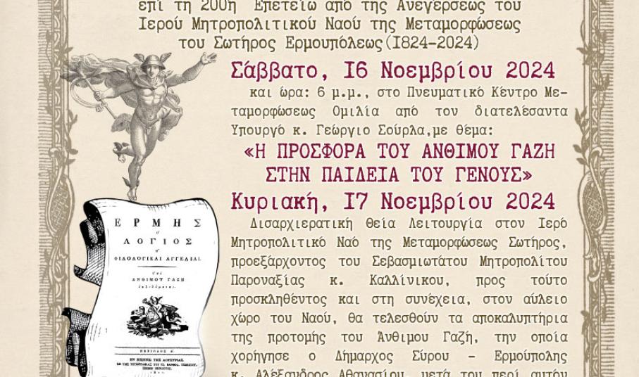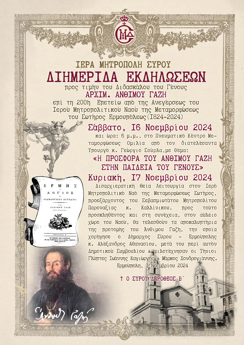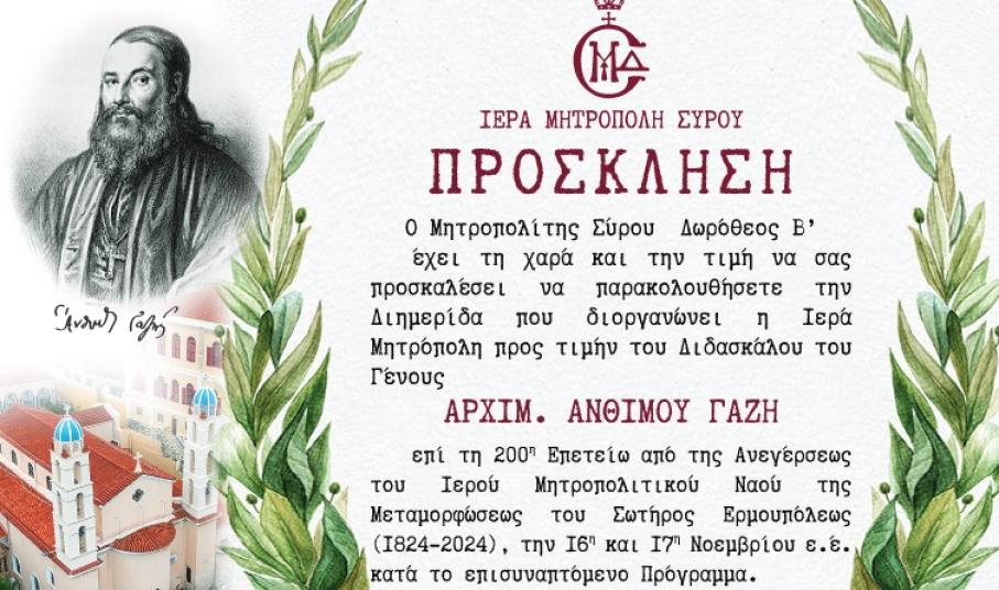 Ο μητροπολίτης Σύρου Δωρόθεος Β΄ έχει την χαρά να σας προσκαλέσει να παρακολουθήσετε τη διημερίδα που διοργανώνει η Ιερά Μητρόπολη Σύρου προς τιμήν του διδασκάλου του Γένους, Άνθιμου Γαζή επί τη 200η επέτειο από την ανέγερση του μητροπολιτικού ναού της Μεταμοφώσεως του Σωτήρος Ερμουπόλως.
