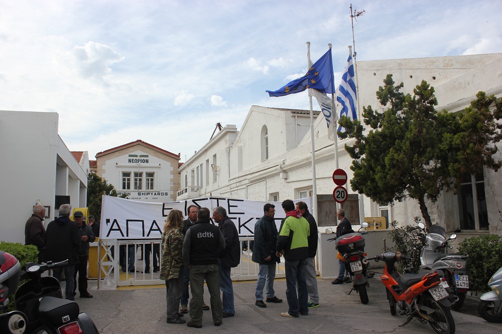 Με γνώμονα αυτές τις δηλώσεις έγινε γενική συνέλευση στις 17/4 στο Ναυπηγείο και αποφασίστηκε με ποσοστό 82,7% μέσα σε μυστική ψηφοφορία να απέχουμε από την εργασία μας από σήμερα και μέχρι να καταβληθούν τα μισά τουλάχιστον από τα οφειλόμενα και εφόσον καθίσουμε στο τραπέζι των διαπραγματεύσεων ώστε να αποφασιστεί και συμφωνηθεί το μέλλον των πληρωμών μας και γενικότερα του ναυπηγείου με νέα συλλογική σύμβαση εργασίας.