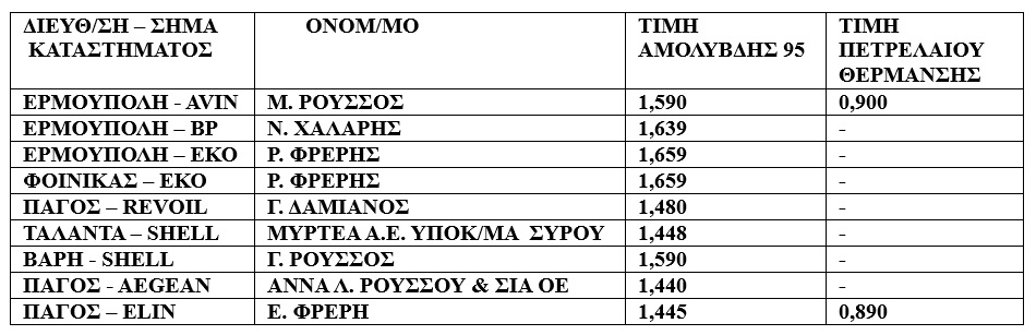Τις τιμές πώλησης της αμόλυβδης βενζίνης και του πετρελαίου θέρμανσης που διατίθεται από τα πρατήρια υγρών καυσίμων της Σύρου για τις 19.10.2015, δημοσίευσε το Τμήμα Εμπορίου της Γενικής Δ/νσης Ανάπτυξης, της Περιφέρειας Νοτίου Αιγαίου.