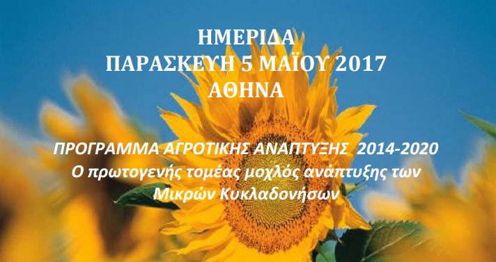Το Επιμελητήριο Κυκλάδων, υποστηρίζοντας την πρωτοβουλία του Υπουργείου Αγροτικής Ανάπτυξης σας προσκαλεί το κοινό στην Ημερίδα με θέμα: "Πρόγραμμα Αγροτικής Ανάπτυξης 2014-2020 - Ο πρωτογενής τομέας μοχλός ανάπτυξης των Μικρών Κυκλαδονήσων" που θα πραγματοποιηθεί στις 5 Μαΐου 2017 στην Αθήνα, στην Ειδική Υπηρεσία ΠΑΑ 2014-2020 (Λ. Αθηνών 58, Αίθουσα Ισογείου).