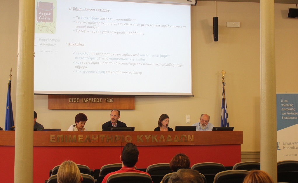 Αναφορικά με την προσπάθεια που καταβάλλει το Επιμελητήριο Κυκλάδων για τη στήριξη του πρωτογενούς τομέας και των παραγωγών του νομού, αμέσως μετά την τοποθέτηση του κ. Ρούσσου, ακολούθησε η παρουσίαση των δράσεων και των ενεργειών προώθησης και παρουσίασης των προϊόντων και του δικτύου Aegean Cuisine, καθώς και η σύντομη αναφορά στο βιβλίο “του ανέμου και της αρμύρας” με περιεχόμενό του την παραγωγή των Κυκλάδων και την γαστρονομική κουλτούρα.