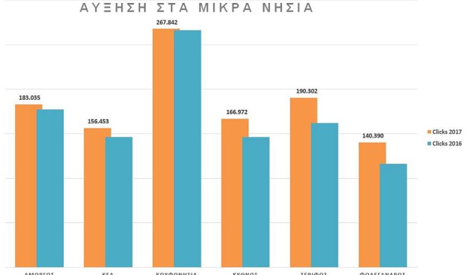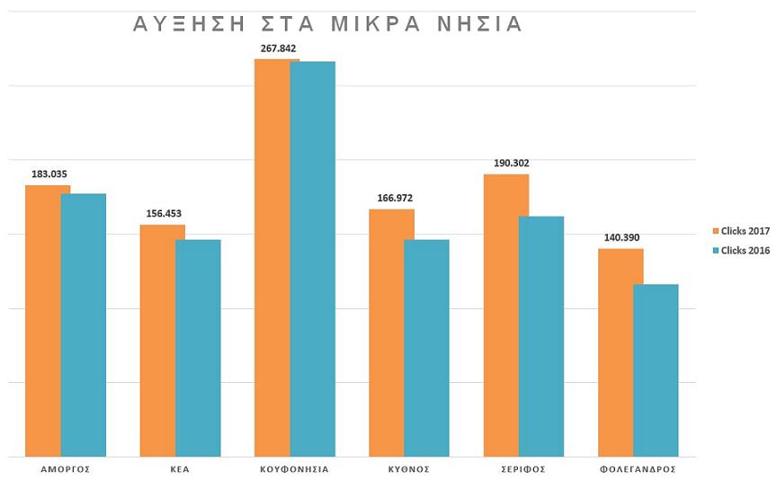 Σημαντική είναι και η επισκεψιμότητα με υψηλά νούμερα στα μικρότερα νησιά, με την πιο εντυπωσιακή άνοδο να καταγράφεται στο Κουφονήσι, έχοντας τις περισσότερες προβολές (267.000 clicks).