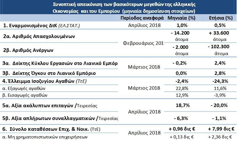Αξιοσημείωτη ετήσια άνοδο κατέγραψαν οι πωλήσεις λιανικής τον προηγούμενο Μάρτιο, με τη μηνιαία οριακή τους υποχώρηση να αποδίδεται στο πέρας των γενικών χειμερινών εκπτώσεων, ενώ η θετική τους πορεία συνεχίζεται και στη διάρκεια του Ά Τριμήνου του 2018 (ετήσια σύγκριση). Ιδιαίτερα θετικά είναι τα μηνύματα που προκύπτουν από το ισοζύγιο αγαθών, καθώς η ετήσια και μηνιαία υποχώρηση του ελλείμματος προκύπτει τόσο από την αύξηση των εξαγωγών όσο και από την παράλληλη υποχώρηση των εισαγωγών. Η ικανοποίηση της συγκεκριμένης παραμέτρου συνιστά αναγκαία συνθήκη για την αναβάθμιση των ελληνικών προϊόντων και την ενίσχυση της εγχώριας παραγωγής. Από την άλλη πλευρά, η καταγεγραμμένη στασιμότητα του ποσοστού ανεργίας των τελευταίων μηνών επιβεβαιώνεται από την ταυτόχρονη μείωση του αριθμού των απασχολουμένων.