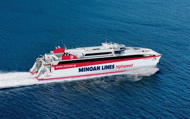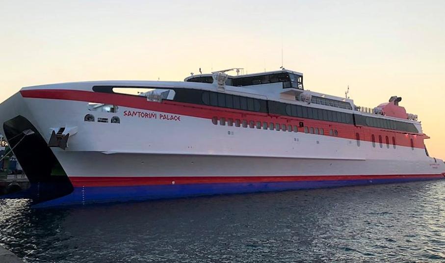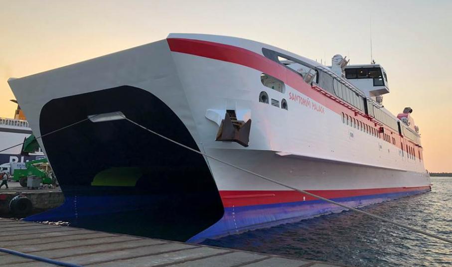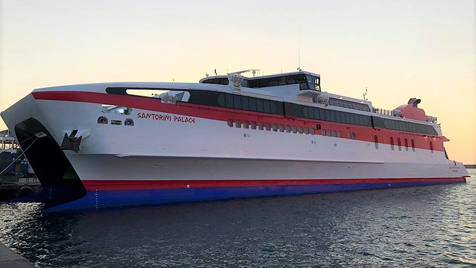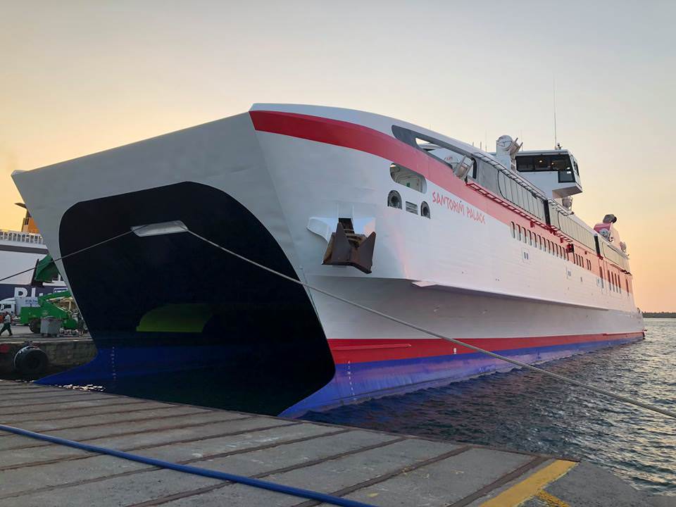 Τα σινιάλα και τα χρώματα της νέας του εταιρείας φόρεσε ήδη το μέχρι χθες Ε/Γ-Ο/Γ Ταχύπλοο Καταμαράν «Highspeed 7», το οποίο ανήκει πλέον στις «Μινωικές Γραμμές», με το όνομα «Santorini Palace».
