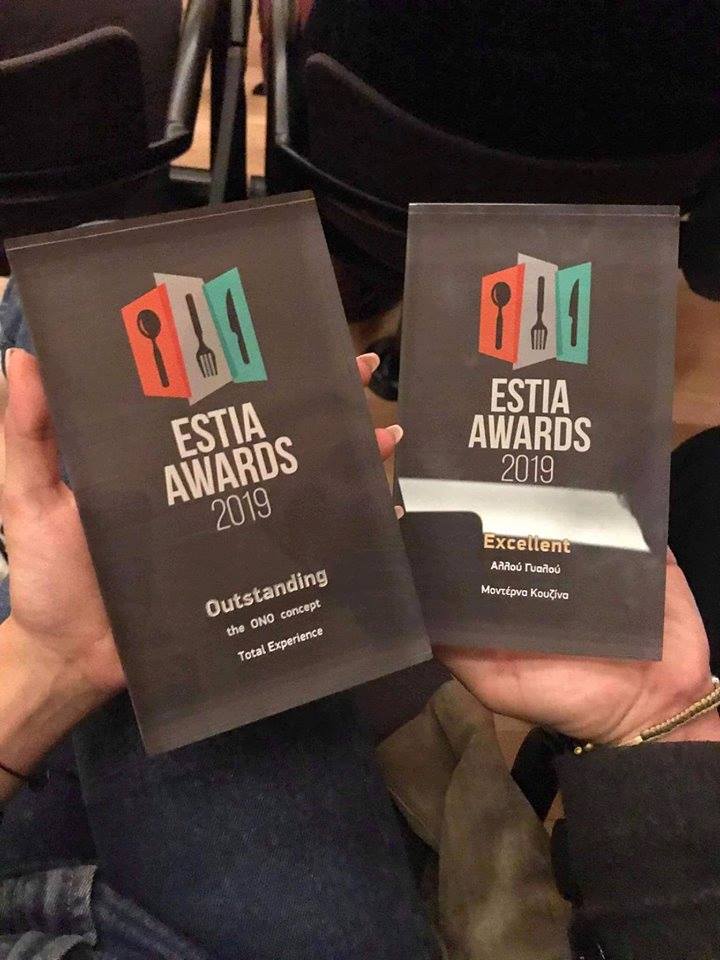Υψηλές διακρίσεις στα βραβεία Estia Awards 2019 απέσπασαν οι σπουδαίες επιχειρήσεις εστίασης της Σύρου, “Αλλού Γυαλού” και “ONO concept”, με τους ιδιοκτήτες τους (Γιάννη Λιέα και Λίνα Φουρνιστάκη) να αποδεικνύουν για ακόμη μία φορά πως, οι ουσιαστικής ποιότητας και άρτιου ύφους παροχές που προσφέρουν, ξεχωρίζουν και αποτελούν πρότυπο στον χώρο της εστίασης.