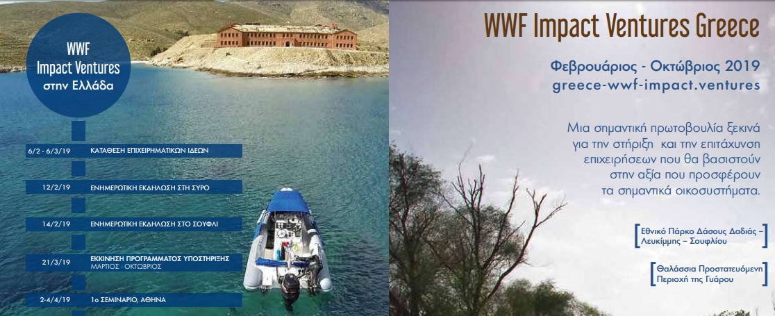 Στις 6 Φεβρουαρίου 2019 ξεκίνησε η νέα πρωτοβουλία του δικτύου της WWF, το παγκόσμιο πρόγραμμα “WWF Impact Ventures”, ένα πρόγραμμα που έχει στόχο να βοηθήσει στη δημιουργία βιώσιμων επιχειρησιακών πλάνων που μπορούν να φέρουν θετικό περιβαλλοντικό και οικονομικό αντίκτυπο σε δύο ιδιαίτερα σημαντικές περιοχές φυσικού περιβάλλοντος της Ελλάδας: στο προστατευόμενο Εθνικό Πάρκο Δάσους Δαδιάς-Λευκίμμης-Σουφλίου, και στη θαλάσσια προστατευόμενη περιοχή της Γυάρου. Για την εκπόνηση του “WWF Impact Ventures” το Επιμελητήριο Κυκλάδων απευθύνει πρόσκληση σε κάθε δημιουργικό πολίτη των Κυκλάδων με βιώσιμες επιχειρηματικές ιδέες, καθώς και σε κάθε νεοσύστατη ή υπάρχουσα επιχείρηση που μπορεί να δραστηριοποιηθεί στην ευρύτερη περιοχή των Βόρειων Κυκλάδων και επιθυμεί, να συμμετάσχει στο WWF Impact Ventures for Greece -μία πλατφόρμα επώασης επιχειρηματικών ιδεών και έναν επιταχυντή επιχειρήσεων με θετικό περιβαλλοντικό αντίκτυπο.